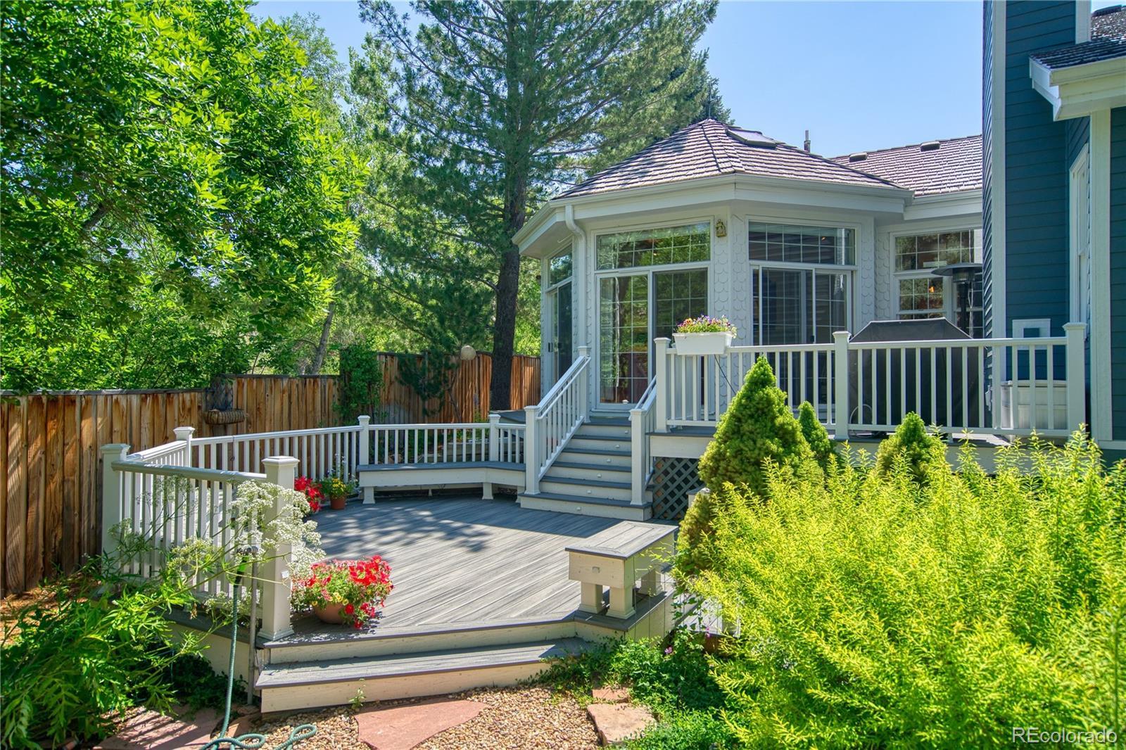 Exceptional ranch level home with a finished walk-out basement in the desirable Willows neighborhood! This light filled home features main floor vaulted ceilings, an open floor plan, custom wood-working/trim and wall accents, built in book cases, lighted display cases and is perfect for both everyday living and entertaining. The unique addition of an award winning octagon shaped family room with beautiful wood ceiling, skylights, fireplace and 4 sliding doors offers seamless outdoor connectivity to a multi-level Trex deck and a very private tree-lined back yard with lush landscaping. Remodeled kitchen with custom cabinetry, granite countertops and stainless steel appliances. The main level library/office flows into the primary bedroom suite (featuring a jetted tub and custom walk in closet) and the beautiful screened-in covered porch is a great retreat to relax enjoy your morning coffee. The finished walk-out basement has coffered ceilings, a wet-bar in lower level rec room, a crafting/flex room, bedroom and bathroom, built-in desk and bookcase areas and storage room. The Hardy fiber cement siding and DaVinci composite shake-style shingles (Class A fire rating/Class 4 hail resistance) are aesthetically pleasing while offering enhanced durability, longevity and reduced maintenance. The swimming pool, tennis courts, and playground are a short walk and are maintained by the HOA. Property is located next to the LOBO trail and creek. Check out the Matterport virtual tour!