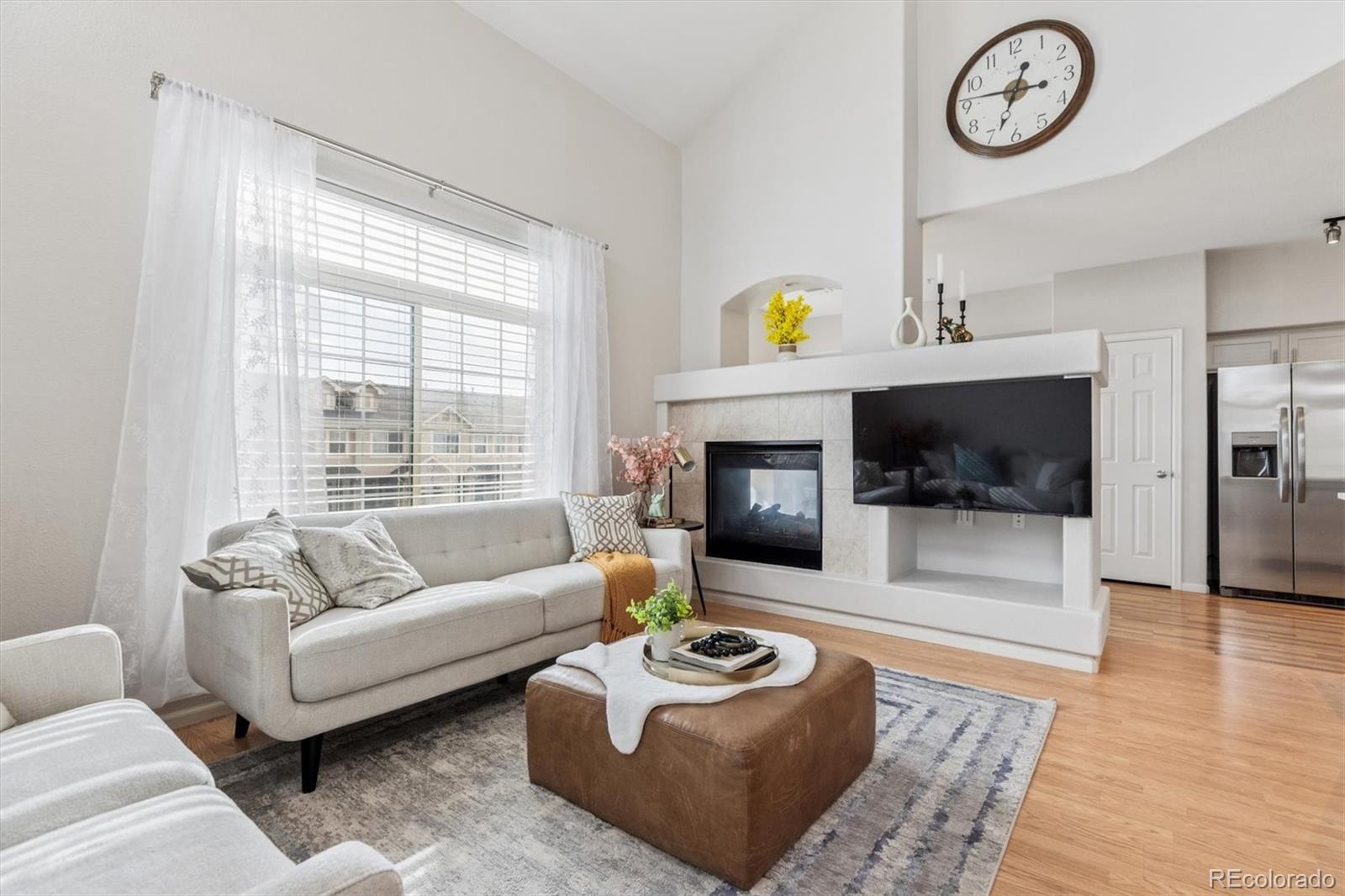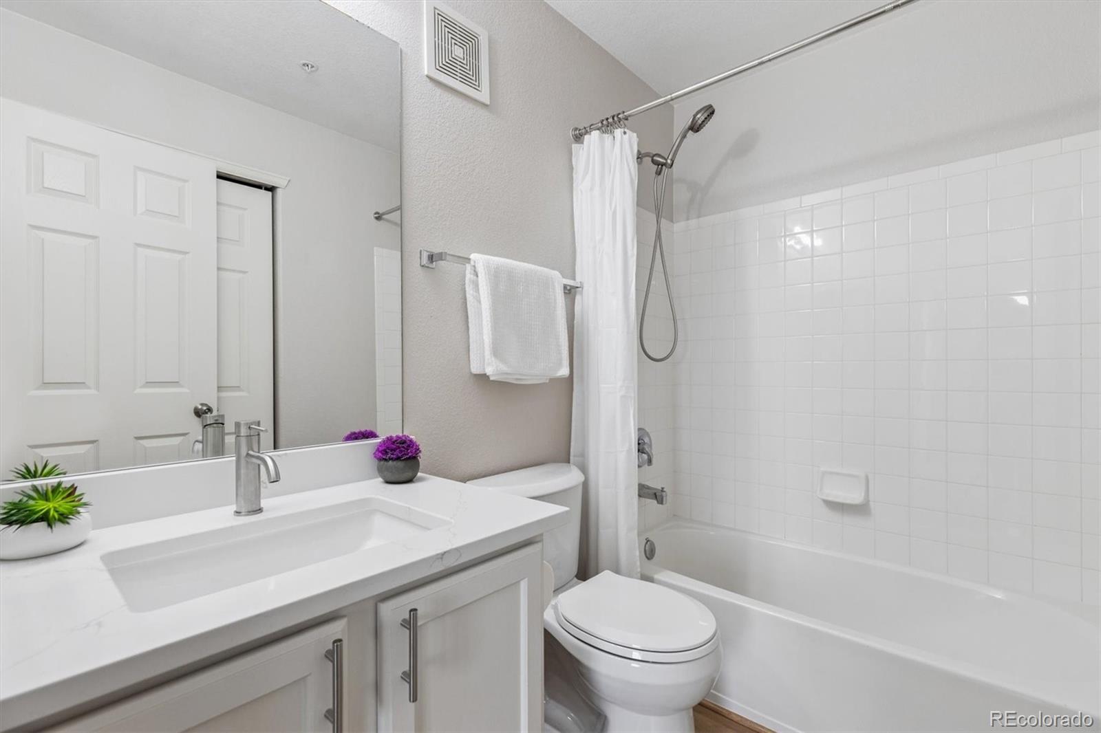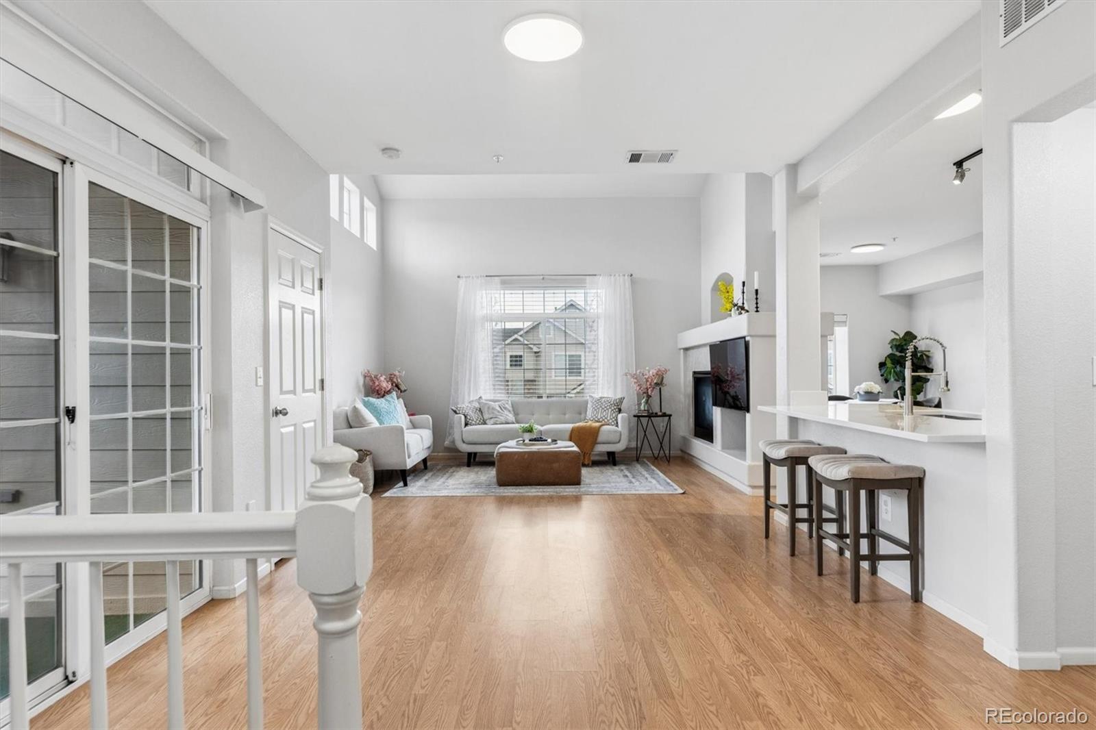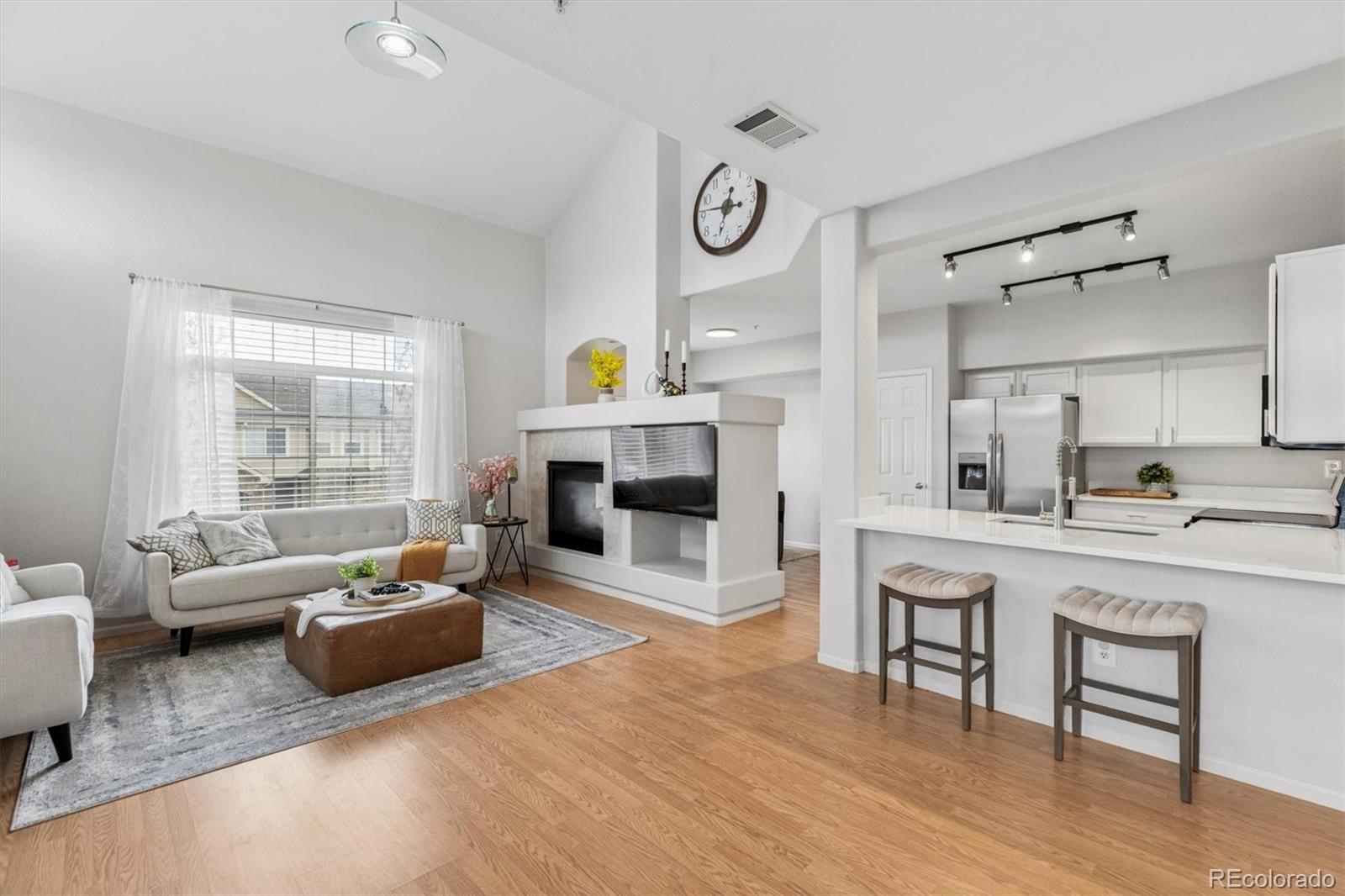 Step into this beautifully updated and meticulously kept Denver home, where modern style meets urban convenience — located within the highly sought-after Cherry Creek School District. The main level welcomes you with a bright and airy layout, featuring a gourmet kitchen complete with new quartz countertops, brand-new stainless-steel appliances, and freshly painted cabinets. The expansive living room impresses with soaring vaulted ceilings, a cozy fireplace, and walls of windows that flood the space with natural light, flowing seamlessly into the dining area. Practicality is built-in with a neatly tucked-away laundry room and a functional guest half-bath. Upstairs, you’ll find two spacious primary suites, each offering private en-suite baths — ideal for guests, roommates, or multi-generational living. The main primary retreat features a generous walk-in closet and a refreshed en-suite bath with dual vanities, while the second suite includes its own full bath with quartz countertops and bright, inviting finishes. Enjoy your morning coffee on the covered patio or take advantage of the rare parking combination of a detached garage (#26) and an assigned parking spot (#79). Perfectly located just minutes from grocery stores, entertainment, and all that Denver has to offer, this move-in-ready gem is not to be missed!