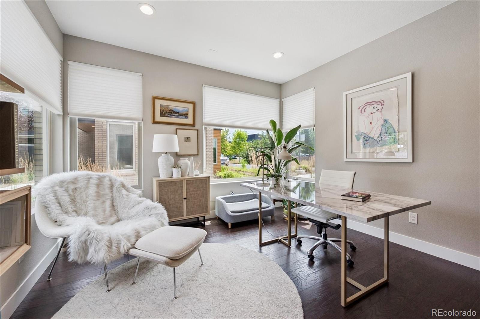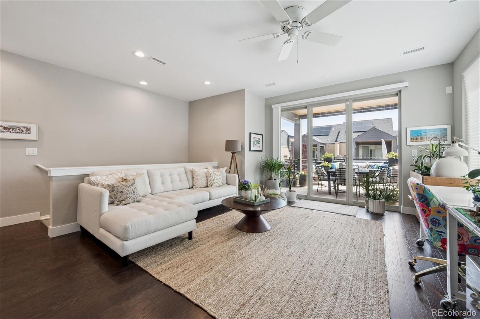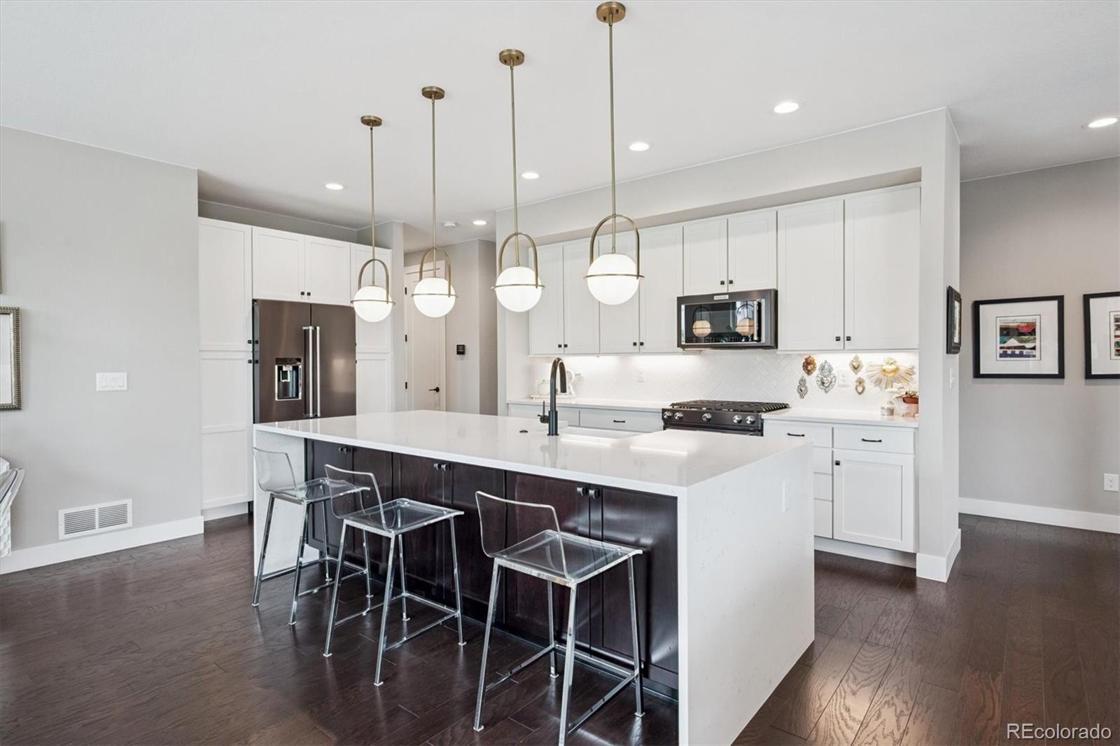 Exquisite town home in the highly sought-after Boulevard One community! Boasting a stunning open floor plan and spacious chef's kitchen. Featuring sleek black stainless steel appliances and an impressive kitchen island with a striking quartz waterfall edge. Step into the light and bright living area and the main floor study, graced by a double-sided fireplace. Retreat to the luxurious main floor primary suite, complete with a spa-like bath that includes a large shower, double sinks, and exquisite fixtures. The elegance is further enhanced by hardwood floors that flow seamlessly through the main and upper levels. Uncommon for its kind, this home also features an additional primary bedroom on the upper level, adorned with vaulted ceilings and a private bath for ultimate comfort. The fully finished basement, one of the largest in the community, is an entertainment haven, showcasing a vast media room.. A spacious bedroom also serves as a versatile home gym, a storage room with a utility sink and shelving ensures you’ll have space for all your essentials. Two convenient laundry rooms add to the ease of daily living, and you'll appreciate the financial benefits of owning solar panels outright—not leased. With two HVAC systems ensuring optimal comfort across the main and upper levels, along with Hunter Douglas blinds.. The two-car attached garage is finished with epoxy flooring and features ample storage options. This home is like brand new; it’s never been lived in. Situated just steps away from all the excitement and convenience that Boulevard One offers—including Clark’s, Denver Beer Company, Target, and the vibrant Lowry Town Center, home to the beloved Lowry Beer Garden, Cafe Mercato, North County, and The Officer's Club. Don’t let it slip away!