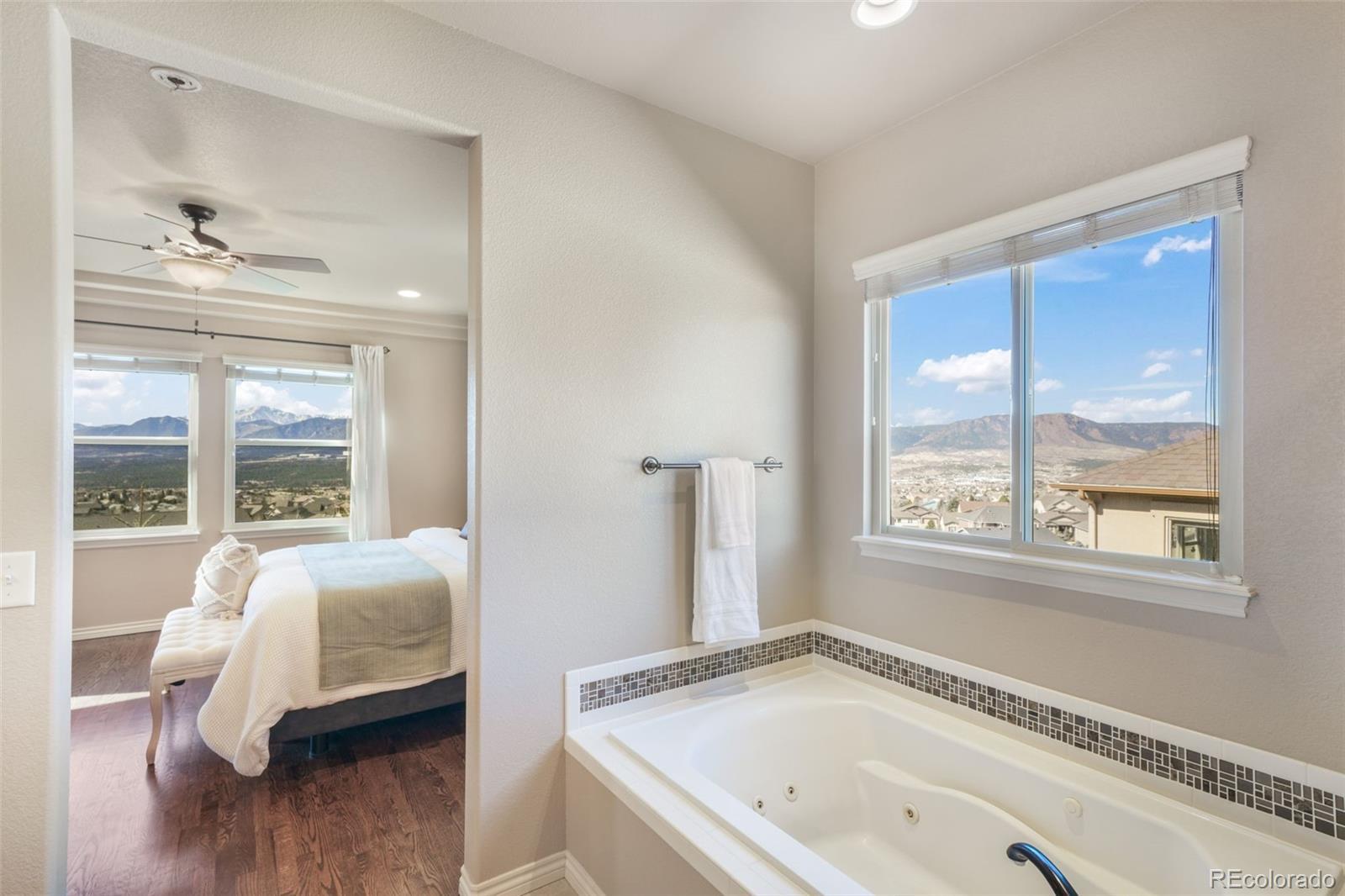 This beautifully maintained ranch style home in Promontory Pointe offers stellar curb appeal, a finished walkout basement and a rare 4 car attached garage. You will be blow away by the jaw dropping panoramic mountain views from both the main level and the basement. From the moment you step inside, the hardwood floors that span the entry, living room, and kitchen set a warm, inviting tone. Just off the foyer, a private office with French doors creates the perfect work from home space. A secondary bedroom with a walk in closet and a nearby full bath offer comfort and flexibility for guests. The heart of the home is positioned to capture remarkable panoramic mountain and Pikes Peak views. The dining room, spacious living room with gas fireplace, and well appointed kitchen all showcase the views. The kitchen features double ovens, a gas range, stone counters, a large island, and a pantry, designed for both everyday living and entertaining. Step directly onto the covered composite deck from the kitchen and dining area to take in the unobstructed Colorado backdrop. The primary suite is a true sanctuary with incredible views, a five piece bath, and a generous walk in closet. A huge laundry and mudroom adds everyday functionality. The finished walkout basement expands the living space with a large family room, wet bar, and rec area ideal for game nights or gatherings. Three additional bedrooms provide flexibility, including a junior suite with its own adjoining bath, plus a separate hallway bathroom. Storage is plentiful throughout. With new carpet in 2026 and meticulous care throughout, this home is truly move in ready. The yard is fenced as well as beautifully landscaped. Promontory Pointe residents enjoy minimal HOA dues, convenient access to I 25, shopping, dining, and trails, while still savoring the peaceful setting and stunning views Monument is known for. This is Colorado living at its finest all within the highly regarded Lewis Palmer District 38. Welcome home!