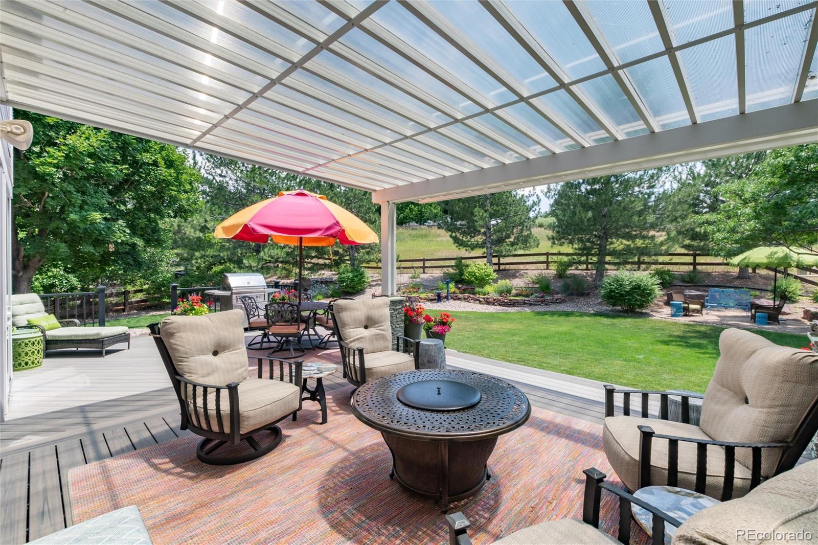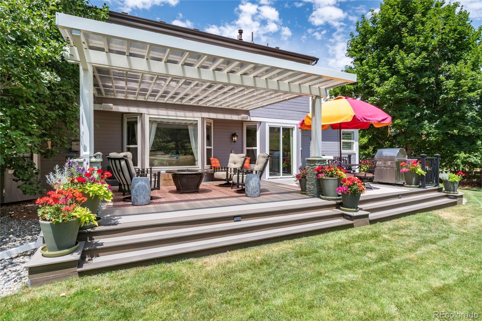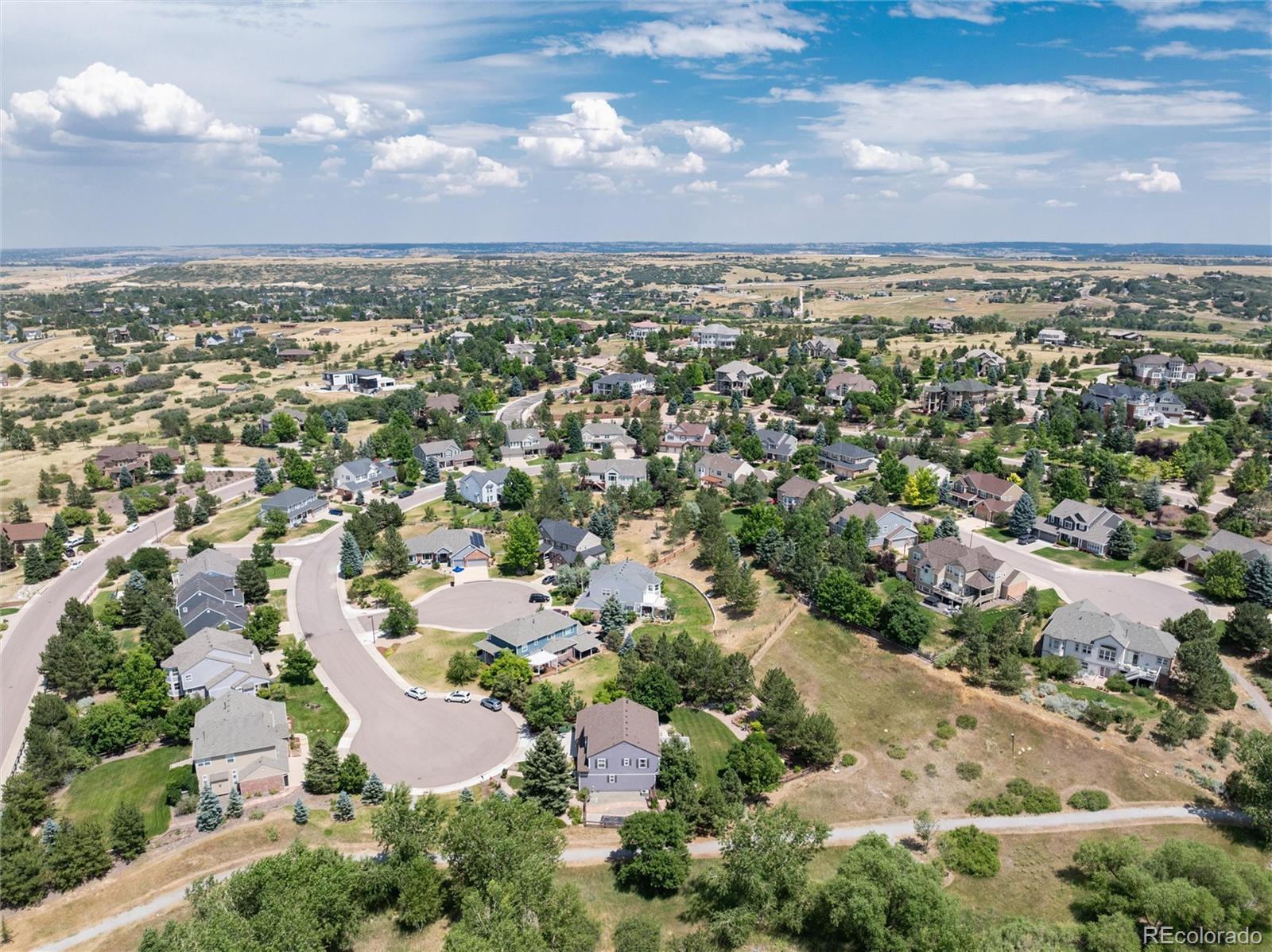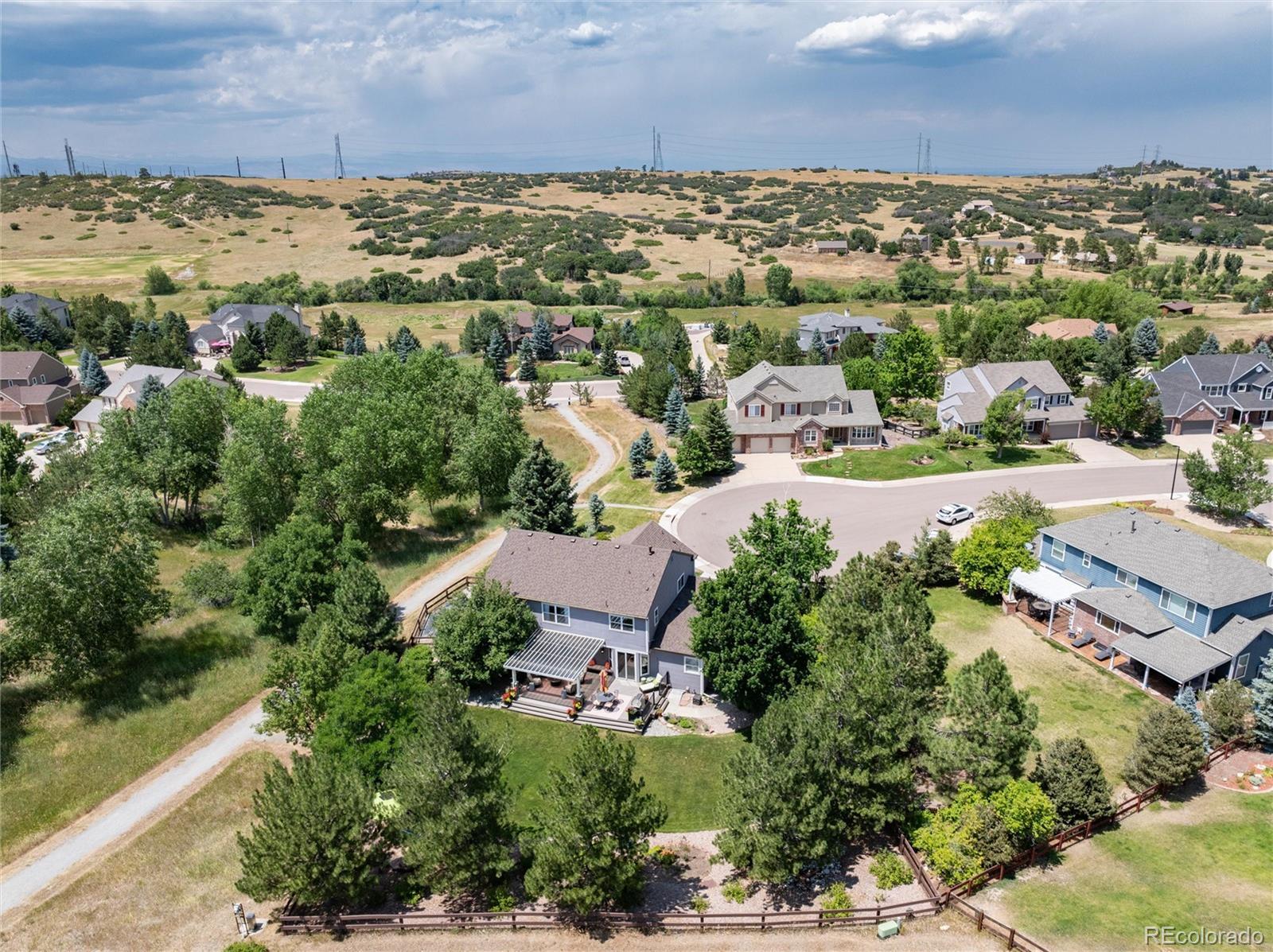 Welcome home to one of the most coveted locations in Hidden Pointe in Castle Pines North, nestled at the end of cul-de-sac with open space on 3 sides providing nature’s beauty, privacy, peace & tranquility. Indoor/outdoor living at its finest. A beautiful spacious private yard surrounded by lush trees and garden areas filled with perennials. Enter and you are greeted by an open light & bright floor plan where classic elegance meets Colorado living with designer finishes throughout: gleaming hardwood floors adorn the main floor, 3 gas fireplaces, custom double-layer woven blinds, plantation shutters and more. The welcoming entry with grand cathedral ceiling adjoins the inviting living room & formal dining. Kitchen features high-end stainless steel appliances, granite counters, hand-blown Italian pendants & spacious walk-in pantry. Sun-drenched family room flows seamlessly to expansive Trex deck, fabulous for entertaining all your friends and family with its covered pergola. Upstairs relax in the sunny southern facing master suite with cozy fireplace, luxurious spa-like bath with heated floors, slipper tub, shower with seamless glass surround & expansive primary closet. The ensuite guest room and 2 bedrooms with jack and jill bath compete the upper level. Retreat to basement with bonus room including fireplace & bar fridge, additional workspace room, and 5th private bedroom & full bath. Castle Pines North & Hidden Pointe boasts great amenities within walking distance including parks (Coyote Ridge),hiking & biking trails (including East/West trail), pickleball and basketball courts and more. Easy drive to I-25, shops & restaurants. Information provided herein is from sources deemed reliable but not guaranteed and is provided without the intention that any buyer rely upon it. Listing Broker takes no responsibility for its accuracy and all information must be independently verified by buyers.