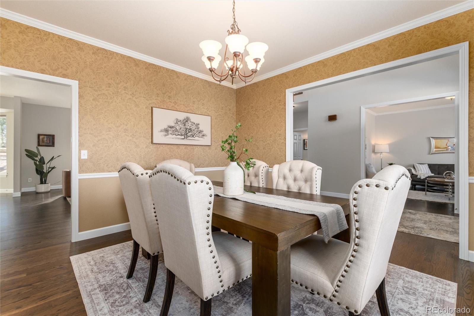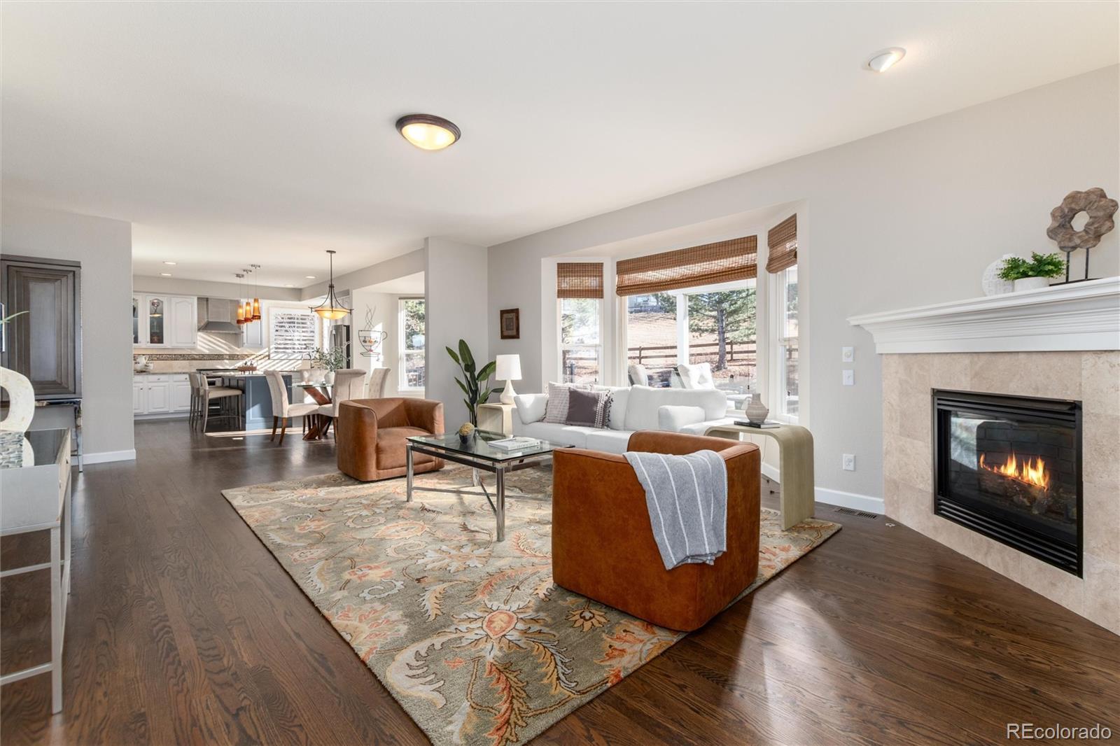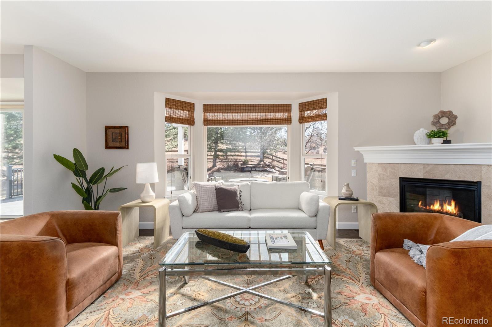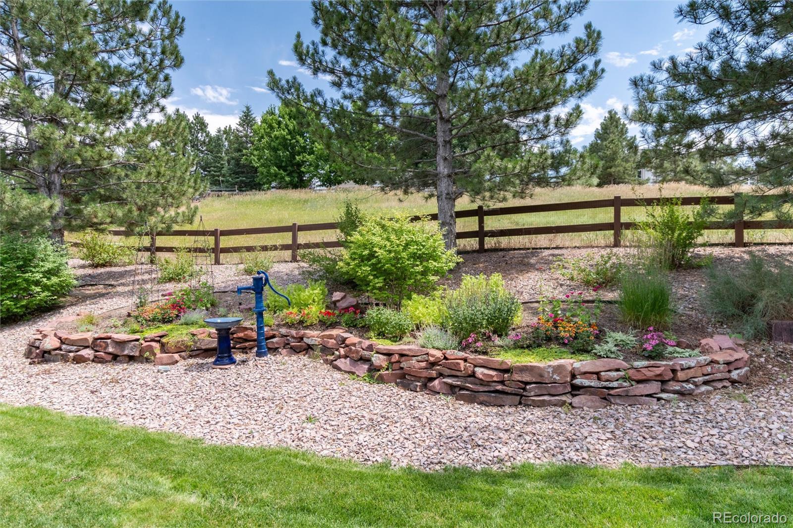 Welcome home to one of the most coveted locations in Hidden Pointe in Castle Pines North, nestled at the end of cul-de-sac with open space on 3 sides providing nature’s beauty, privacy, peace & tranquility. Indoor/outdoor living at its finest. A beautiful spacious private yard surrounded by lush trees and garden areas filled with perennials. Enter and you are greeted by an open light & bright floor plan where classic elegance meets Colorado living with designer finishes throughout: gleaming hardwood floors adorn the main floor, 3 gas fireplaces, custom double-layer woven blinds, plantation shutters and more. The welcoming entry with grand cathedral ceiling adjoins the inviting living room & formal dining. Kitchen features high-end stainless steel appliances, granite counters, hand-blown Italian pendants & spacious walk-in pantry. Sun-drenched family room flows seamlessly to expansive Trex deck, fabulous for entertaining all your friends and family with its covered pergola. Upstairs relax in the sunny southern facing master suite with cozy fireplace, luxurious spa-like bath with heated floors, slipper tub, shower with seamless glass surround & expansive primary closet. The ensuite guest room and 2 bedrooms with jack and jill bath compete the upper level. Retreat to basement with bonus room including fireplace & bar fridge, additional workspace room, and 5th private bedroom & full bath. Castle Pines North & Hidden Pointe boasts great amenities within walking distance including parks (Coyote Ridge),hiking & biking trails (including East/West trail), pickleball and basketball courts and more. Easy drive to I-25, shops & restaurants. Information provided herein is from sources deemed reliable but not guaranteed and is provided without the intention that any buyer rely upon it. Listing Broker takes no responsibility for its accuracy and all information must be independently verified by buyers.