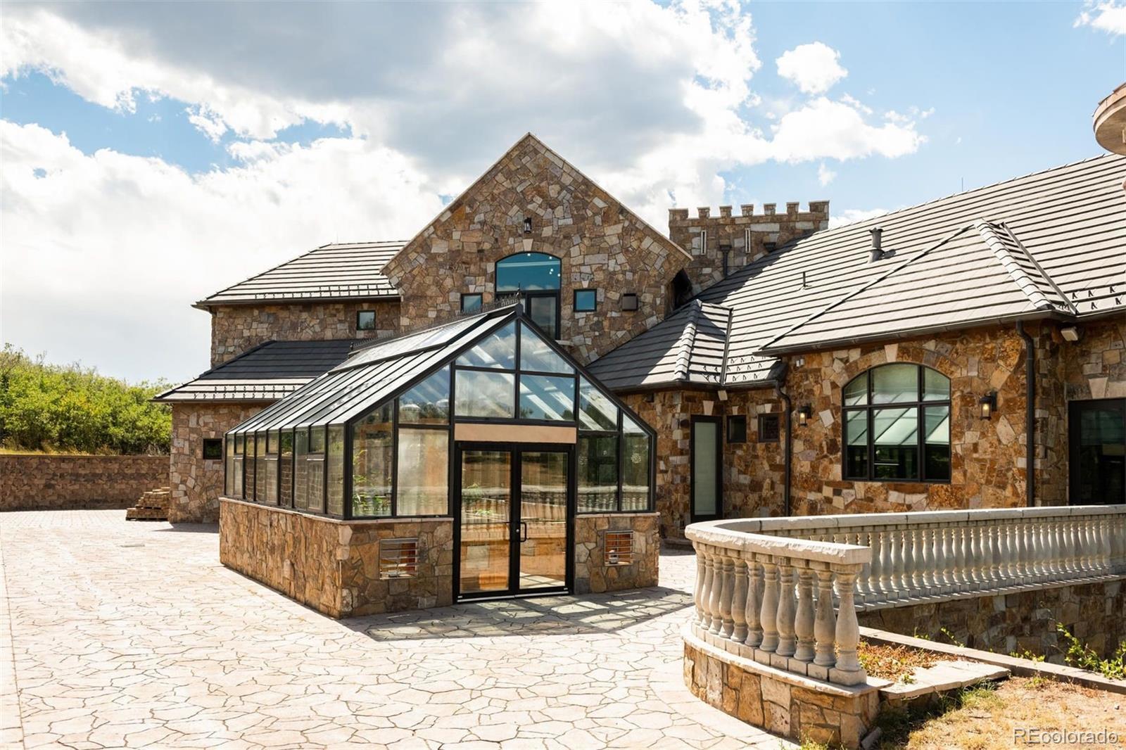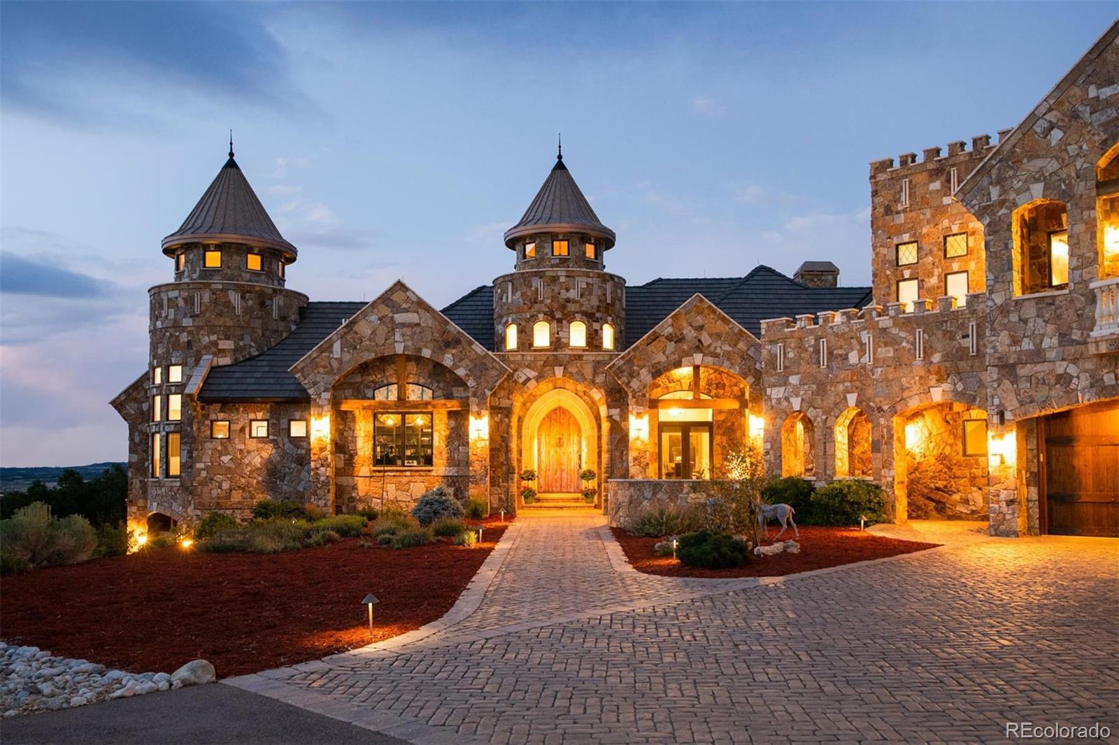 TRULY A CASTLE, set on 15+ acres in the exclusive gated community of Bear's Den in Sedalia. Gothic inspired and completed in 2012 with tons of Oklahoma Red Granite inside & out and topped with three steel turrets capped with copper-like metal. The main level features include countless design details such as a one-of-a kind foyer with the first of three towering turrets, a custom made grand fireplace, an open dining room with a barrel-shaped brick ceiling, and a kitchen fit for a king, plus the second turret capping the breakfast nook, accented by walnut flooring, custom handmade solid walnut doors, various unique lighting and plumbing fixtures and several countertops made with railroad car floors. The private upper level is versatile enough to be a caretaker’s suite or a den/cigar room complete with an en-suite and two balconies. The main floor master chamber marries stunning wooden ceiling and fixture details with stone-walled backdrops and a curved hall to the master bath sided by his and her closets. The third turret shines light on to the bath suite below. A second cozy guest en-suite is located on the main level with private entrance and corner fireplace. The grand circular stairway in the foyer is one of two means to get to the walk-out lower level, featuring a theater room, a game room, a full kitchen wet bar, a chic, Parisian inspired en-suite similar to that in a boutique hotel inclusive of a fireplace and private entrance. The lower level also includes a walk-out fitness room with private bath (or the homes' 5th bedroom). Mechanically, this masterpiece has all the modern conveniences, and then some including geo-thermal & radiant heat, A/C, instant hot water, a fresh air circulation system and surround sound inside and out. The outdoor living spaces live up to the Castle's stately commands with stunning mountain views, a greenhouse, heated pavers, a 2nd attached "toy" garage, three patios with fire features, plus a pond.