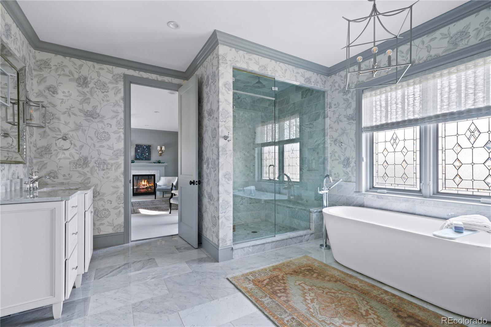 Completely remodeled well-known luxury designer. Sophisticated finishes throughout include stunning custom kitchen cabinetry, lighting, carpeting, wallpaper and window treatments. State-of-the Art appliances includes 2 kitchen dishwashers, 2 kitchen refrigerators, Miele coffee machine and additional basement refrigerator, ice maker, and wine cooler, New custom office doors, new trim throughout, new golf simulator and insulated epoxy-finished garage floor. Exterior includes new landscaping with front brick wall and iron fence. Inviting pool with fountains and endless swim jets, spa/hot tub, new pool covers. New transferrable Solar Panel system, $253.49 lease per month Must see to appreciate quality craftsmanship and impeccable design. Showing by appointment only.