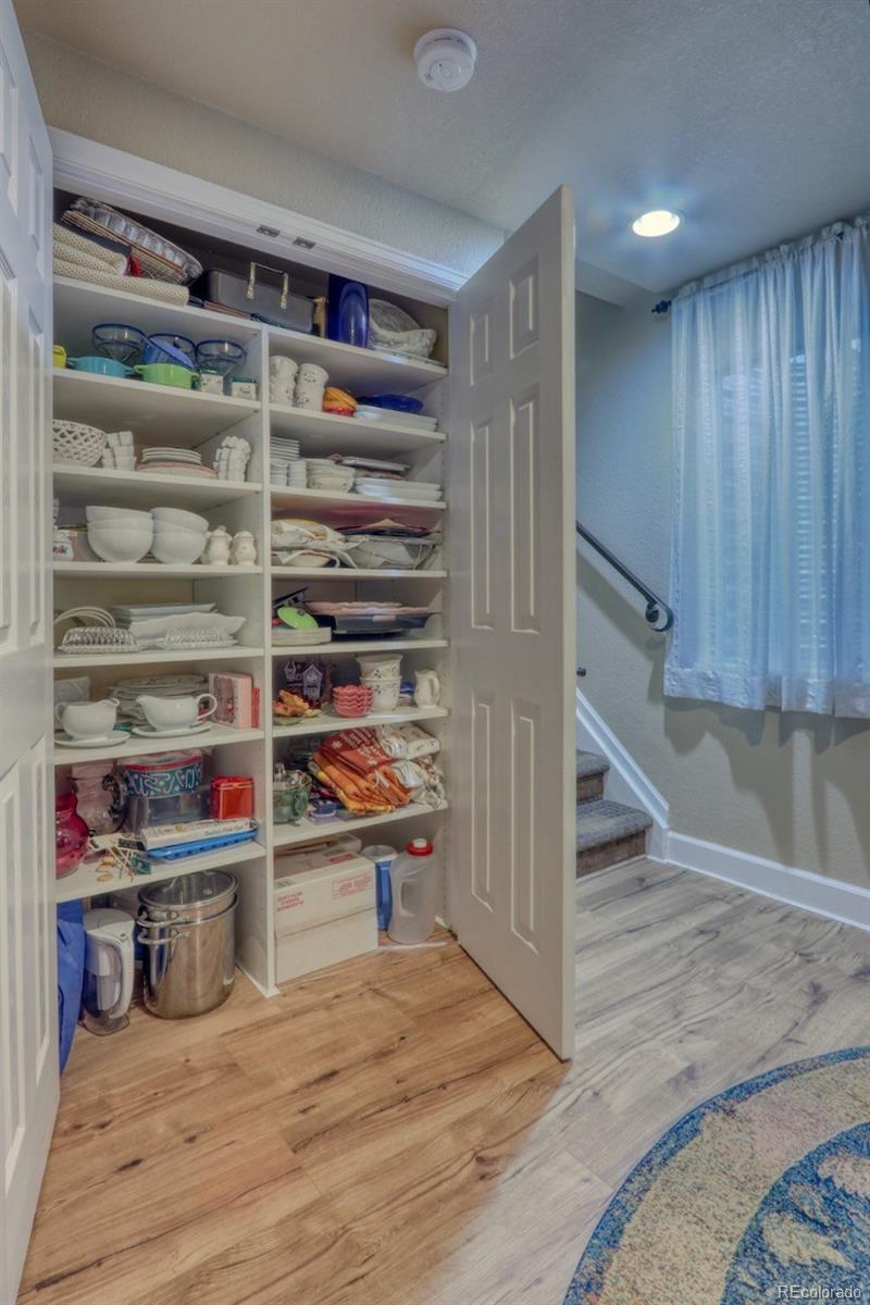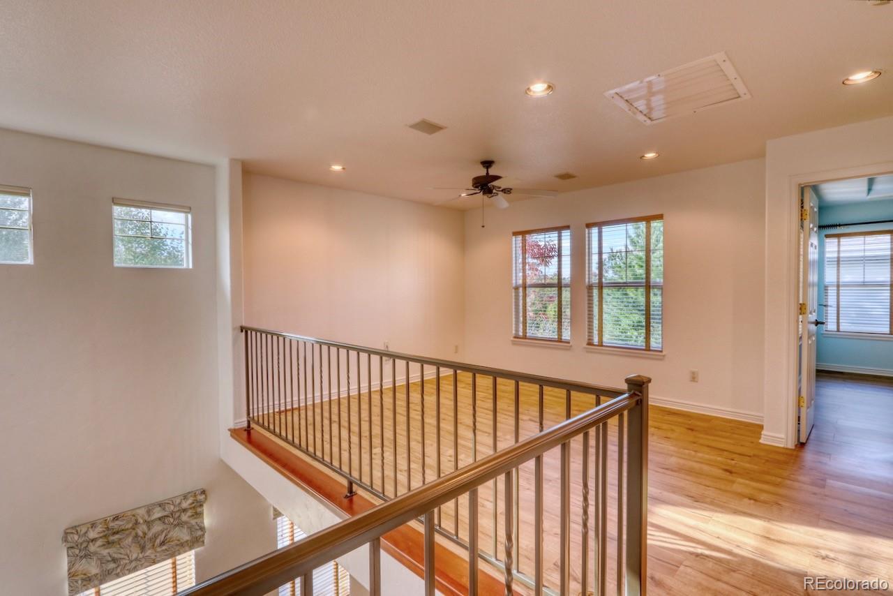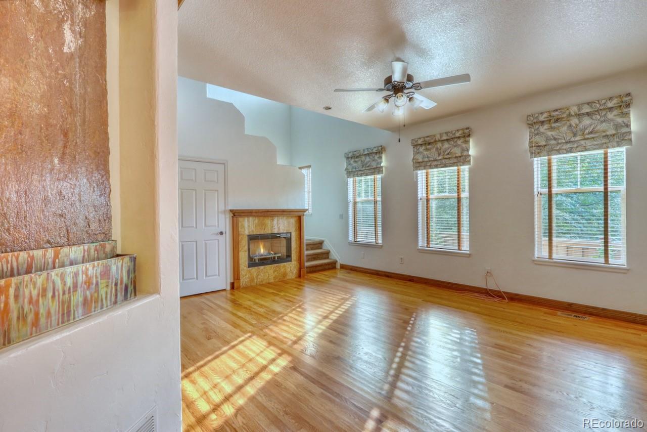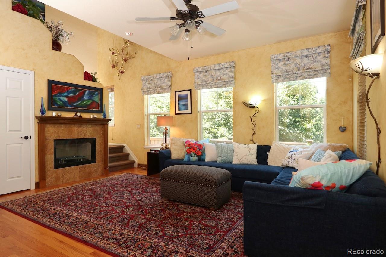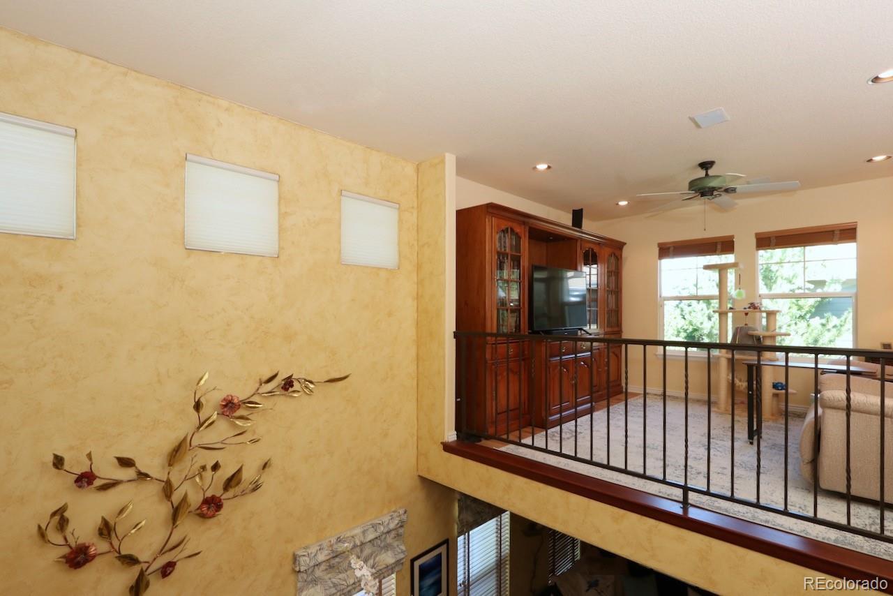 This home rises above the rest, with outstanding upgrades plus additional luxury touches! Impeccably maintained by the original owner. Lovely xeriscaped front & back yards featuring flagstone patios and a gorgeous blue spruce. Elegant Venetian plaster entryway. Kitchen has an eat-in space and features granite counters, glass tile backsplash, hickory cabinets, stainless appliances (the gas stove is a bonus!), a center island and a tech desk. The kitchen and formal dining room share a pass-through bar and are enhanced by delicate tulip-shaped Italian blown glass light fixtures. The art niche holds a unique cascading water-over-slate sculpture. Classic hardwood floors on the main level. New white paint on the main level and loft area. The fireplace is centered under a soaring ceiling, with a petite custom mantle, granite tile and glass rocks. The upper floor and bsmt have easy-maintenance wood-based laminate floors. The loft is open & airy and can be used as a movie room or primary retreat. The primary bedroom has two walk-in closets (one with customized finishes) and the primary bathroom is a dream, featuring a linen closet, enclosed shower and heated jetted tub w/ custom nozzles, and a programmable heated floor to delight your feet on those cold winter mornings! Also on the upper floor are two additional bedrooms which share a full hallway bathroom and plenty of storage cabinets. The fully finished basement has two separate rooms which can be used as an exercise room and a home office, or use the office as a 4th bedroom as it has two closets, an egress window and a bench seat w/ handy storage space. Plus there is a clean & usable crawl space for those "out-of-the-way" items. The enclosed laundry room is the nicest you will find, featuring front-loading pedestal washer & dryer, a sink, and loads of counter space and cabinets! Dues include four fantastic rec centers. Nearby Spearwood Park, playground, open space & extensive trail system! It's the one!!