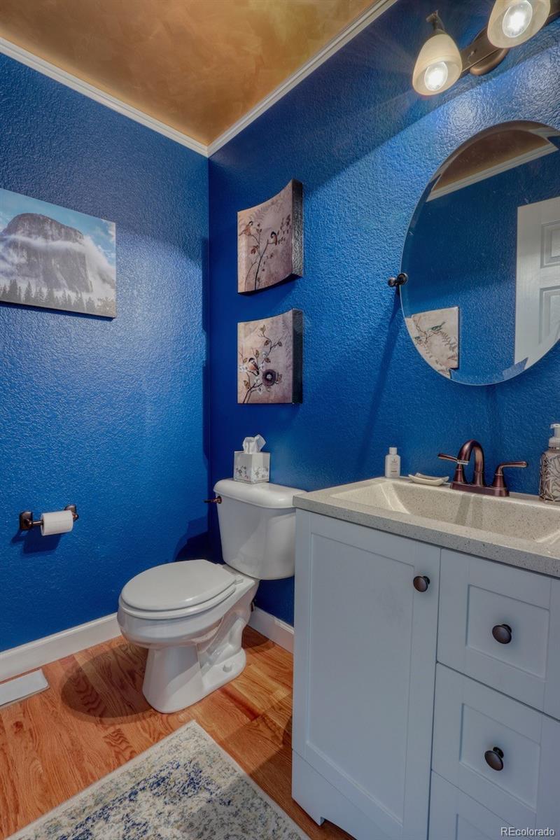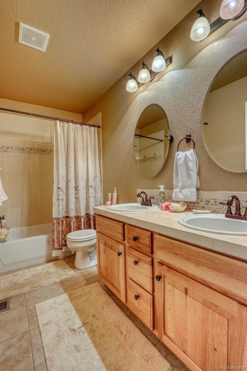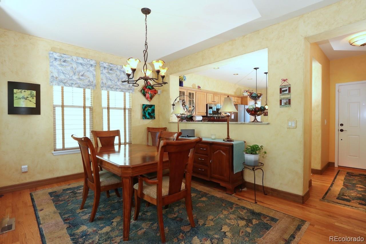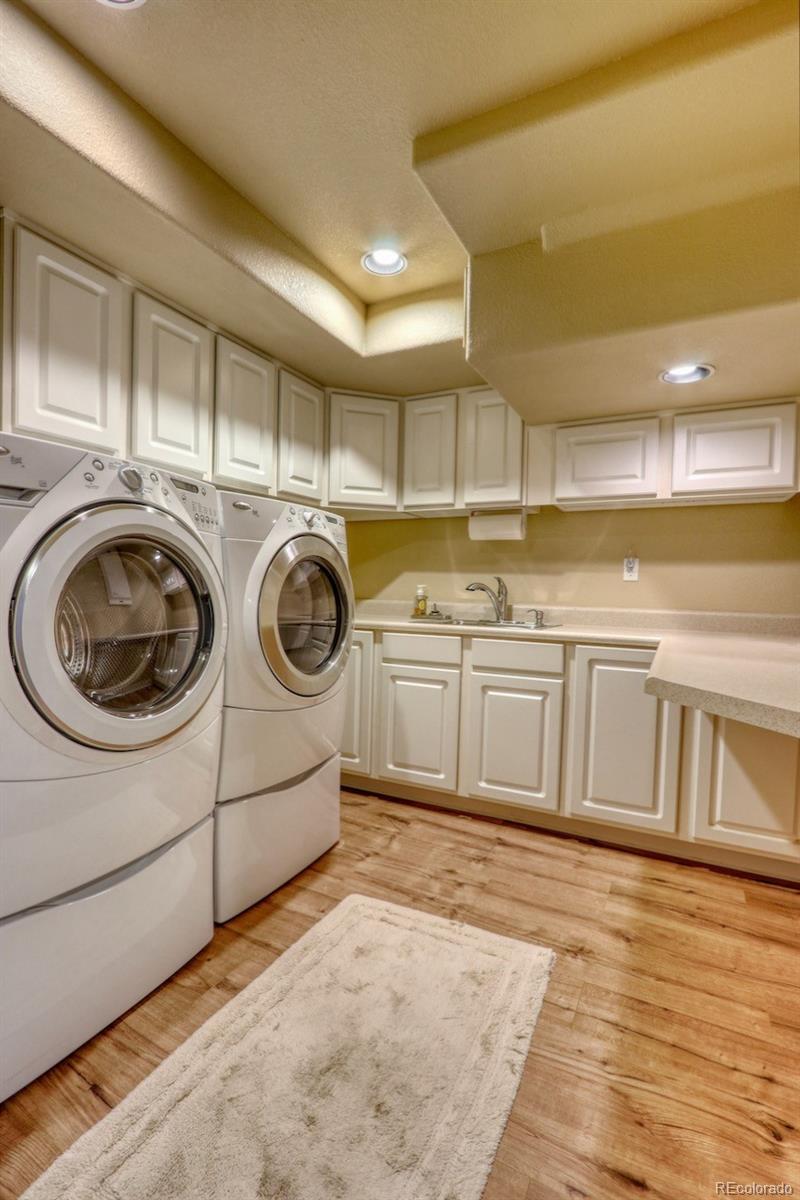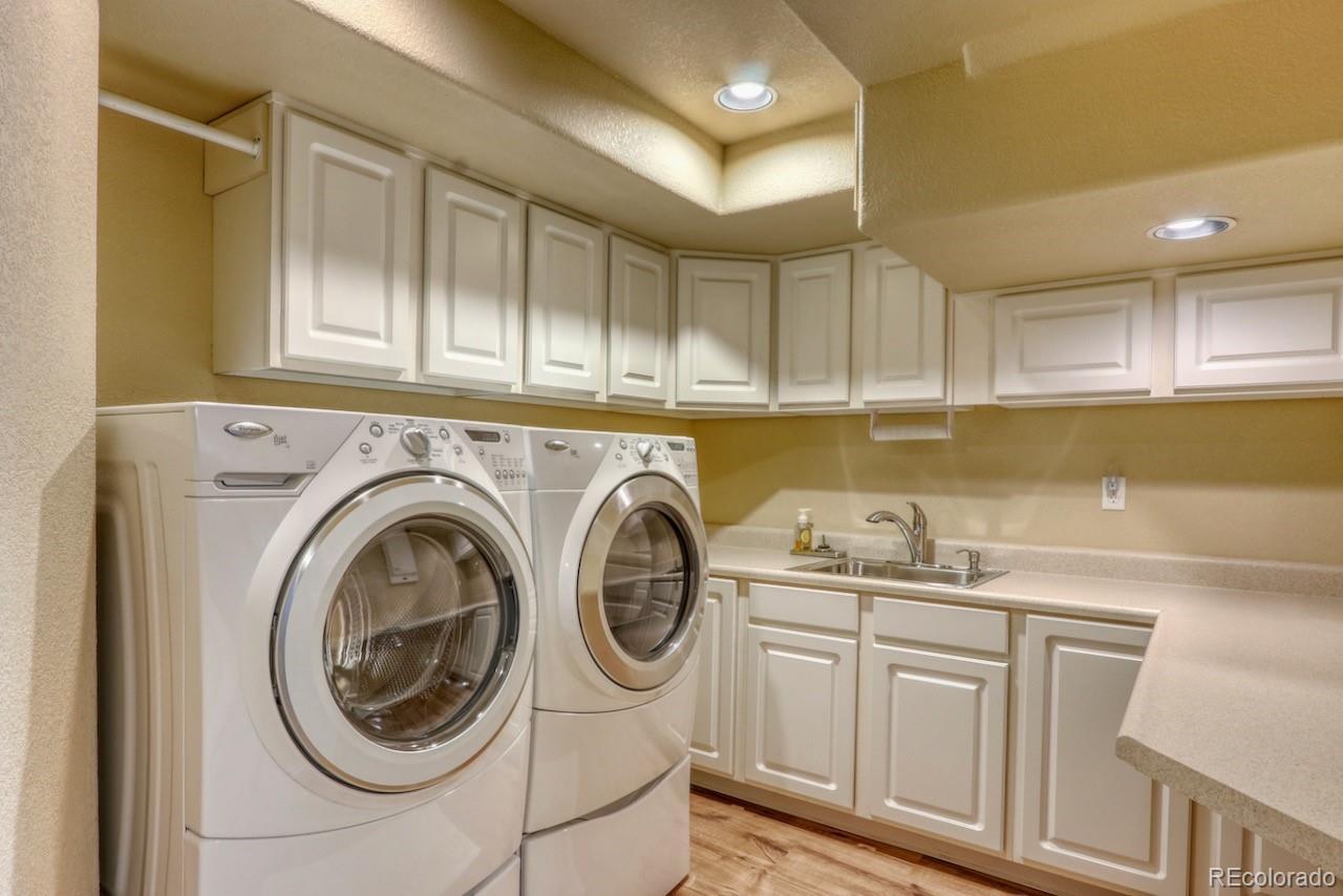 This home rises above the rest, with outstanding upgrades plus additional luxury touches! Impeccably maintained by the original owner. Lovely xeriscaped front & back yards featuring flagstone patios and a gorgeous blue spruce. Elegant Venetian plaster entryway. Kitchen has an eat-in space and features granite counters, glass tile backsplash, hickory cabinets, stainless appliances (the gas stove is a bonus!), a center island and a tech desk. The kitchen and formal dining room share a pass-through bar and are enhanced by delicate tulip-shaped Italian blown glass light fixtures. The art niche holds a unique cascading water-over-slate sculpture. Classic hardwood floors on the main level. New white paint on the main level and loft area. The fireplace is centered under a soaring ceiling, with a petite custom mantle, granite tile and glass rocks. The upper floor and bsmt have easy-maintenance wood-based laminate floors. The loft is open & airy and can be used as a movie room or primary retreat. The primary bedroom has two walk-in closets (one with customized finishes) and the primary bathroom is a dream, featuring a linen closet, enclosed shower and heated jetted tub w/ custom nozzles, and a programmable heated floor to delight your feet on those cold winter mornings! Also on the upper floor are two additional bedrooms which share a full hallway bathroom and plenty of storage cabinets. The fully finished basement has two separate rooms which can be used as an exercise room and a home office, or use the office as a 4th bedroom as it has two closets, an egress window and a bench seat w/ handy storage space. Plus there is a clean & usable crawl space for those "out-of-the-way" items. The enclosed laundry room is the nicest you will find, featuring front-loading pedestal washer & dryer, a sink, and loads of counter space and cabinets! Dues include four fantastic rec centers. Nearby Spearwood Park, playground, open space & extensive trail system! It's the one!!