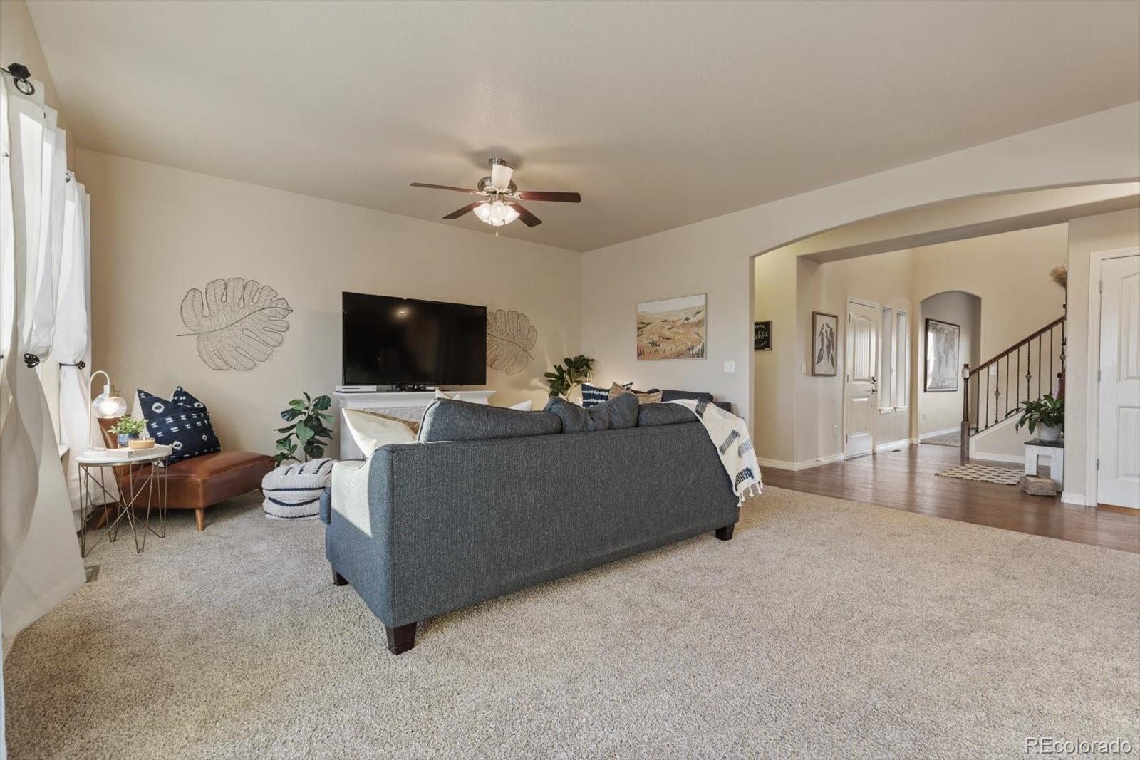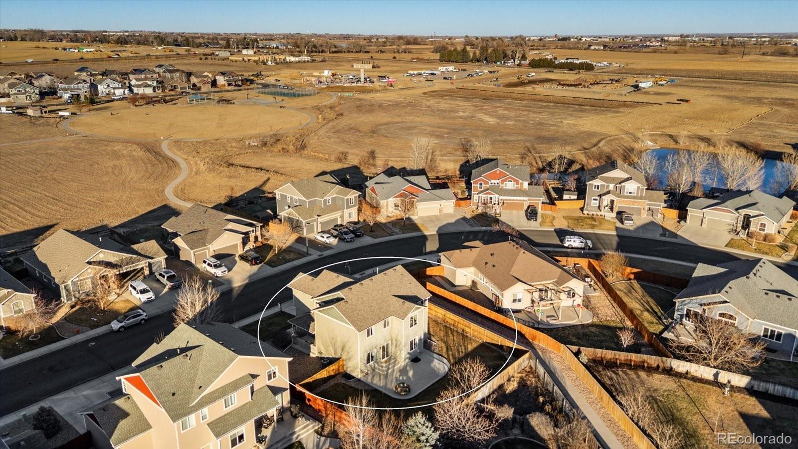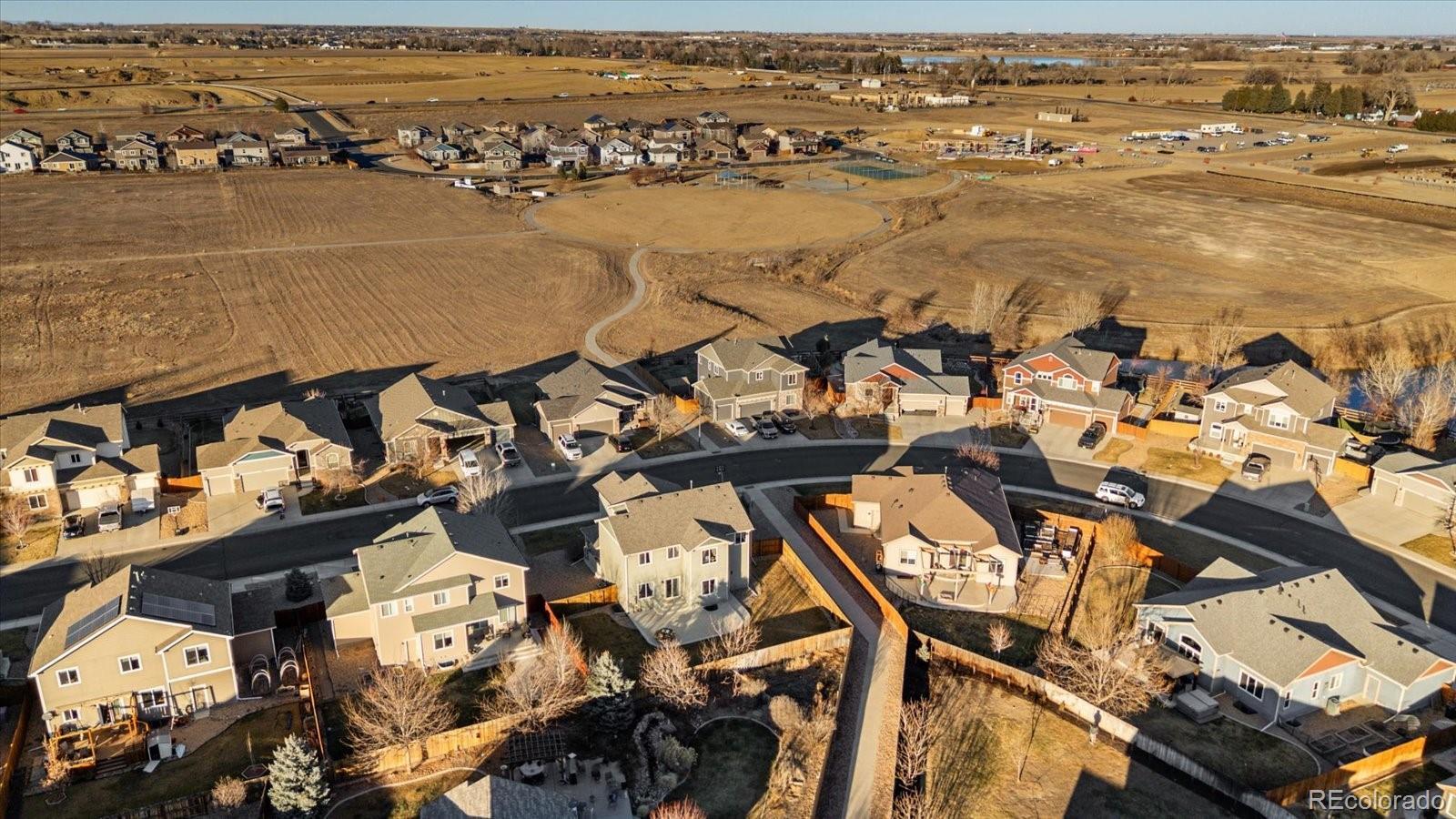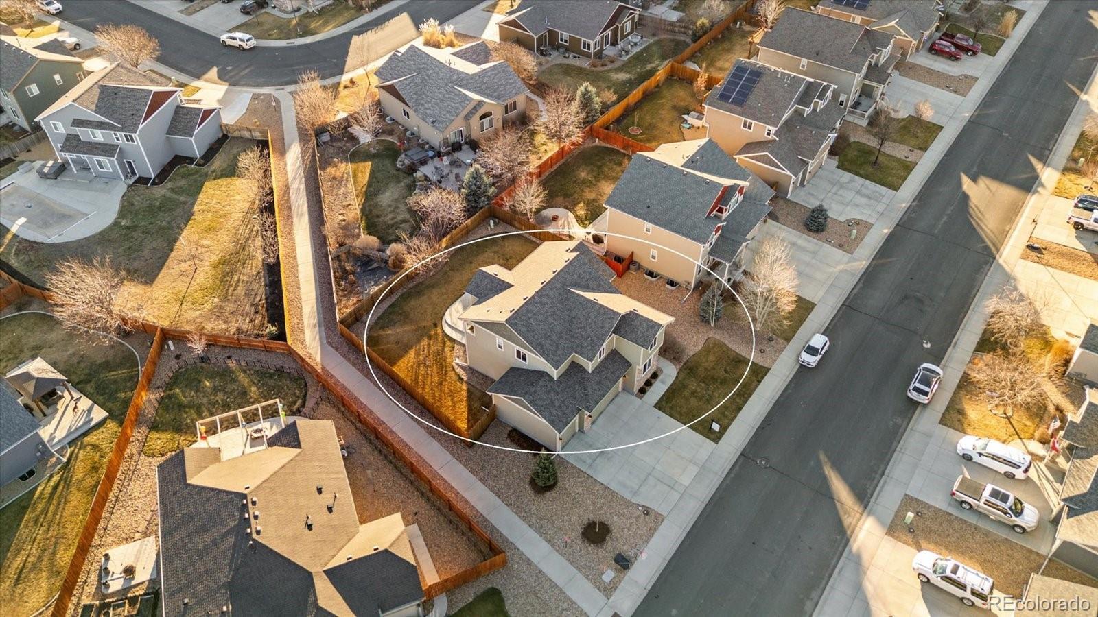 Incredibly beautiful home in Liberty Ranch with 4-car garage, park access across street and huge primary retreat! Brand new FURNACE! Roof is only 2 years old! This is not your typical builder grade home! Beautiful dormers, full rugged stone elevation, shaker siding, bump outs and corbels create stunning curb appeal! Large covered front porch greets you with 2-story entry along with stunning hewn style wood floors. Study on the main is a great work from home option with powder bath around the corner. Granite countertops, stainless appliances, pantry, tons of counter space and bar seating make this kitchen perfect for gourmet cooking and fun family gatherings. Extra lighting package to keep it light and bright! Large dining room area with more natural light and views to the backyard make entertaining a breeze! Huge custom patio in backyard is a perfect for summer BBQ's or relaxing family and friends time. Beautiful staircase with upgraded railing is a stunning first impression! Four large bedrooms upstairs keep everyone together, and small loft area for reading nook or business station is also a plus including a large full secondary bath with dual sinks and upgraded tile package. Upstairs Laundry! The primary bedroom, though!!! This is a huge retreat for sure! Seating area, dual sided fireplace and large primary bath with soaker tub allow for quiet peaceful evenings in your own space. Dual sinks, upgraded tile package in walk-in shower and large walk-in closet add to this amazing retreat! Garage is HUGE with an extra large built in storage shelf over tandem bay. Don't forget a full unfinished basement for storage or ready for expansion with rough in already in place! sidewalk to park with tennis and basketball court, playground, ballfield and new bathrooms coming! This home is a great location only a couple minutes to I-25!