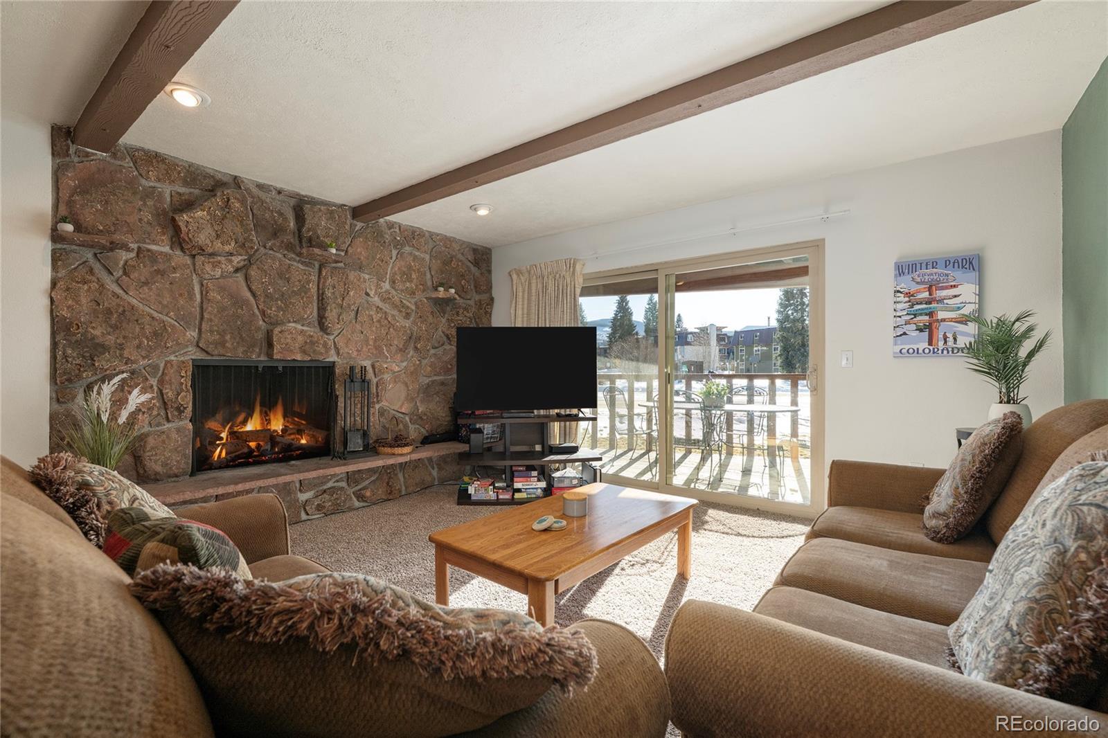 Discover this exceptional updated 2-bedroom, 2-bath condo boasting an open floor plan and two cozy wood-burning fireplaces—one in the inviting living room and another in the primary suite. The kitchen offers abundant cabinetry and countertops, while an in-unit washer/dryer adds everyday ease. The spacious primary bedroom features its own fireplace, direct deck access, and a private ensuite bath. HOA dues cover everything except electric and personal property insurance. Enjoy the outstanding rec center with indoor pool, two hot tubs, fitness area, game room, and more. The free bus stop is steps away. Walk to vibrant downtown Winter Park, the Fraser River Trail, playground and trails. Rental-friendly community makes this an ideal home or investment. Don't miss this gem!