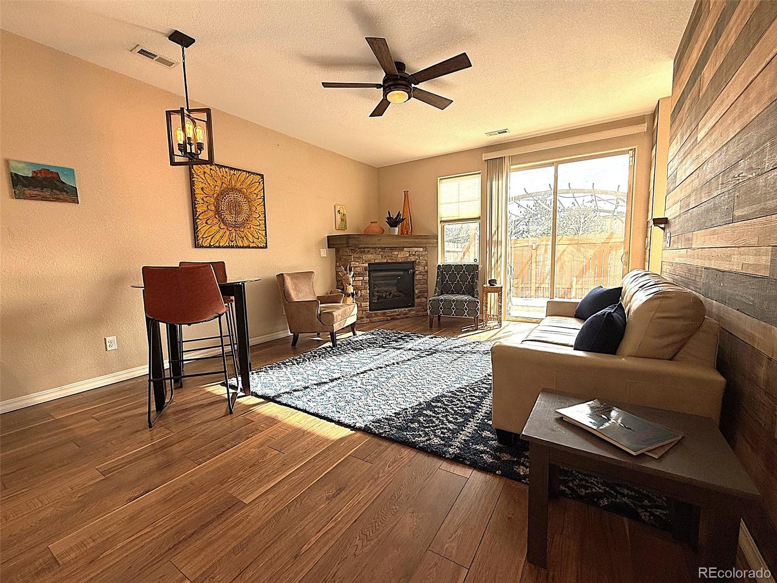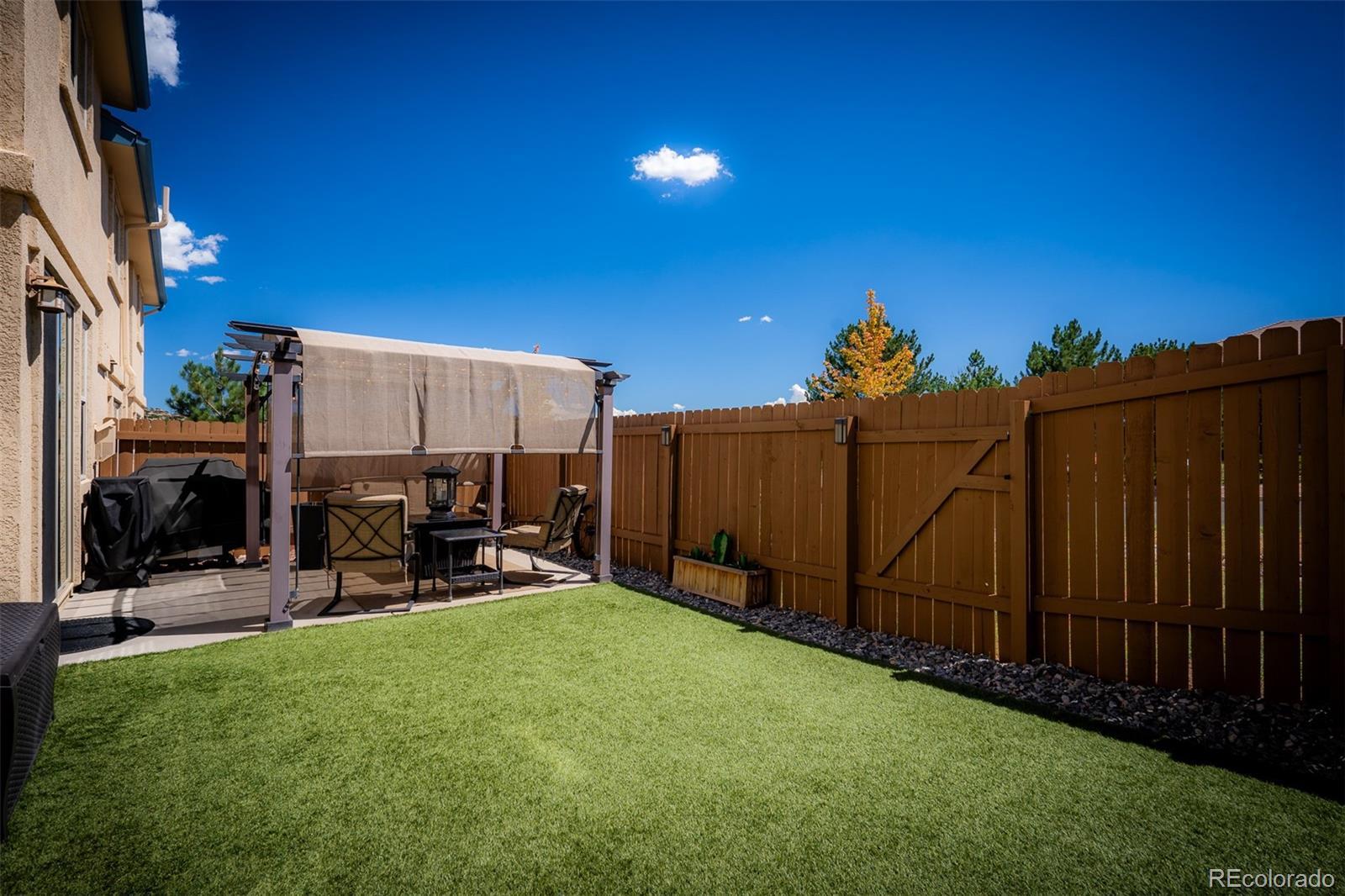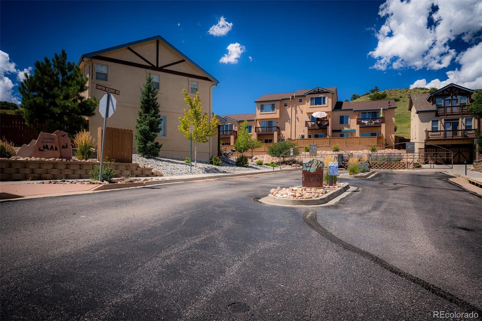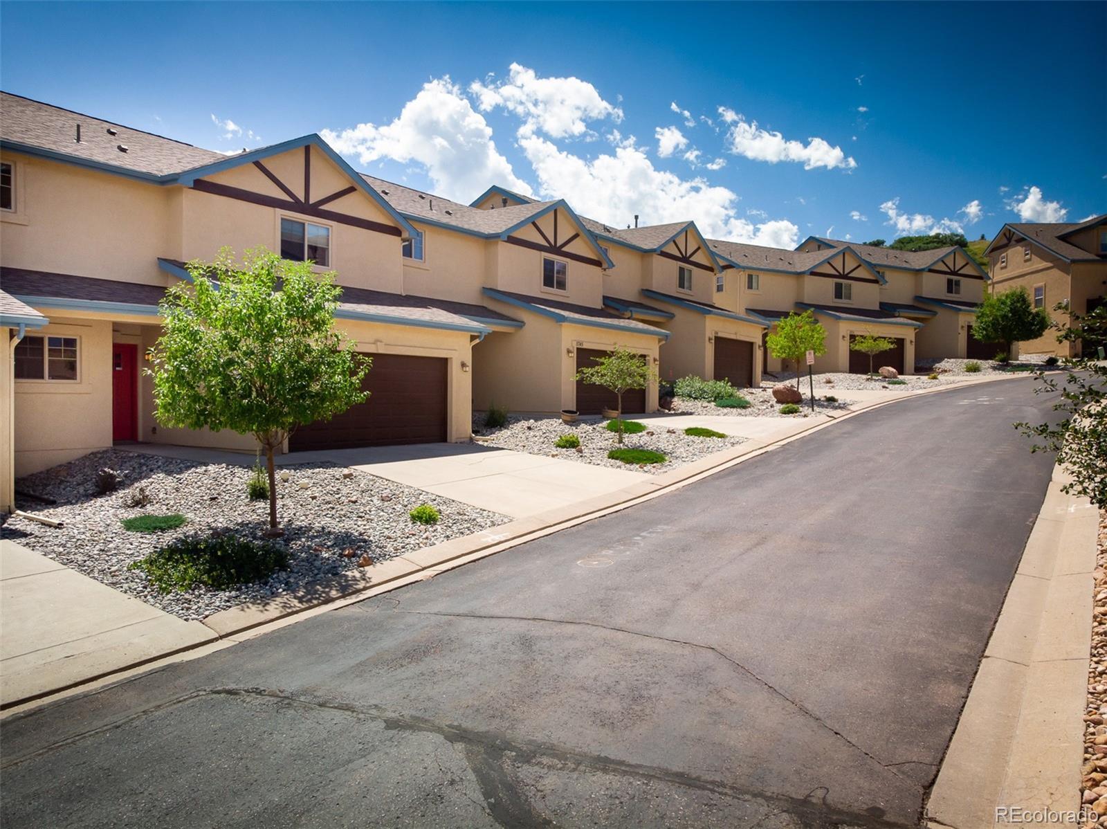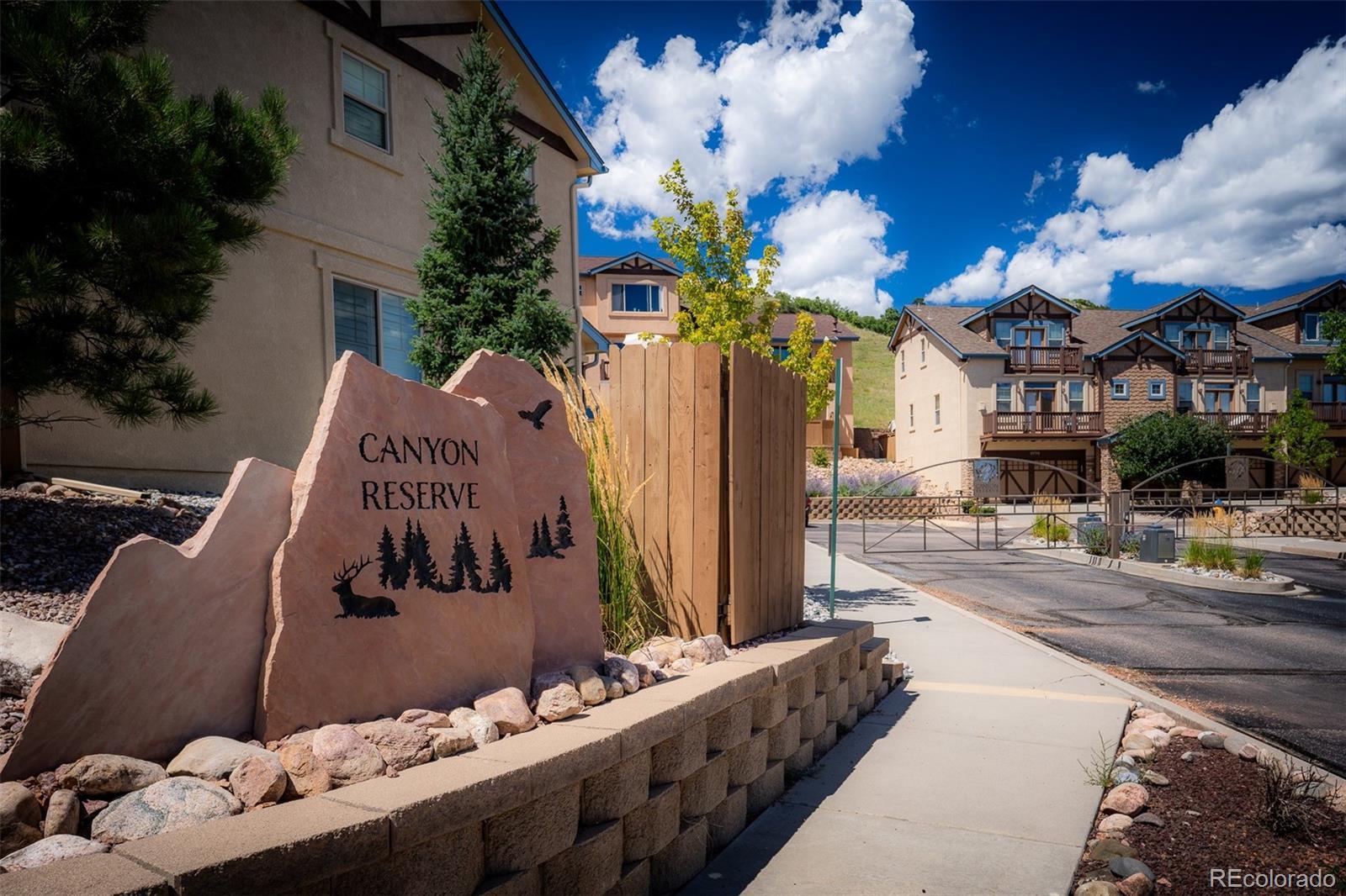 You'll love this customized 4 bedroom, 3 bath, 2 car garage, low maintenance, luxury townhome WITH MAIN LEVEL BEDROOM in the highly coveted, gated community of Canyon Reserve at Mountain Shadows. Surrounded by 600 acres of open space, parks, trails and STUNNING VIEWS just outside your front door, this northwest property is sure to appeal to the outdoor enthusiast. Imagine living within walking or biking distance to Ute Valley Park, Garden of the Gods and Blodgett Open Space! This fully updated townhome includes a main level bedroom and full bath, exquisite & easy care luxury vinyl plank flooring in main living area, stainless steel appliances with a gas oven/range & granite counters in kitchen. A true Colorado lifestyle home, the main level living space boasts a gorgeous accent wall and gas fireplace with an impressive custom wood mantel. You will love walking out of the great room to your new "Happy Place" -- an additional 560 sq ft of outdoor living space complete with a pergola, bistro lights, and astro turf with a privacy fence. The easy indoor - outdoor flow expands your private living space for relaxation and entertaining. The upper level features a large primary suite with a huge walk in closet, double vanity bath with an oversized walk in shower with bench, seamless glass door, and private water closet. You'll love the stained wood barn door to bath that affords privacy with style! The second upper level bedroom enjoys a walk in closet & adjoining bath that also opens to the landing area. A 3rd upper level bedroom has stunning views & a walk in closet. The upper level laundry is both super convenient & quite stylish with its wood stained "swinging doors." Home boasts character, loads of storage with ample closets & added overhead garage storage racks. Barrier free entry from garage to main level. Property has been very well cared for and upgraded with room darkening shades, custom lighting, accent walls and doors & crown molding.