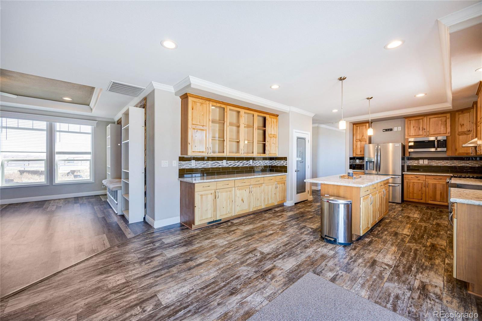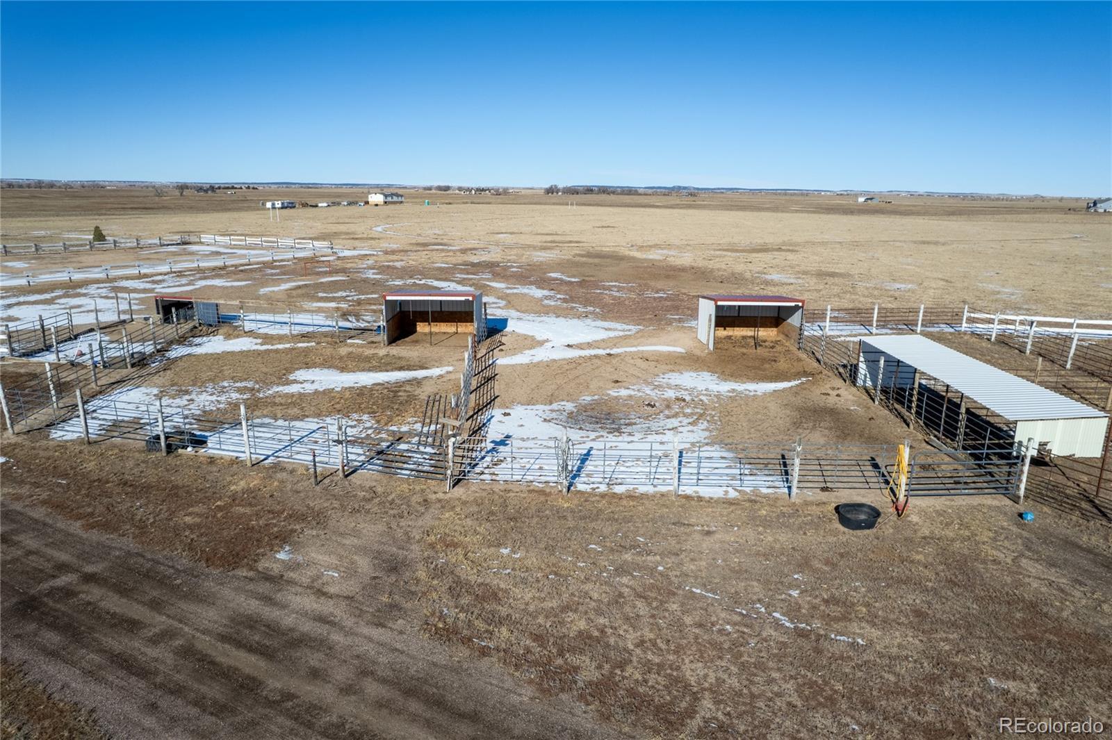 Experience the freedom of country living just minutes from city conveniences on this exceptional 37-acre equine-ready property. This beautifully upgraded ranch-style home offers true main-level living with modern comforts and thoughtful design throughout. Step inside to a warm, inviting family room featuring shiplap walls, built-ins, and custom bookshelves. The gourmet kitchen impresses with a gas range, vent hood, built-in pot filler, expanded island, upgraded cabinetry, separate pantry, and abundant storage. The adjoining dining area flows seamlessly to the expansive patio with views of Pikes Peak. The primary suite features a spacious walk-in closet, a center island, and a luxurious 5-piece bath with a spa shower and soaking tub. Two additional bedrooms, a full bath, a flexible family room/office space, and a well-designed laundry/mud room with exterior access complete the home. RV hookups on the side of the house and in the barn. Outside, the property is a dream for horse lovers and hobby ranchers. The impressive barn features 12' steel walls, tack and feed room, pre-plumbing for hot water, multiple electric outlets, LED lighting, exterior motion lights, four welded steel pipe tie areas, and a concrete cross-tie wash area. Five frost-free hydrants are strategically placed across the acreage. Attached to the barn are four covered pens with 20' runs and bull gates. Additional amenities include a groomed double-entrance riding arena, three pens with covered shelters, two quarantine pens, two large paddocks, and steel loafing sheds. Perimeter fencing is wired for electric fencing. Bonus features include a ¼-mile equine track and a regulation-size polo cross field. This is a one-of-a-kind Colorado country oasis—come take a short drive and see all it has to offer!
