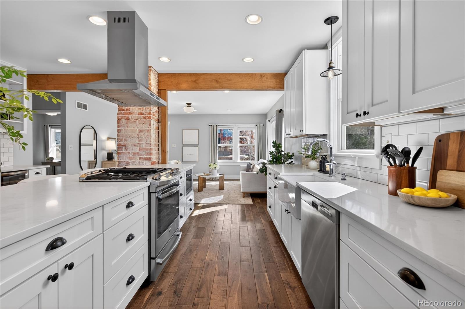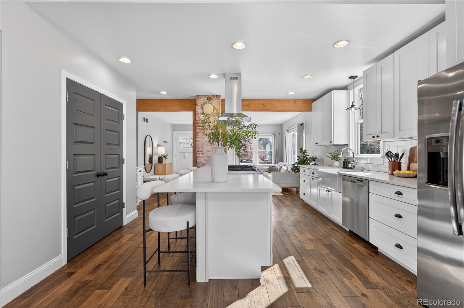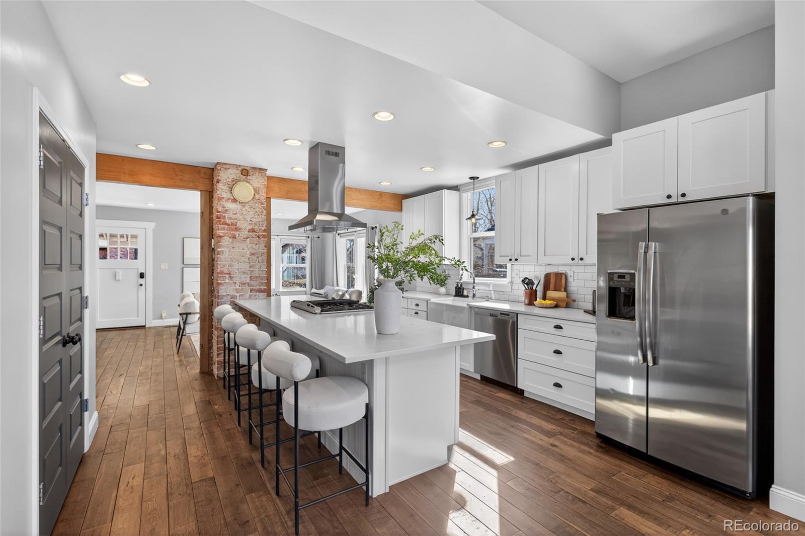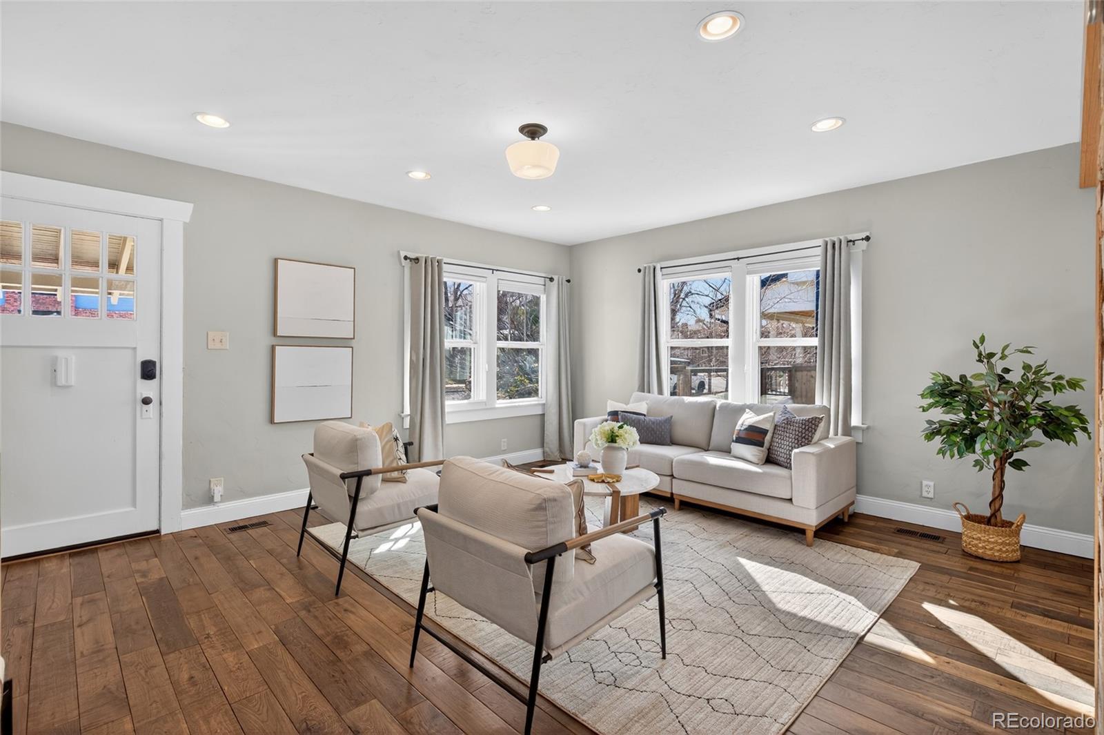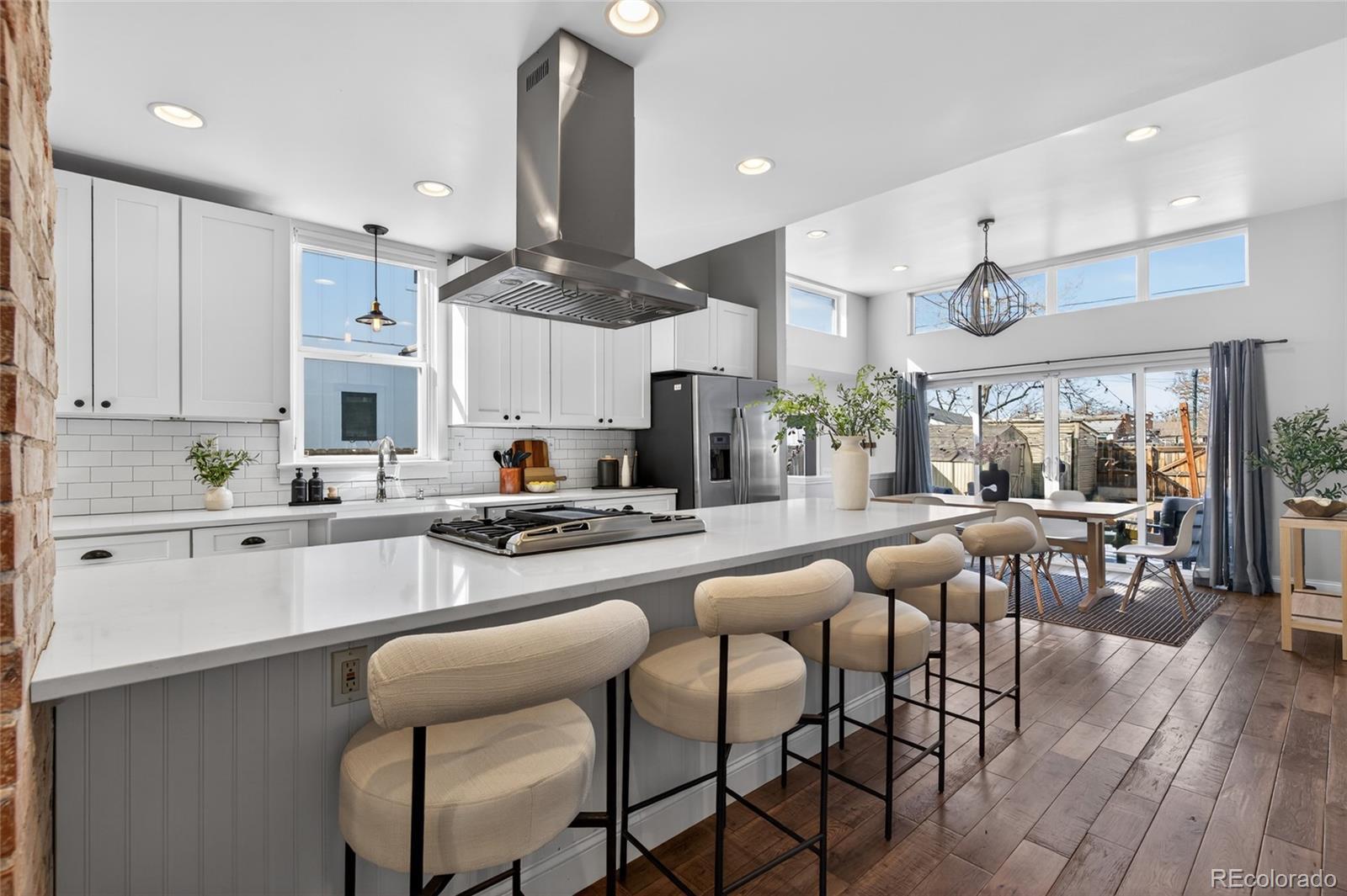 Craftsman character. Colorado soul. This thoroughly remodeled 1922 bungalow honors its original character while feeling current and livable thanks to top-to-bottom modern renovations. Tucked into Denver's Berkeley neighborhood, you're just a half block from Berkeley Lake Park's views, walking paths, tennis courts and dog park—and minutes from downtown. The main floor makes a statement with exposed brick and beams, distressed hardwood floors and original-style window trim. Look forward to evenings clinking glasses around the quartz-topped island beside the wine fridge and bar station, with shaker-style cabinetry and premium appliances in the kitchen. Just beyond, the dining area is flooded with natural light from clerestory windows above. Take gatherings outside to the backyard for alfresco dinners surrounded by beautiful landscaping, sun-soaked garden beds and multiple stamped-concrete and stone patios. Single-level living means the primary suite is conveniently placed—a retreat with patio access via glass sliders, a huge walk-in closet with custom organization, and an oversized shower with floor-to-ceiling tile. The main floor is rounded out by a spacious guest bedroom and bathroom with wainscoting and a claw-foot tub. A well-appointed basement expands the home’s living and guest space with its own bedroom, bathroom, living area and wet bar—all finished to the home’s high design standards. Enjoy living steps from Tennyson Street's restaurants, bars and shops, yet far enough away to avoid the parking headaches. And when adventure calls, quick access to I-70 makes heading to the mountains easy.