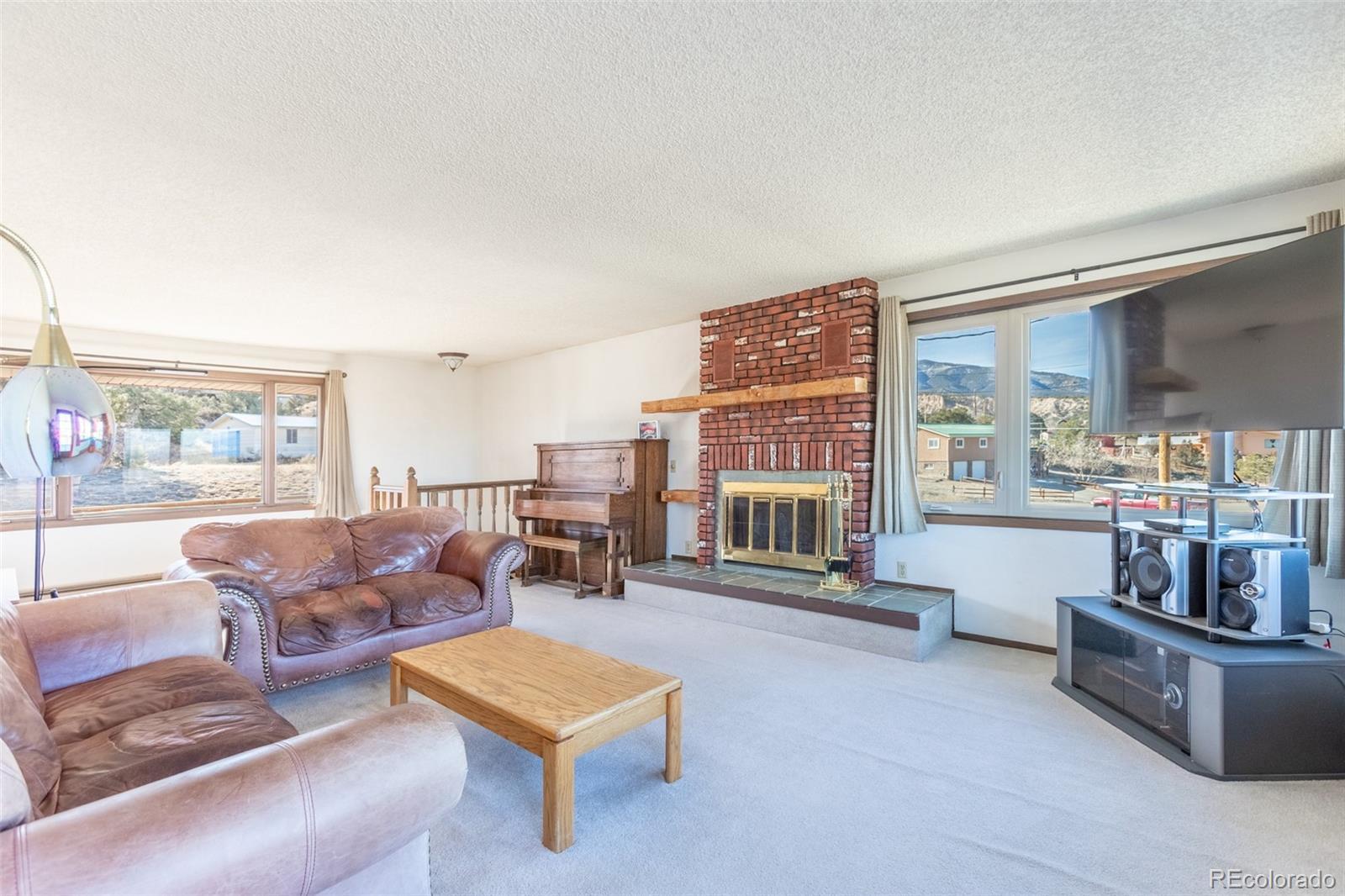 Nestled on 3.5 acres on Methodist Mountain, this home captures some of the best valley and Collegiate Peaks views, with a peaceful ditch running through the property. The main level features a welcoming foyer that opens into a spacious living room with a striking river stone wood-burning fireplace and access to a balcony perfect for taking in the scenery. A designated dining room connects to the kitchen, which offers a breakfast nook, island, stove with built-in microwave, garbage disposal, and a bar area. The kitchen also provides access to the garage—complete with a workbench and built-in shelves—as well as to the downstairs level and hallway leading to the bedrooms. The primary suite includes a private full bath and balcony access, while the second bedroom enjoys stunning mountain views. A full guest bath completes the main level. The finished basement, accessible by a spiral staircase from the living room or stairs from the kitchen, offers a second living room with a wood-burning stove and walkout to a covered back patio, two additional bedrooms, a bonus office or exercise room, a half bath, and laundry area. Additional outdoor features include a storage shed, two balconies, and a covered patio—offering multiple spots to unwind or entertain. With no HOA and easy access to the Methodist Mountain Trail System, this home combines freedom, privacy, and adventure in one unforgettable setting.