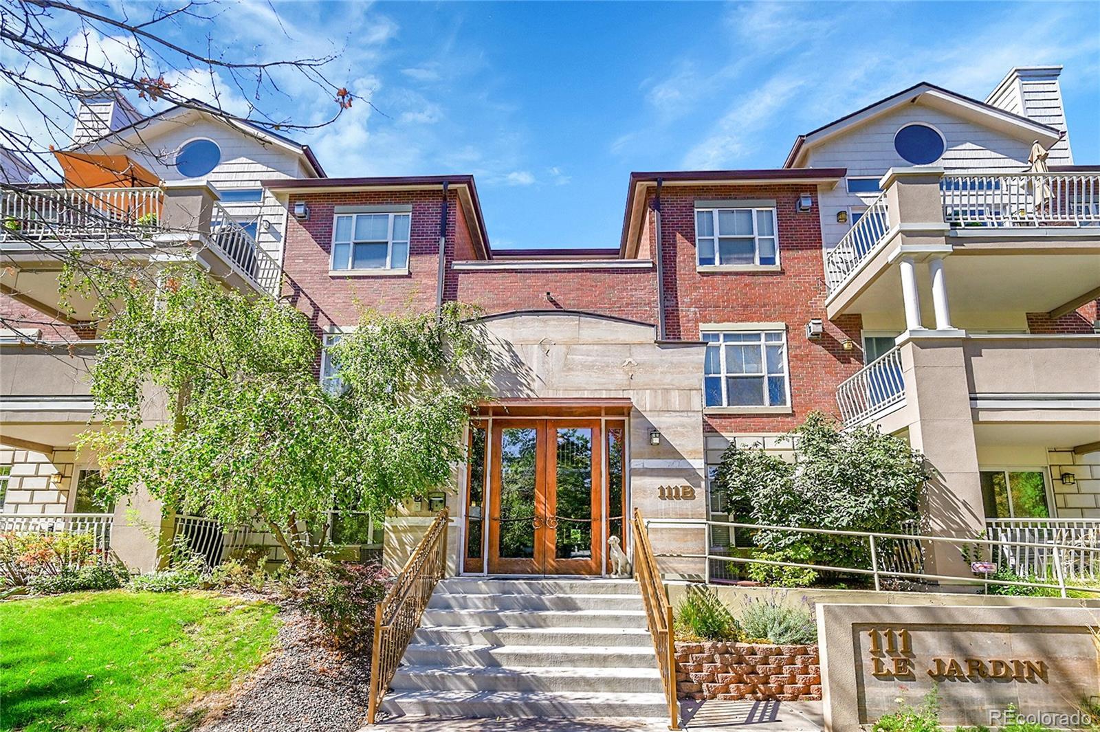 This exceptional top floor condominium situated in the prestigious Le Jardin complex in Cherry Creek presents a remarkable opportunity for discerning buyers. Offering 2 well-appointed bedrooms and 2 bathrooms plus a loft overlooking the living room within 1,545 square feet, this residence combines elegance with modern living. The expansive living room features a high vaulted ceiling, hardwood floors, with superb natural light, creating an inviting environment. The kitchen, equipped with stainless steel appliances and dark stone countertops, flows seamlessly into the dining area, perfect for both casual and formal dining experiences. The primary bedroom suite boasts an ensuite bathroom with a double vanity and luxurious shower with custom built in cabinetry in the closet area. Residents can enjoy a private balcony, ideal for outdoor dining or relaxation while overlooking wooded views of the neighborhood and skyline. The property includes 2 deeded parking spaces in the private garage, ensuring convenience in urban settings. The community offers a host of amenities, including a fitness center and beautifully landscaped outdoor spaces, enhancing your living experience. Located in the vibrant Cherry Creek neighborhood, this property offers easy access to up-scale shopping, dining, and recreational activities, making it an ideal choice for those seeking a sophisticated urban lifestyle. These coveted top floor corner condominiums rarely come on the market, don’t wait to set up your private tour!