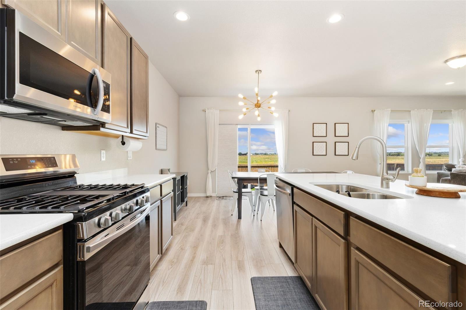 This spacious 4-bedroom home offers 10-foot ceilings on the main floor, a bright open floor plan, and a stunning kitchen with quartz countertops, a massive island, gas stove, stainless steel appliances, large pantry, and abundant cabinet and counter space. The kitchen opens to a sun-filled living room and generous dining area, perfect for entertaining. A main-level flex room provides options for an office, playroom, or hobby space. Upstairs, the luxurious primary suite features a 3/4 bath with quartz counters, double sinks, a large shower with bench and window, private linen closet, and walk-in closet. A sizable loft, three additional bedrooms, and a laundry room in the upper level. The oversized 2-car garage includes a spacious crawl space with excellent ceiling height for added storage. Enjoy a fully landscaped backyard, covered front porch, and window coverings throughout. Conveniently located near schools, shopping, and with easy highway access — this home is truly move-in ready.