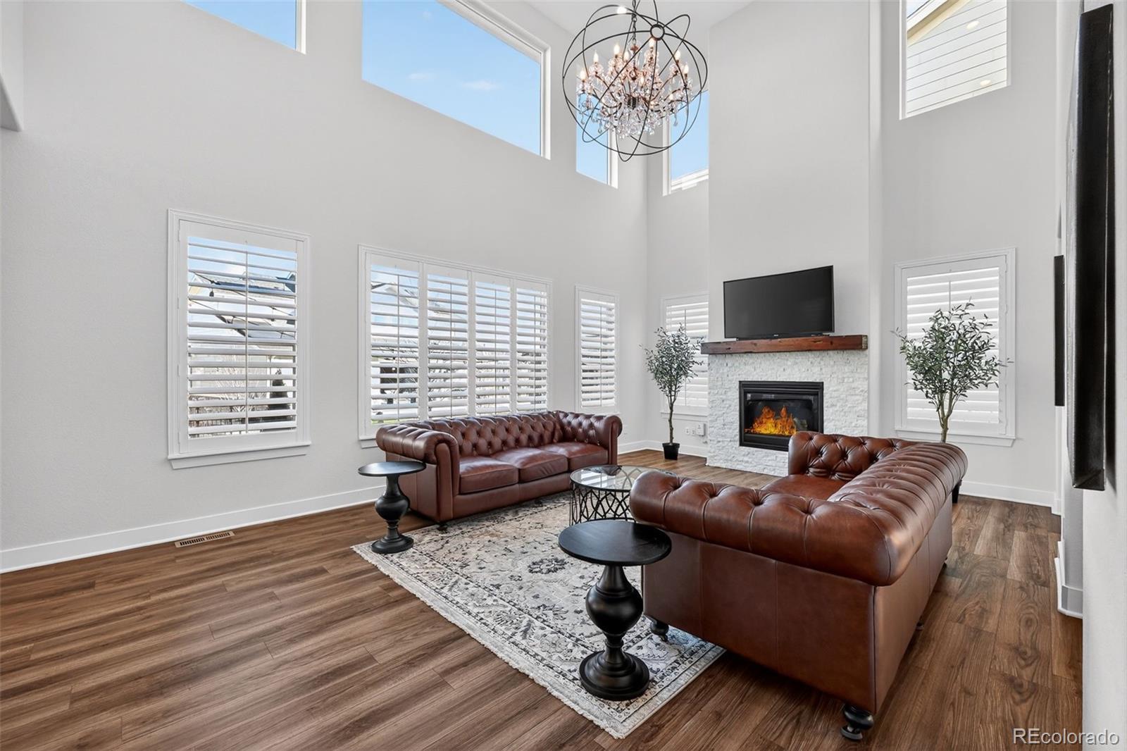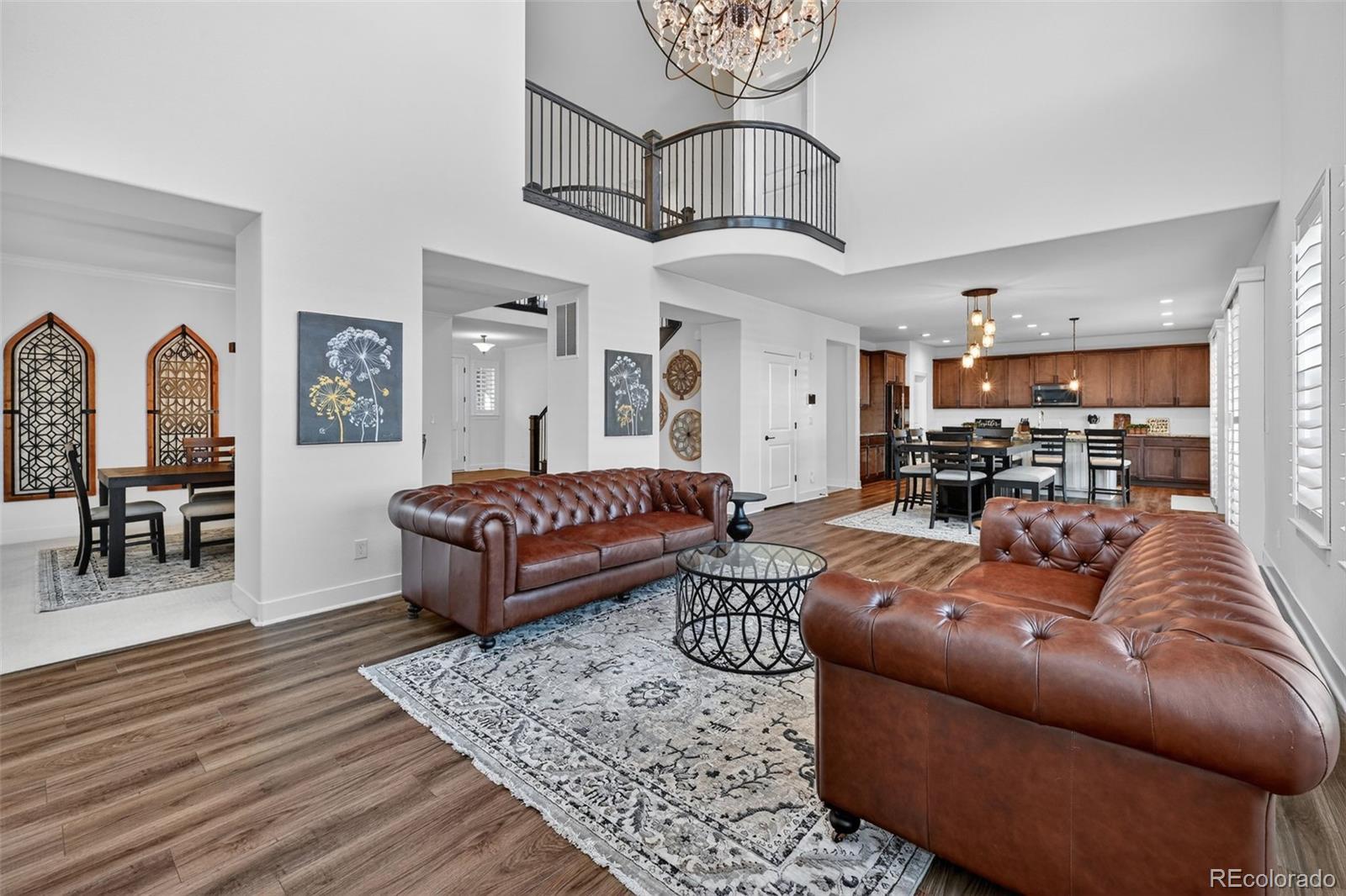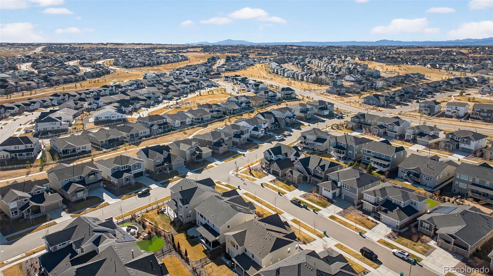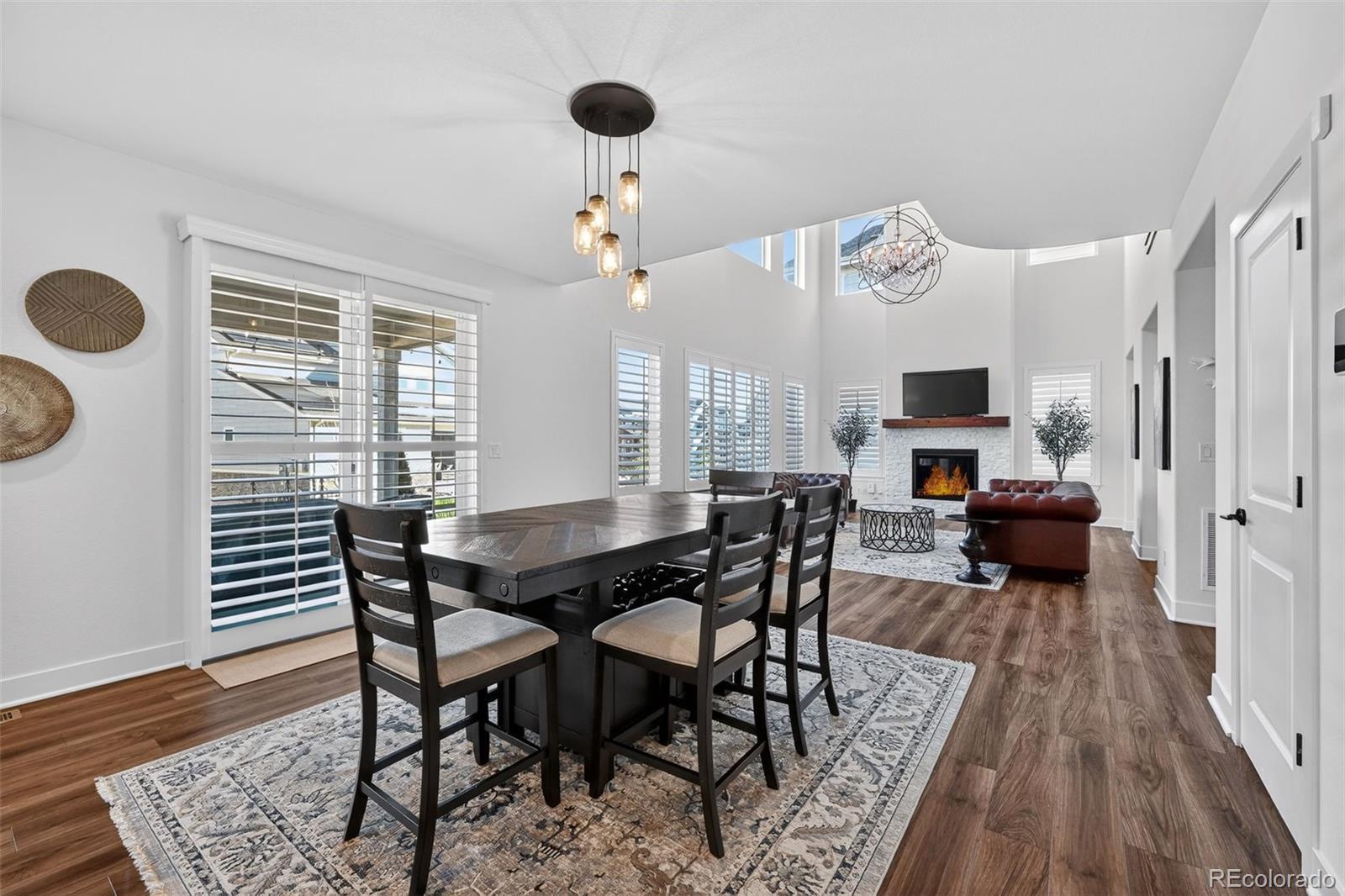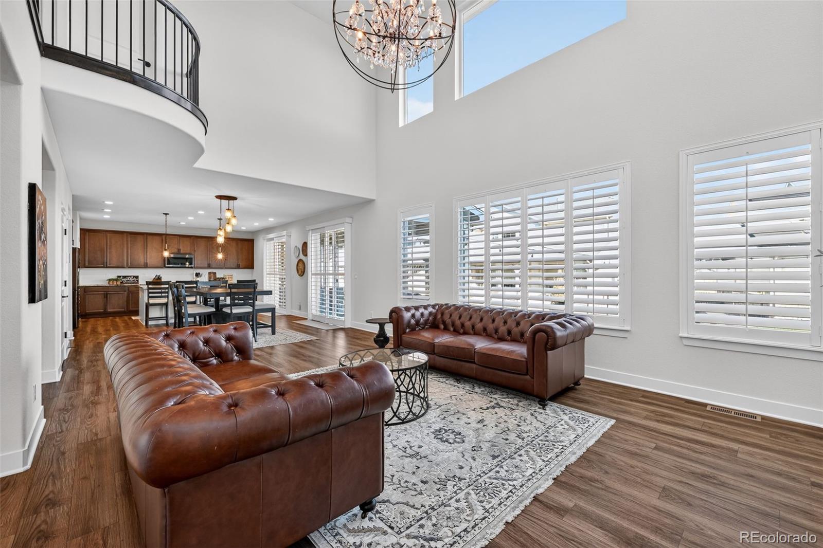Beautifully appointed home in the highly desirable Southshore community, offering exceptional space, style, and comfort. This stunning residence features 5 bedrooms, including a luxurious primary suite and a private junior suite, 5 bathrooms, and a spacious 3-car garage. A welcoming foyer opens to luxury vinyl flooring throughout most of the main level. The living room impresses with soaring cathedral ceilings open to the second floor, expansive windows that flood the space with natural light, and a cozy gas fireplace with a striking stone surround. The gourmet kitchen is designed for both everyday living and entertaining, showcasing a large island with a convenient sink and breakfast bar seating, granite countertops, gas range, generous cabinetry, and a coffee bar area. a large dining area offers division between the open kitchen and living room. The main level also offers a formal dining room, a private office and half bath. Upstairs, the primary suite features a walk-in closet, dual vanities, a relaxing garden soaker tub, and a glass-enclosed shower with rainfall showerhead. The laundry room is accessible directly from the primary suite or hallway. Three additional spacious bedrooms complete the upper level, two connected by a dual-sink Jack-and-Jill bath, along with an open family loft ideal for a library or game room. The finished basement features a large recreation room, wet bar, junior suite with a 3/4 bath, and an unfinished storage area. Enjoy resort-style living with access to two community centers, swimming pools, parks, trails, and the Aurora Reservoir, all while being minutes from shopping, dining, and entertainment.