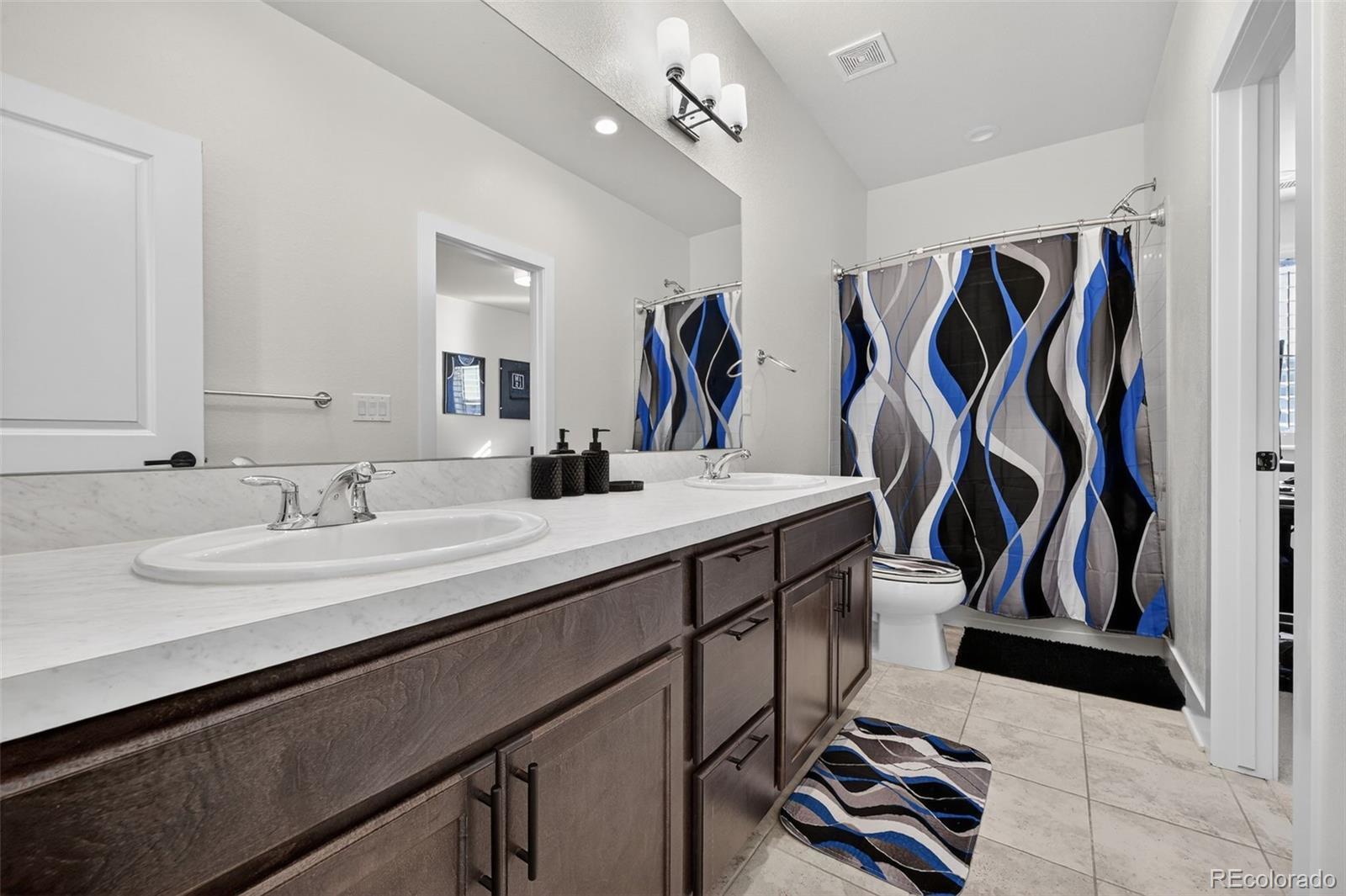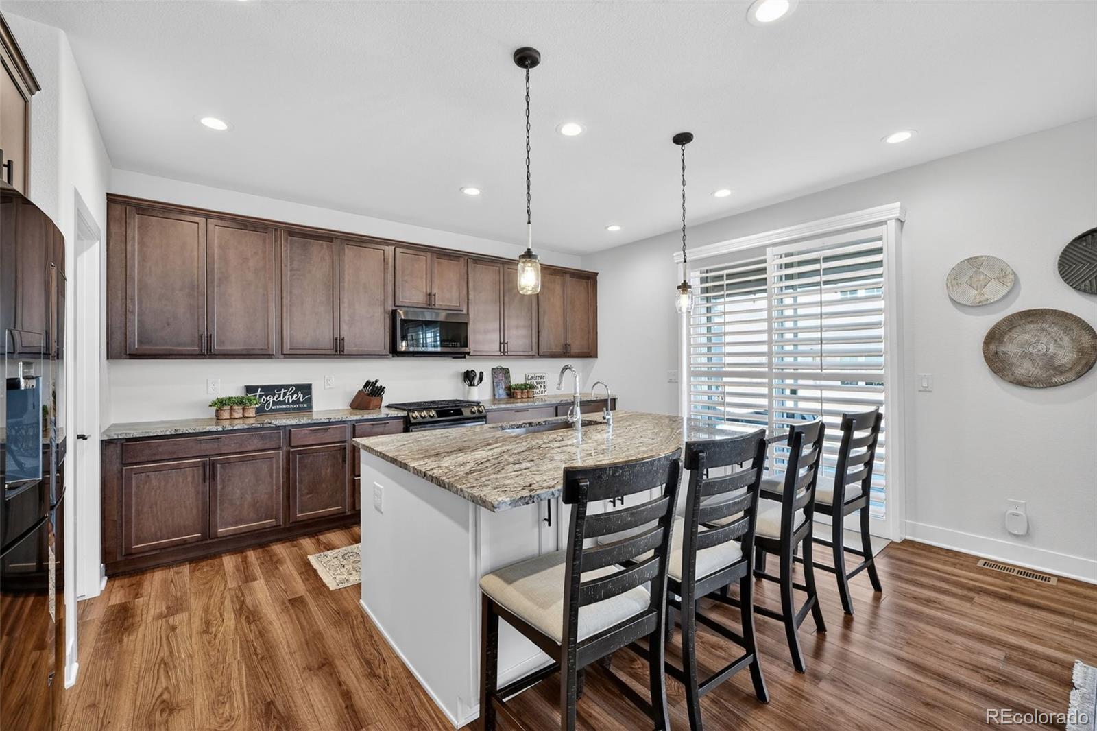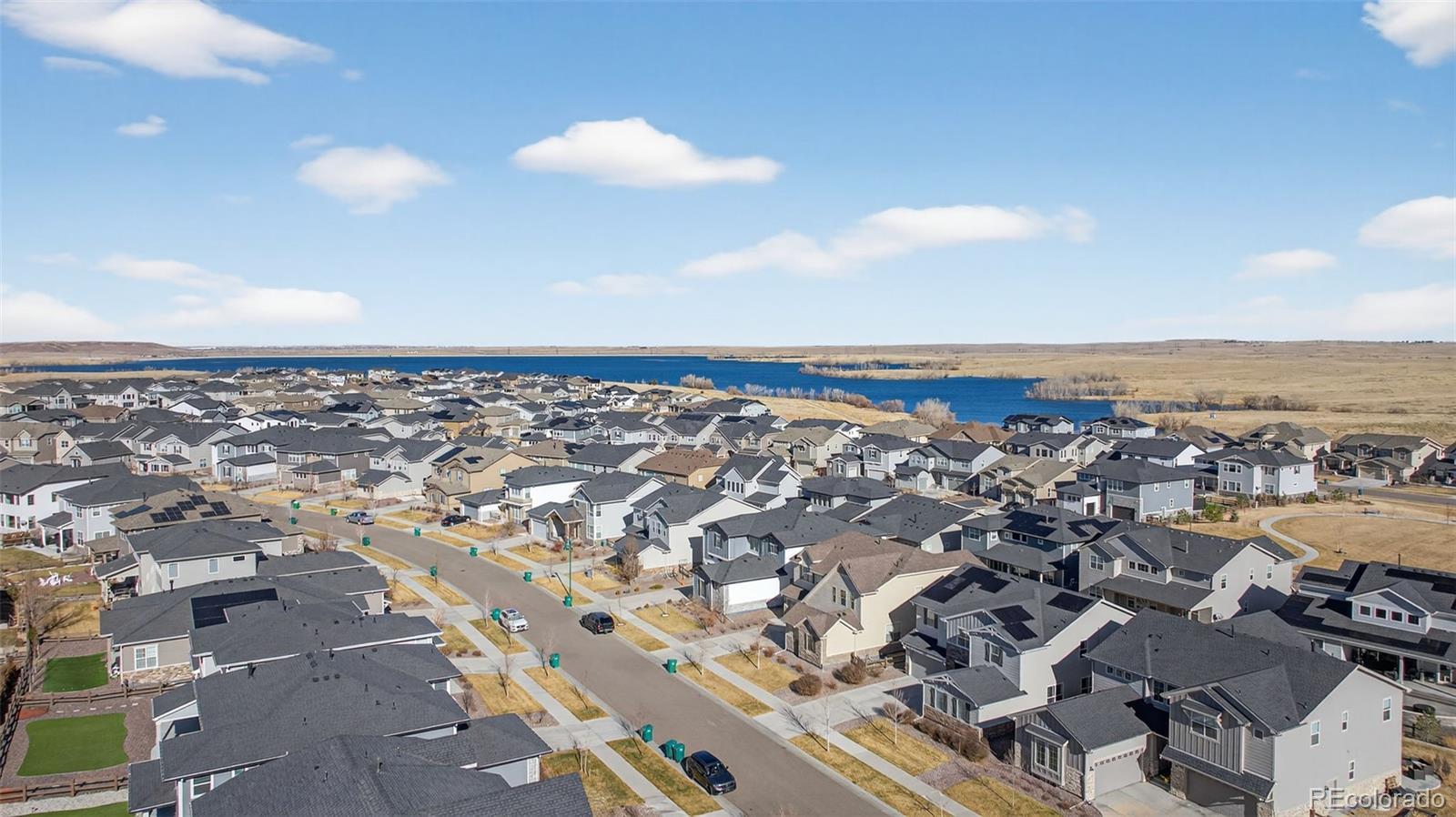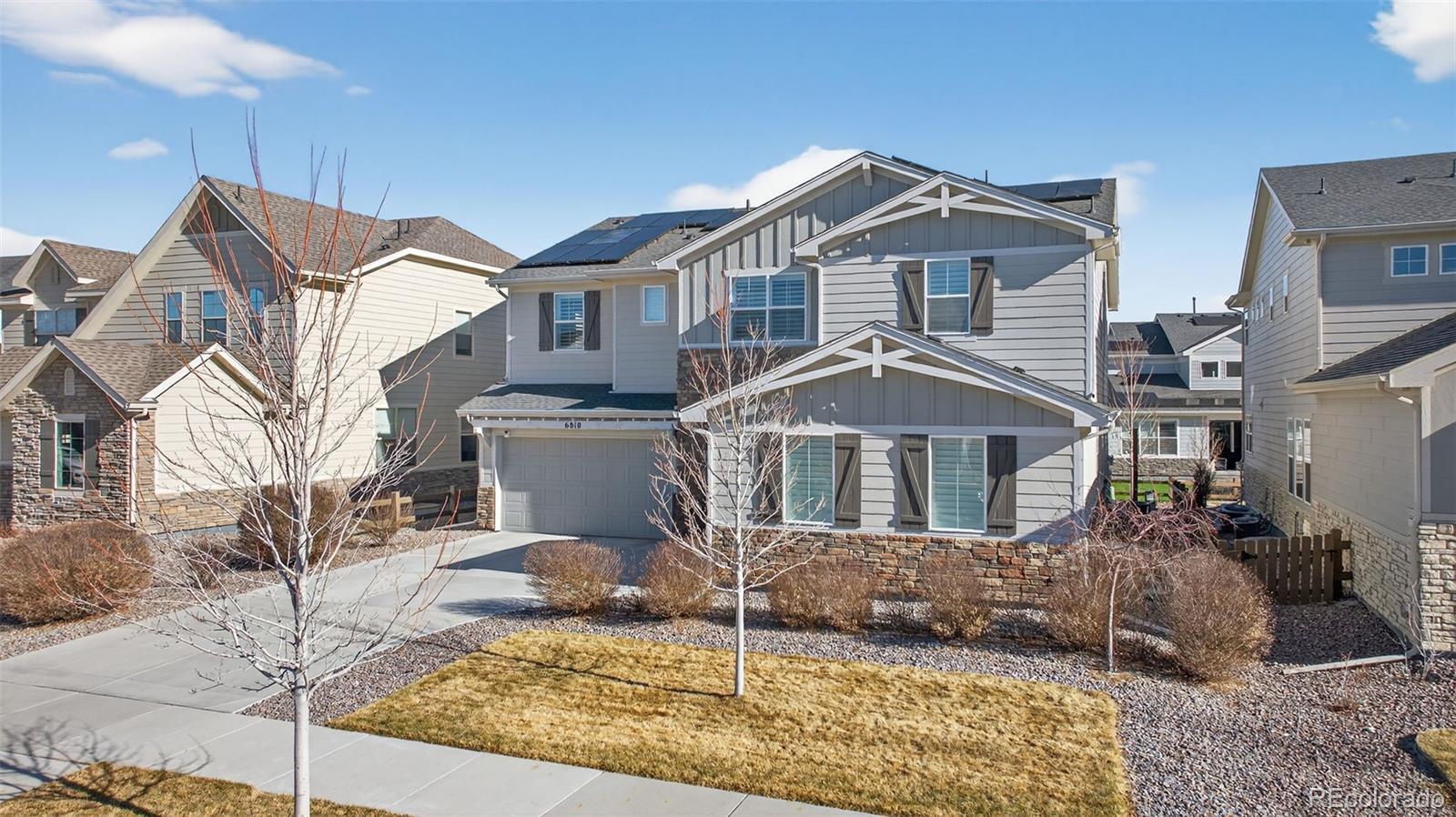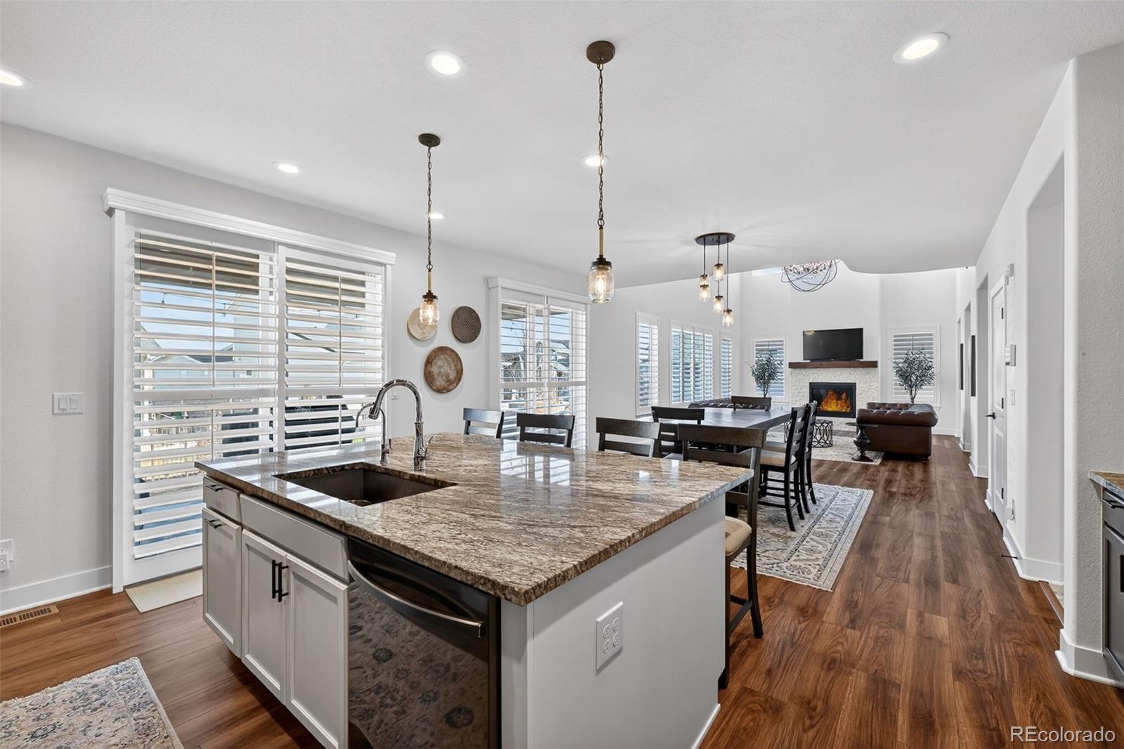 Beautifully appointed home in the highly desirable Southshore community, offering exceptional space, style, and comfort. This stunning residence features 5 bedrooms, including a luxurious primary suite and a private junior suite, 5 bathrooms, and a spacious 3-car garage. A welcoming foyer opens to luxury vinyl flooring throughout most of the main level. The living room impresses with soaring cathedral ceilings open to the second floor, expansive windows that flood the space with natural light, and a cozy gas fireplace with a striking stone surround. The gourmet kitchen is designed for both everyday living and entertaining, showcasing a large island with a convenient sink and breakfast bar seating, granite countertops, gas range, generous cabinetry, and a coffee bar area. a large dining area offers division between the open kitchen and living room. The main level also offers a formal dining room, a private office and half bath. Upstairs, the primary suite features a walk-in closet, dual vanities, a relaxing garden soaker tub, and a glass-enclosed shower with rainfall showerhead. The laundry room is accessible directly from the primary suite or hallway. Three additional spacious bedrooms complete the upper level, two connected by a dual-sink Jack-and-Jill bath, along with an open family loft ideal for a library or game room. The finished basement features a large recreation room, wet bar, junior suite with a 3/4 bath, and an unfinished storage area. Enjoy resort-style living with access to two community centers, swimming pools, parks, trails, and the Aurora Reservoir, all while being minutes from shopping, dining, and entertainment.
