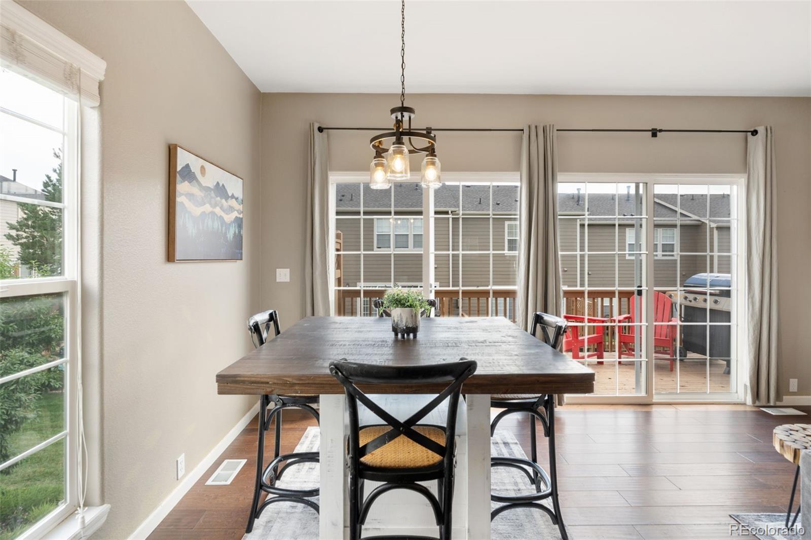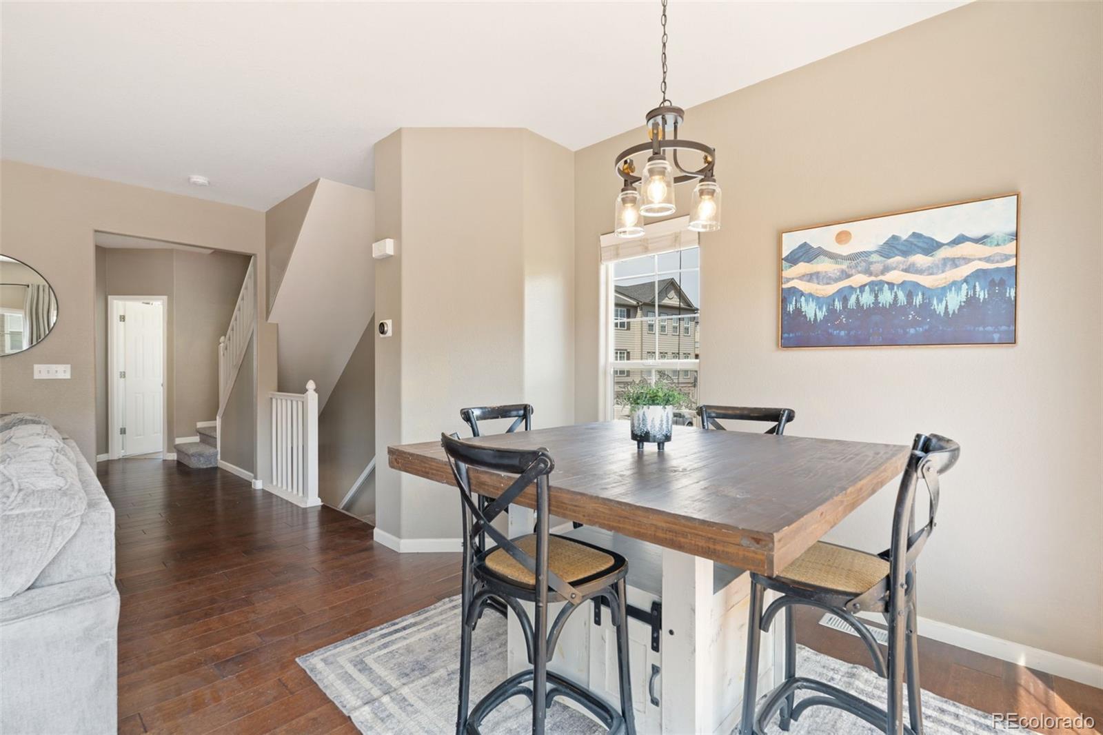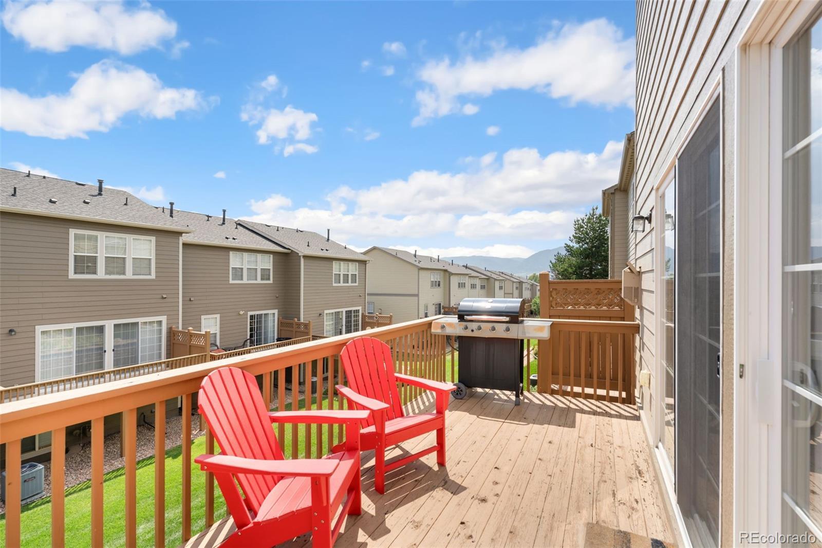 Stylish Townhome with Mountain Views! Step into charm, comfort, and convenience with this beautifully updated end-unit townhome that’s loaded with upgrades and full of personality. From gleaming wood floors throughout the main and upper levels to rich cherry cabinetry, stainless steel appliances, and designer lighting, every detail has been thoughtfully curated. Cozy evenings await by the tiled gas fireplace, while oversized windows bathe the space in natural light. The spacious kitchen flows seamlessly into the open concept living and dining areas—perfect for entertaining—with direct access to a private deck where mountain views set the mood. Retreat Upstairs to Dual Master Suites. Each suite features its own en-suite bathroom and generous walk-in closet for ultimate privacy and comfort. Downstairs, a third bedroom with its own bath adds flexibility for guests, a home office, or multi-generational living. Enjoy a private garage, additional guest parking right next door, a dedicated laundry room, and easy access to I-25 for quick commutes to Denver, Colorado Springs, or the Air Force Academy. Nearby trails, schools, shopping, the YMCA, and outdoor adventures complete the lifestyle. This well-cared-for home offers hassle-free exterior maintenance so you can focus on mountain sunsets and making memories. This townhome has it all—luxury finishes, unbeatable location, and space to live your best life. Come see it before it’s gone!