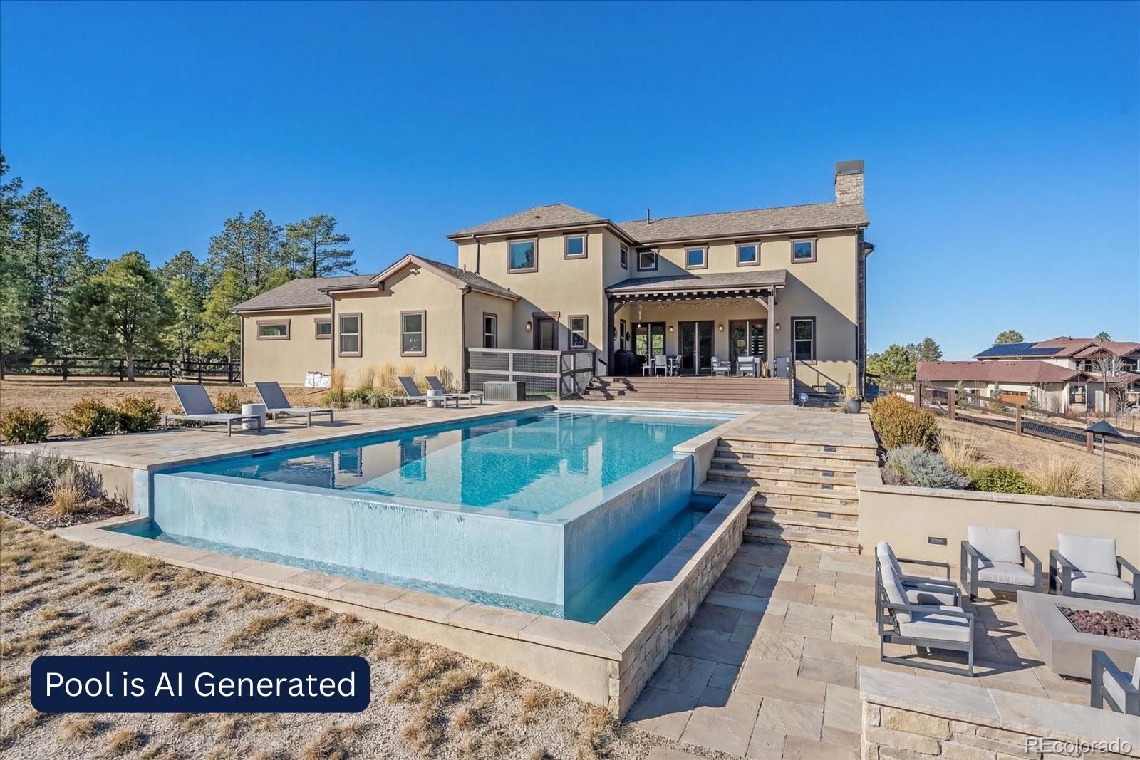 Set behind the gates of Preserve at Deerfield, this exceptional custom residence offers nearly four acres of privacy, luxury, & thoughtful design. Perfectly positioned for both tranquility & convenience, the home provides easy access to city essentials, DIA, & CO Springs Airport, making it ideal for buyers seeking a refined acreage lifestyle without sacrificing connectivity. This 4-bed, 4-bath home offers 4,054 fin sqft with room to expand, situated on a beautifully usable lot. A 3-car oversized garage includes a dedicated workshop, epoxy floors, interior drains, and direct yard access—perfect for hobbyists, or active lifestyles. The chef’s kitchen, featuring a spacious island with dual sinks, Thermador appliances including two dishwashers, 48" cooktop with range hood, 54-bottle wine fridge, & double ovens. Quartz countertops flow throughout the home, complemented by furniture-style vanities and custom bathroom mirrors for a cohesive, elevated finish. Designed with both beauty & function in mind, the home showcases knotty alder beams, a striking mahogany front door, and a one-of-a-kind 1860s hand-cut reclaimed beams. Triplicating French doors seamlessly connect indoor/outdoor living spaces, while the great room windows are pre-wired for future automation. The mudroom provides a walk-in pantry with an Elfa system and pocket door, & dog run with 6’ fencing. The main-floor office features a custom barn door and hidden closet storage, ideal for secure files or a private vault. Outdoor living is equally impressive with a 24'x18' herringbone deck, cable railing, drip irrigation for trees and landscaping —perfect for entertaining or quiet evenings under Colorado skies. The primary suite offers a five-piece spa bath with a freestanding tub, oversized shower, & a walk-in closet with built-ins. Other conveniences include an upstairs laundry room & loft. With basement framing already started for future expansion, this home offers immediate luxury and long-term flexibility.