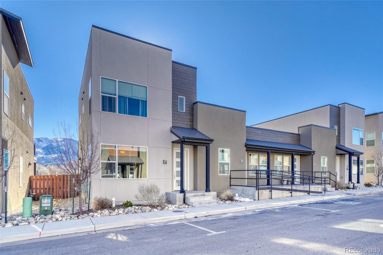 This beautiful mountain modern contemporary condo, built in 2021, offers the perfect blend of style, comfort, and outdoor access. With 1,258 square feet of thoughtfully designed living space, this home features high ceilings and an open-concept layout that feels bright and spacious. The main floor has a "flex" bedroom/home office with access to a full bath. Upstairs, there are two primary suites each with its en-suite full bathroom and walk-in closet. The modern kitchen is equipped with stainless steel appliances, a gas stove, and quartz countertops, making it ideal for both everyday living and entertaining. Enjoy air conditioning on the hot summer days. Beautiful mountain views and the privacy of a fenced yard. A 252-square-foot detached garage provides convenient parking and additional storage. In addition there is a deeded parking space adjacent to garage. The Salida trail system, only a few steps away, makes for an easy walk or bike ride into historic Salida and the Arkansas River, restaurants, shops and access to the S Mountain Trails and more.