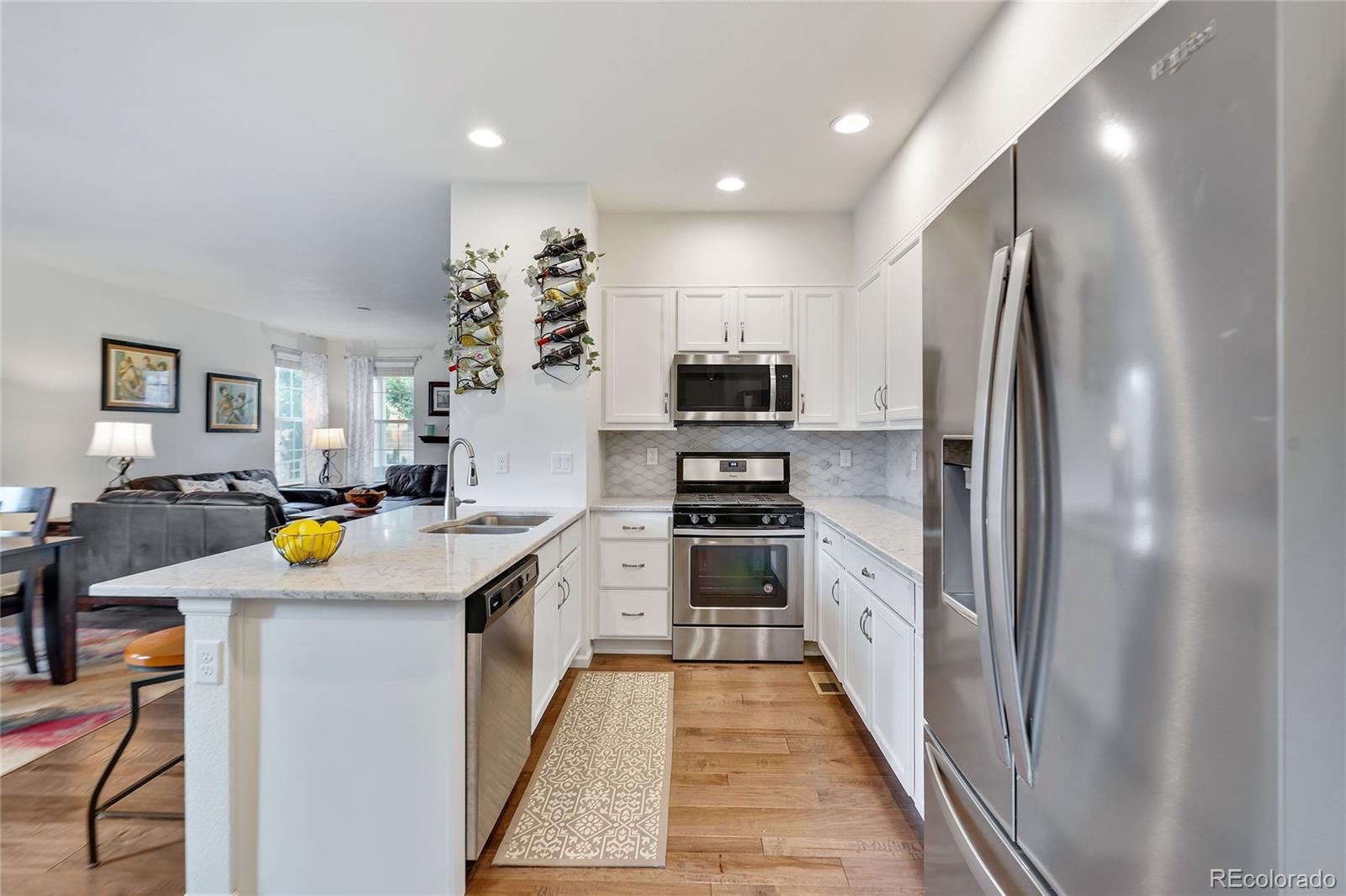 Welcome to your new home in Pioneer Hills! This beautiful paired home, built in 2018, offers a perfect blend of modern living and convenience. The light and bright floor plan is amazing. Your beautiful kitchen is adorned with upgraded cabinets with soft close doors and drawers, stainless appliances, gas stove and quartz countertops with counter height seating. Kitchen and dining area open to the main floor living area. Featuring 3 bedrooms plus a loft, and 4 bathrooms, this home provides ample space for work and play. The primary bedroom includes a private bath, ensuring a personal retreat. Upstairs includes a second bedroom, loft, and full second bath. Guest bath and laundry on the main floor and additional finished space in the basement with an egress window and closet can be a third bedroom or extra living space. New carpet in the basement and another ¾ bath creates ideal space for entertainment or relaxation. You’ll love the easy access 2-car attached garage and the fabulous oversized deck, perfect for outdoor gatherings. Welcome Home! Location is key, and it doesn’t get better than this. Close to Cherry Creek State Park, Cherry Creek Schools, shopping, and dining, with easy access to get wherever you wish in the Denver Metro area. Pioneer Hills offers a community pool and clubhouse for your enjoyment. This home is designed with contemporary features and thoughtful details, making it a wonderful place to create lasting memories.
