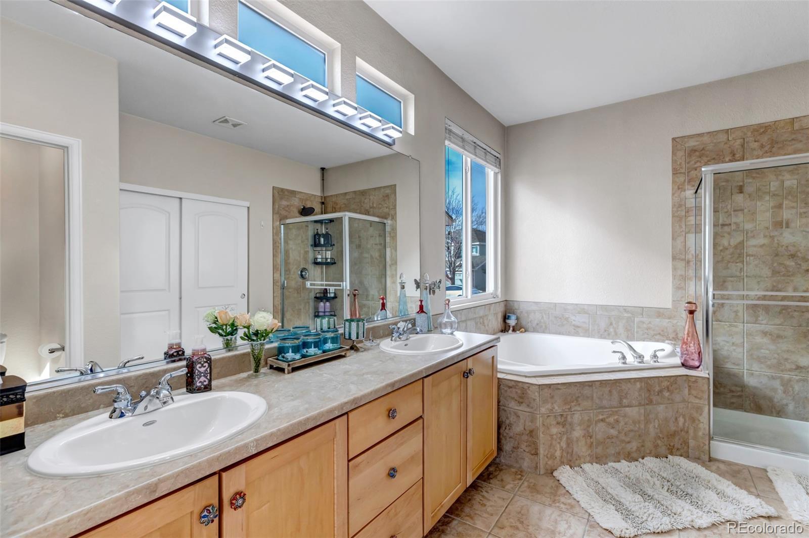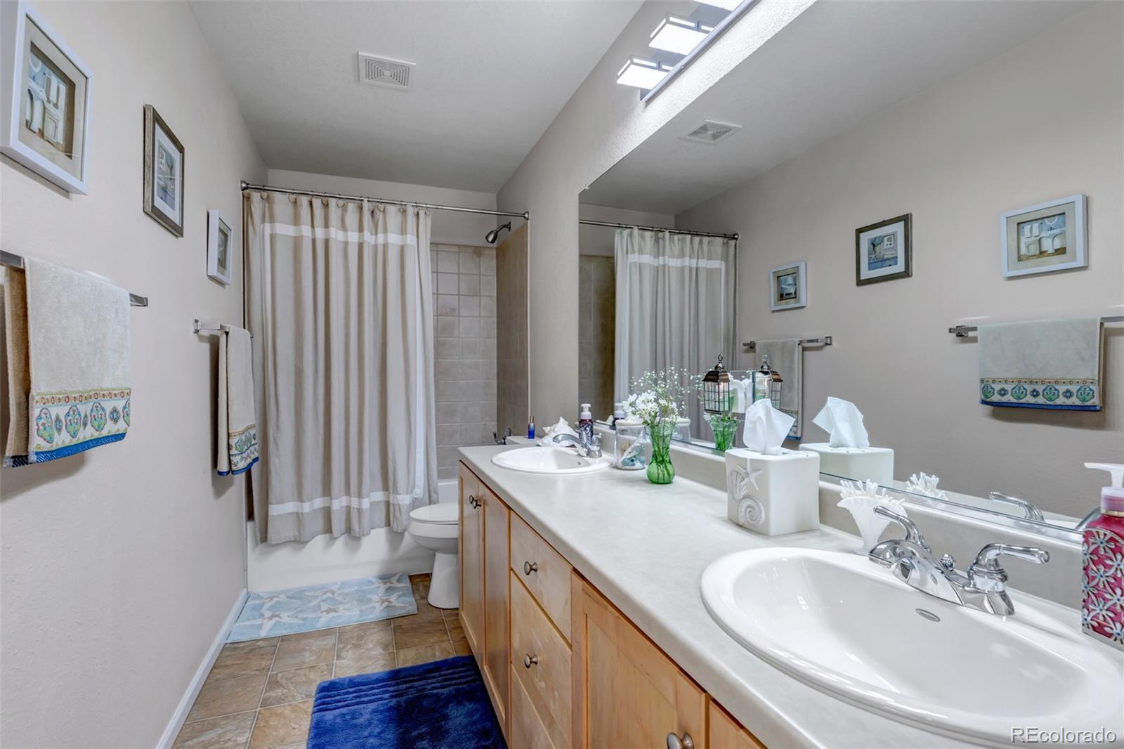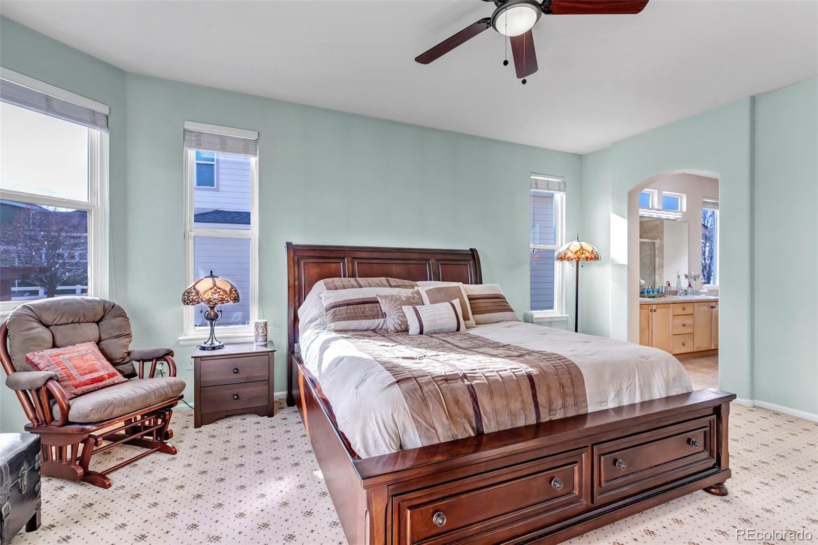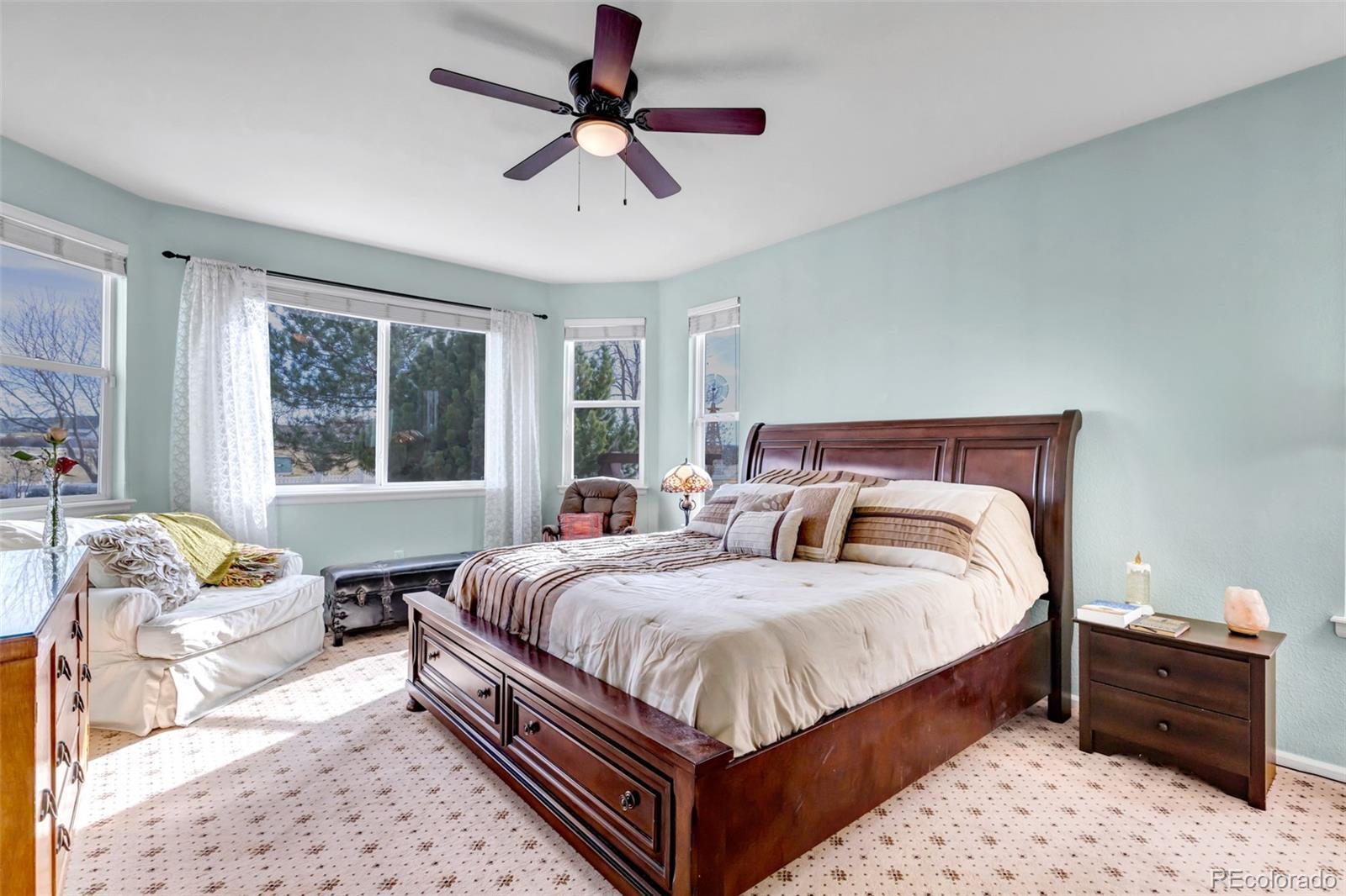 Must see this beautiful 2-story home in Aurora! Located in the Murphy Creek Golf Course community at the end of a cul-de-sac, this home features 5 bedrooms, 3 bathrooms, an upper level loft and a fully finished basement! This very bright & open floor plan greets you with wood flooring, lots of big windows with natural light & vaulted ceilings. Spacious kitchen with granite countertops, stainless steel appliances, plenty of cabinets with pull out drawers. Separate area for laundry off of the 3-car garage with cabinets. All appliances stay! Eat-in space off of the kitchen with patio doors leading out onto the backyard deck. Home is located right across the street from the golf course driving range, golf shop & Murphy Creek Tavern. The backyard is perfect for entertaining as it sits on over 11,000 sq ft lot, has a trek deck, gas line grill, gas fire pit area & hot tub. Solar panels are fully PAID off until: 2034! Sprinklers front & back with drip lines throughout the professionally landscaped backyard. Has a raised garden bed with self watering irrigation system hooked up to the sprinkler system. Enjoy relaxing in your main level front living room area or in the family room with a cozy fireplace to keep you warm on a chilly Colorado night! Main floor Primary bedroom, 5-piece bath & walk-in closet. The upper level has a loft, full bathroom with double sinks & 3 bedrooms. One of which has a balcony! The basement is over 1,500 finished sq ft. Has a dry sauna!! The 5th bedroom in the basement has been made into a custom storage room. Located just 3 blocks from Murphy Creek K-8 school, the Clubhouse, tennis court & community pool. The proximity to E-470 gives easy access to other major highways, shopping, dining and entertainment at Southlands mall. Unwind from your day by sitting on your covered front porch or in the beautiful backyard. All you need to do is move in and make this your happy home!