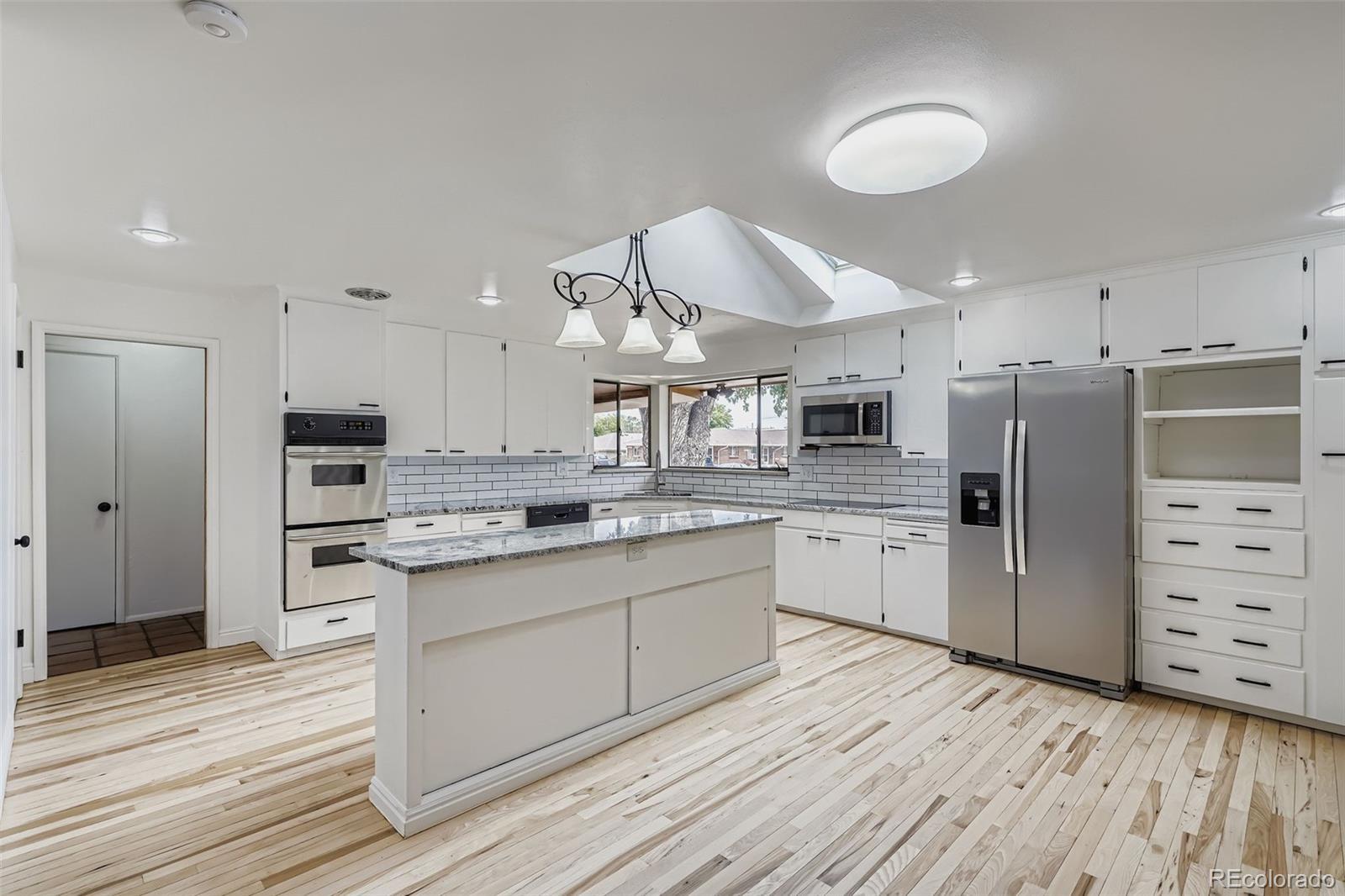 Located in the heart of Wheat Ridge, this thoughtfully updated home sits on a generous 10,280 square foot corner lot and offers 2,822 total square feet, including 2,481 finished square feet. With four bedrooms and three bathrooms, the layout is both spacious and functional, complemented by a long list of recent upgrades. The main kitchen has been refreshed with new granite countertops, a tile backsplash, a new sink, newly painted cabinets, and a full suite of brand-new appliances. A large island provides ample workspace, and the refinished wood flooring adds warmth and charm. New flooring continues throughout the rest of the home, including soft new carpeting on the main level and durable laminate flooring in the finished basement. Two fireplaces, one on each level, create inviting spaces for gathering and relaxing. The basement also features a spacious second living area and a convenient kitchenette equipped with a full-size refrigerator, sink, and oven, offering added flexibility for guests, multi-generational living, or extended entertaining. The entire interior has been freshly painted, giving the home a clean and cohesive feel throughout. Step outside to a large covered back patio, perfect for entertaining or quiet evenings at home. The backyard also features a peaceful water feature ready for a new pump, and a spacious, well-maintained Tuff Shed ideal for storage, hobbies, or a workshop. An extended driveway provides extra parking and space for an RV, while the attached two-car garage adds everyday convenience. With easy access to downtown Denver, I-70, parks, trails, shopping, dining, and more, this home offers comfort, updates, and location in one complete package.