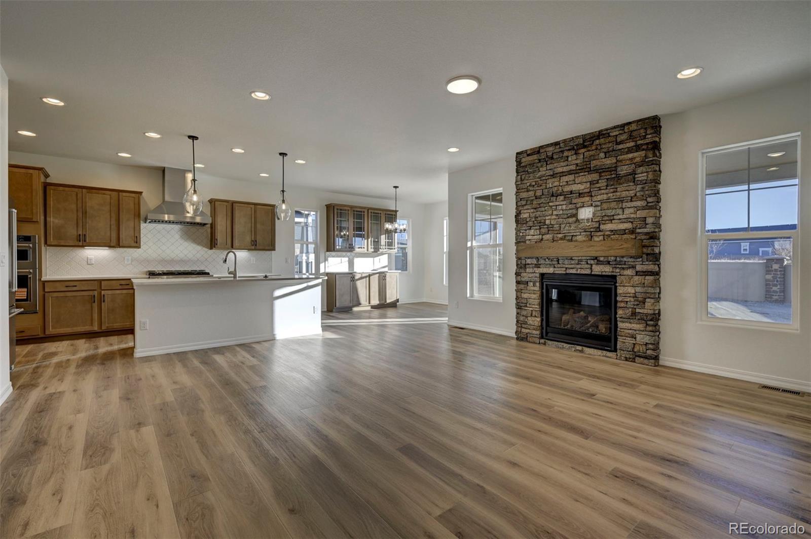 Mountain views, Backs to Open Space! This Kirkland plan is a favorite for good reason! The openness of the great room, kitchen and dining nook makes this a spacious and welcoming gathering place perfect for family and friends to connect. The gourmet kitchen features Quartz countertops, KitchenAid appliances with a 36" commercial gas range with Zephyr external vent hood, a wall oven and convention microwave combo, quiet-rated dishwasher, and counter-depth refrigerator and disposal. There are pendant lights over the island bar, under-cabinet lighting, Blando super size deep sink, oil rubbed bronze fixtures and soft-close doors and drawers (dove taildrawers), and the expanded pantry. The living area provides a focal point with the floor-to-ceiling stacked stone gasfireplace with stained box mantel. The dining area has additional storage with the beautiful custom kitchen nook cabinets.The primary suite features a 5-piece bath with separate shower and soaking tub, double vanities with quartz countertops and private water closet. There is also a spacious walk-in closet with cedar accent flooring. There is an additional bedroomand and full bath on this main level as well. The laundry has a sink and full cabinetry. The main level features an 8' entry door and 8' doors throughout the main level. Luxury vinyl plank flooring throughout the entry, living and dining rooms and kitchen tie it all together with elegance and durability, and the Iron stair spindles are a beautiful touch. The finished basement has generous 9’ foundation walls giving it an expansive and open feel and includes a rec room with wet bar that’s perfect for game nights, as well as two more bedrooms and a full bath, plus an unfinished storage area for seasonal items.The covered back patio accessed easily from the dining area is a great all-weather retreat and has an installed gas line to make grilling a breeze! With the oversized 3-car garage there’s lots of space for trucks, tools and toys.