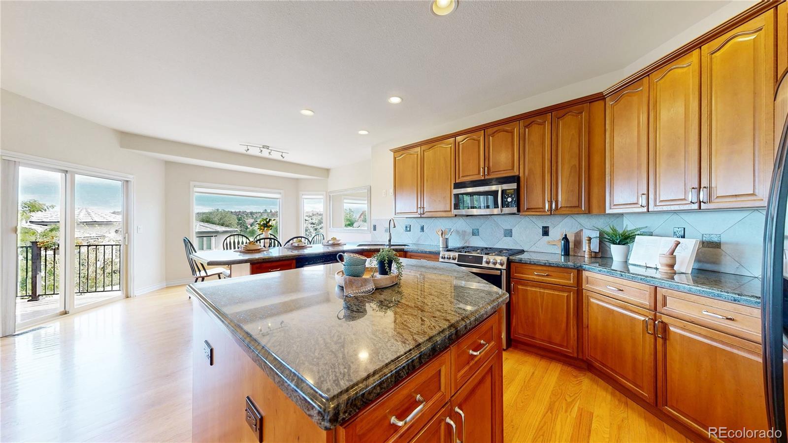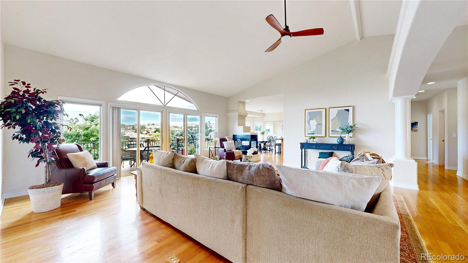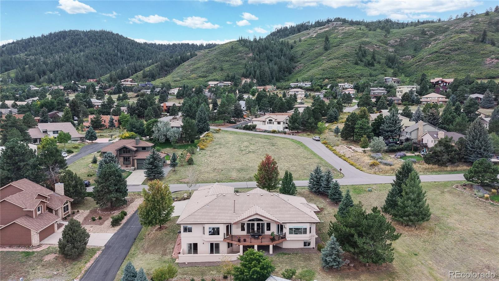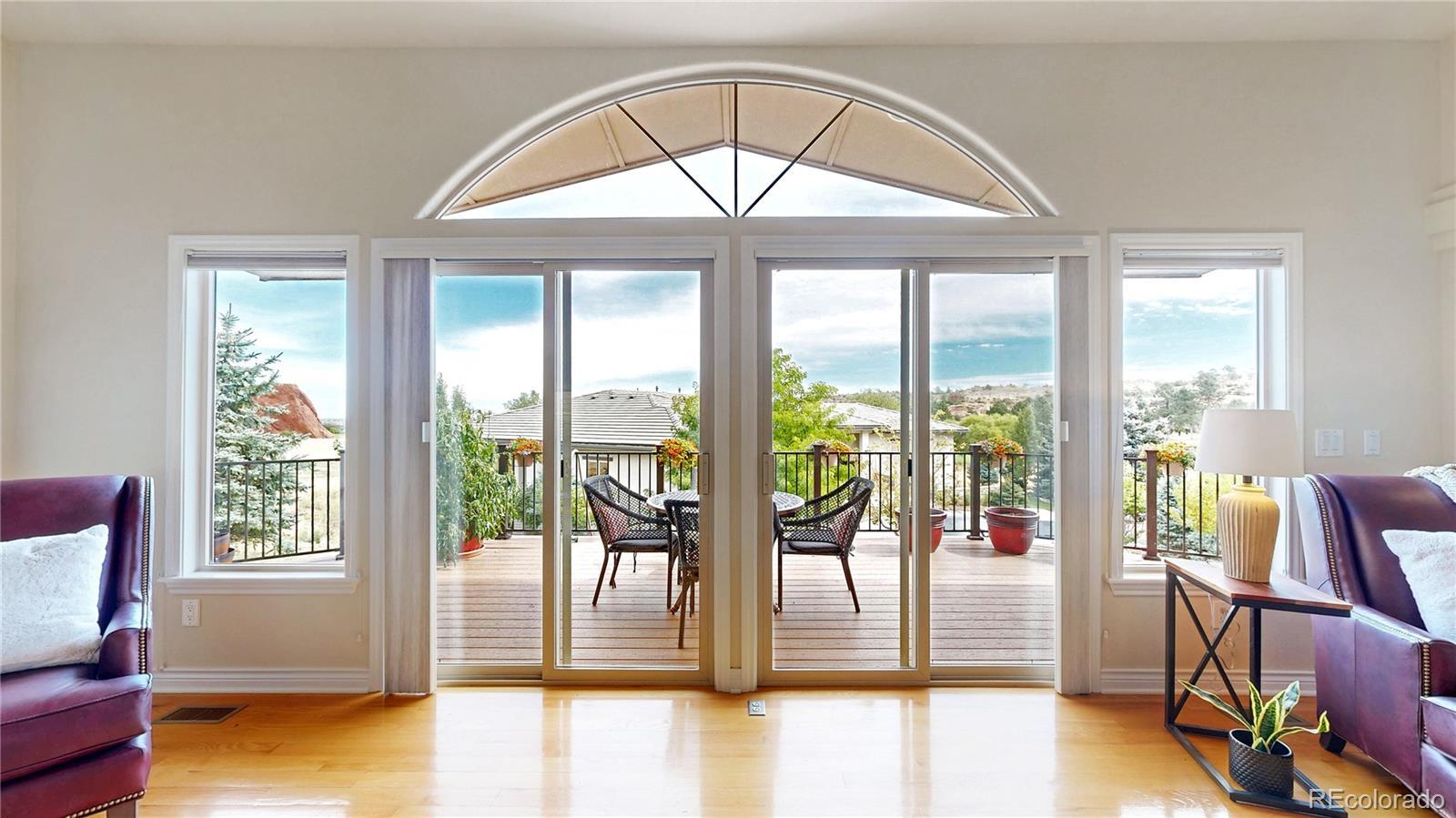 This Roxborough Park ranch-style home showcases views of Arrowhead Golf Course, ancient red rock formations, and the glittering city lights! Step inside to a spacious great room that flows seamlessly into the formal dining area-deal for hosting gatherings both large and intimate. Hardwood floors run throughout the main level, with soft carpet in the bedrooms and tile in the baths. The dining room features a convenient dry bar, a linen-drum light fixture, and space for varied table styles plus a buffet or sideboard. Just inside the foyer, a private study with French doors and custom ceiling detail creates a sophisticated home office. The gourmet eat-in kitchen impresses with slab granite counters, large island, and walk-in pantry, making it a chef’s dream. The expansive primary suite offers new carpet, a sitting area, five-piece bath, walk-in closet, and glass doors to the composite deck. The retreat easily accommodates a reading nook or second office. The updated guest bath highlights an artistic copper dragonfly sink—sure to spark conversation—and 2 secondary bedrooms share a functional Jack-and-Jill bath. The main-floor laundry includes washer, dryer, utility sink, and cabinetry for storage. The newly finished walkout level is designed for entertaining with LVP flooring, a wet bar, seating area with gas log fireplace, and recreation space perfect for a pool table, fitness area, or media setup. The spa-inspired ¾ bath adjoins a spacious guest bedroom. A workshop, large storage/utility room, and a crawlspace, ensure abundant storage. Outdoor living shines with a newer composite deck, a walled area ideal for a dog run, and a large front flagstone patio that easily hosts multiple seating groups. The three-car garage provides room for cars, toys, and tools. Siding and facing designated greenbelts, this home enjoys privacy and a wide-open feel with nature surrounding you—yet all within minutes of trails, Roxborough State Park, and conveniences.