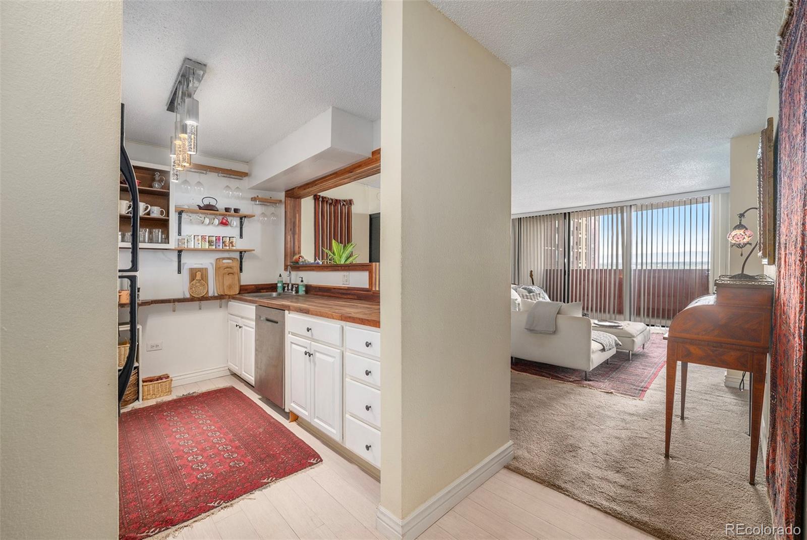 Welcome to your sky-high sanctuary—where country charm meets city convenience, and the mountains are always in view. This stylish high-rise condo starts with a private entryway (because you're fancy like that), opening into a spacious living area that feels both open and inviting. Step through your private entryway into a spacious, open-concept living area that flows beautifully into a well-appointed kitchen. With butcher block countertops, stainless steel appliances, tile flooring, and updated cabinetry, this kitchen isn’t just for show—it’s fully ready for everything from Sunday meal prep to spontaneous dinner parties. Modern lighting adds the perfect finishing touch. The living room opens to a west-facing balcony where you can take in big mountain views and even bigger sunsets—ideal for winding down, starting the day, or reminding yourself why you chose high-rise living in the first place. A versatile flex space includes a built-in Murphy bed, ideal for a home office, guest quarters, or cozy reading nook. The private bedroom is tucked away from the main living area, offering a quiet retreat with-you guessed it-more mountain views through the window. The updated full bath includes custom lighting and shelving, with just the right mix of style and function. With a unique blend of modern convenience and country appeal, this condo is a rare find in high-rise living. Don’t miss the chance to call it home!