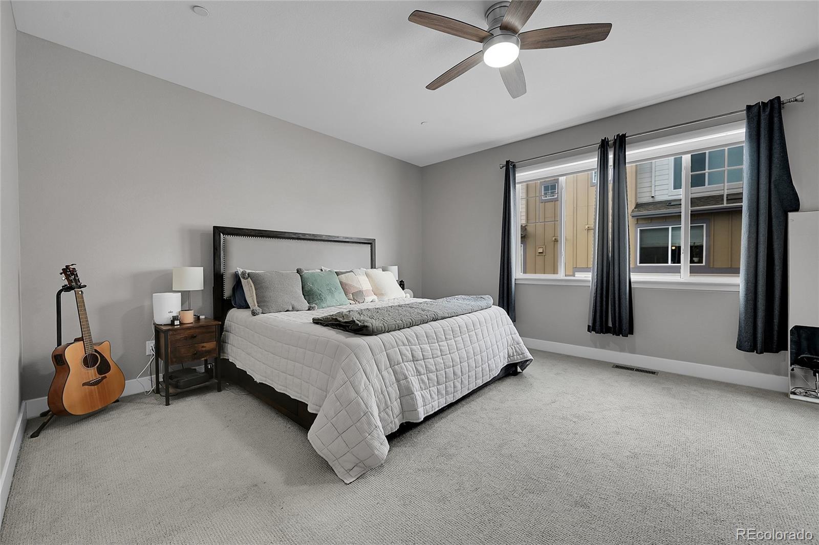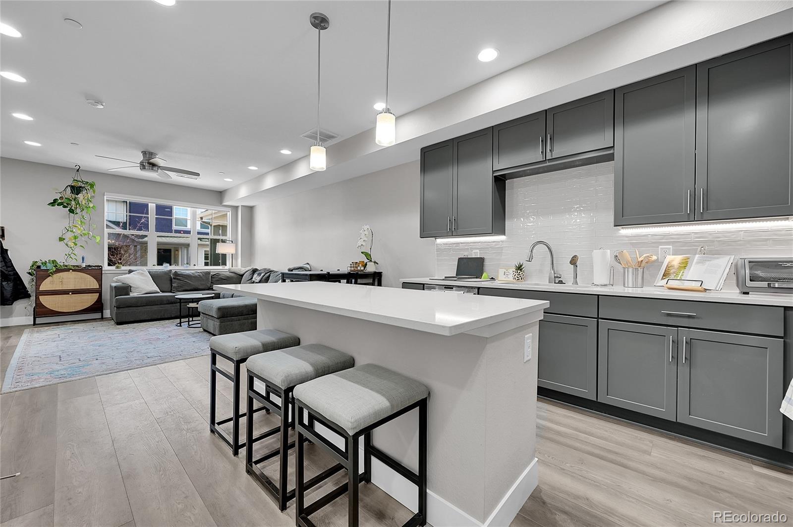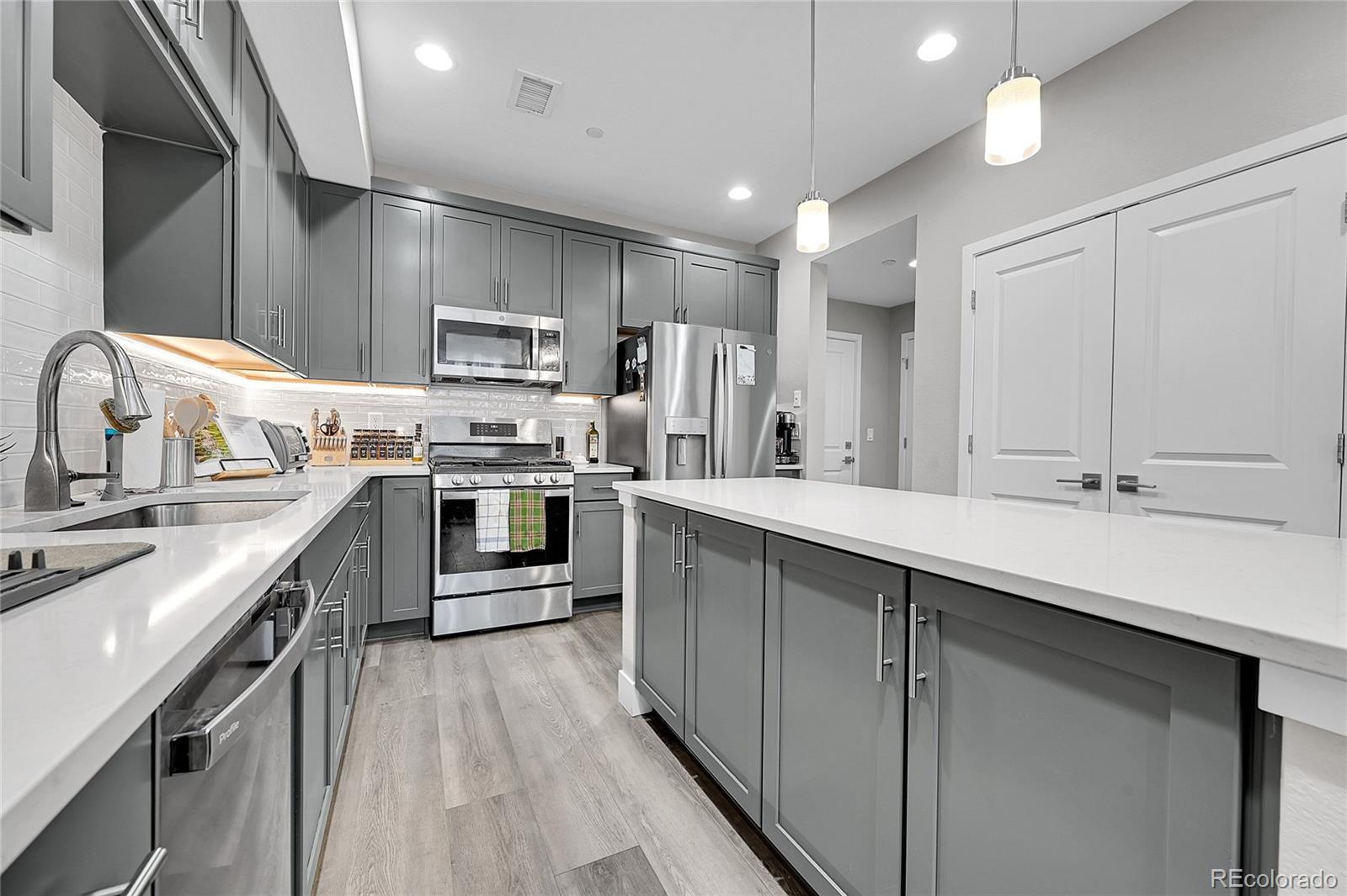 Denver too pricey, look what you can find right next door with an Wheat Ridge address! A spacious townhome with over 1660 SF in a newer development. An open floor plan where the main living space flows into the dining and kitchen seamlessly. The kitchen boasts a large island with quart counters, stainless gas range with center grill/griddle, beautiful side by side stays, a large pantry and plenty of counter space, with under cabinet lighting. Huge primary bedroom with his and her closets along with an upgraded tile shower. The second bedroom also features a full in-suite bath and is perfect for a second guest room or office. Tons of storage, including space in the spacious 2 car garage. A rare feature is a walk-in laundry room, (washer and dryer included), and a fire suppression system stalled instead of sprinklers. Edgewater Public Market, Joyride Brewery are just a couple of great places, Sloan Lake eateries are also a must.