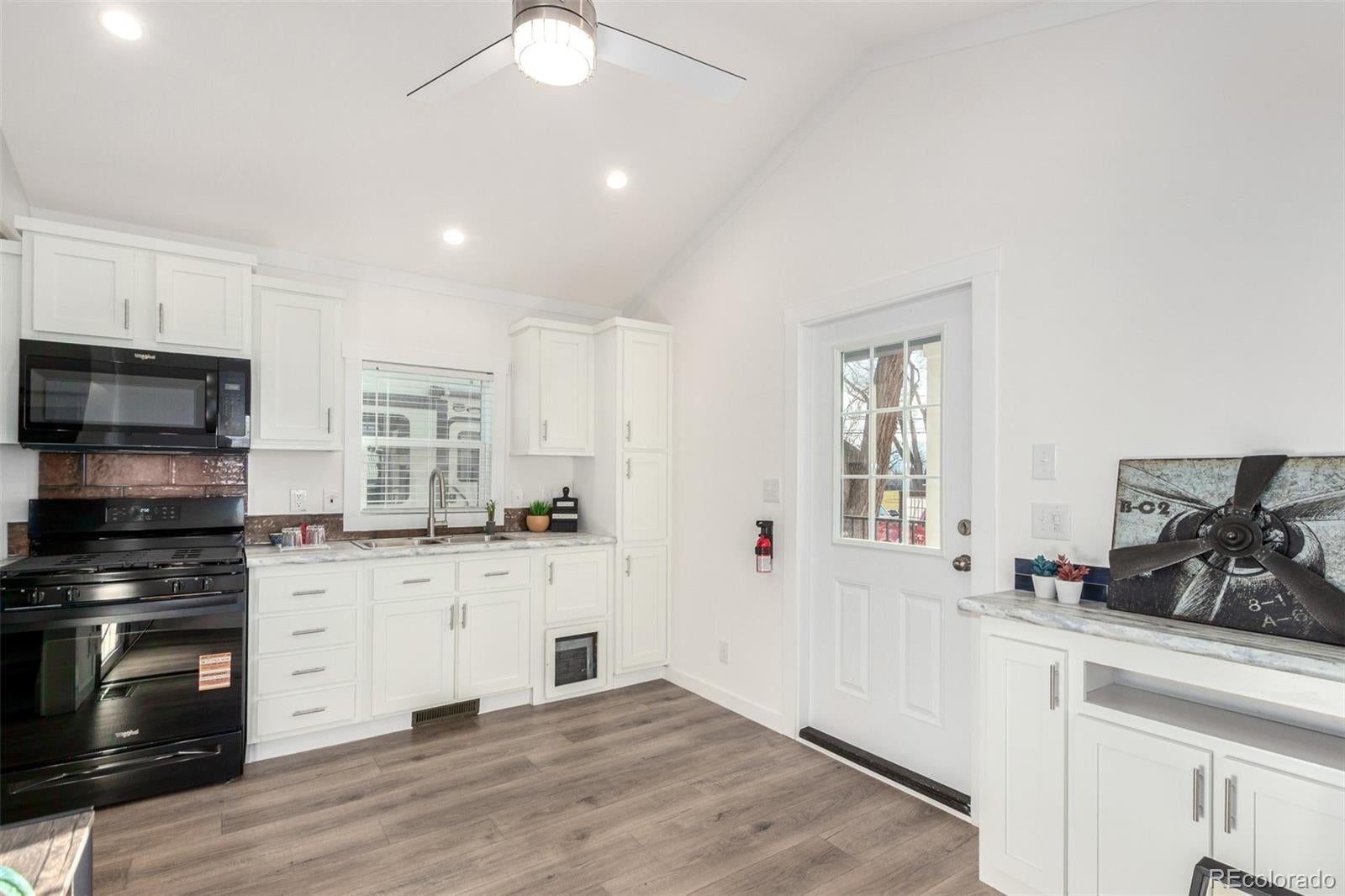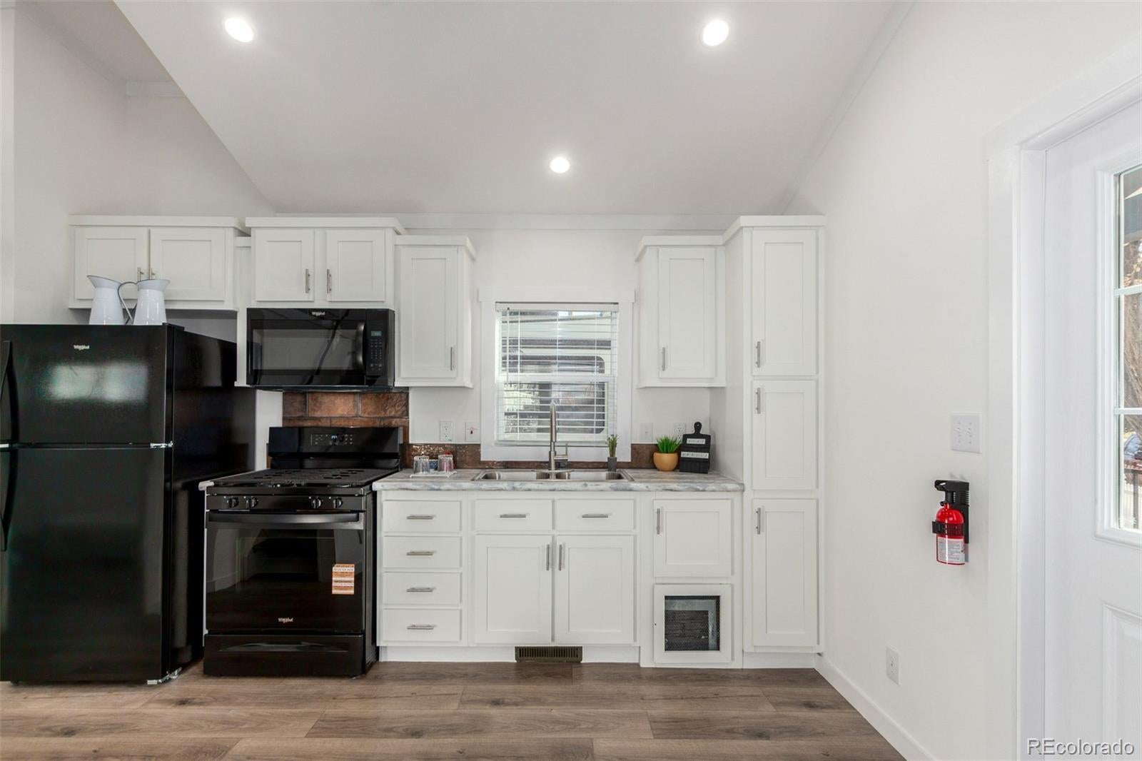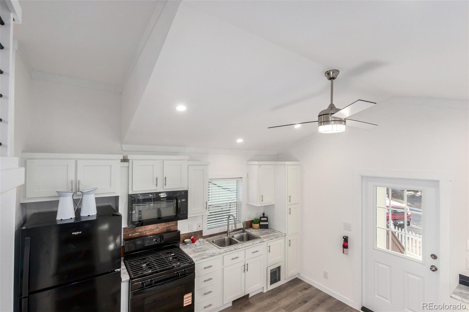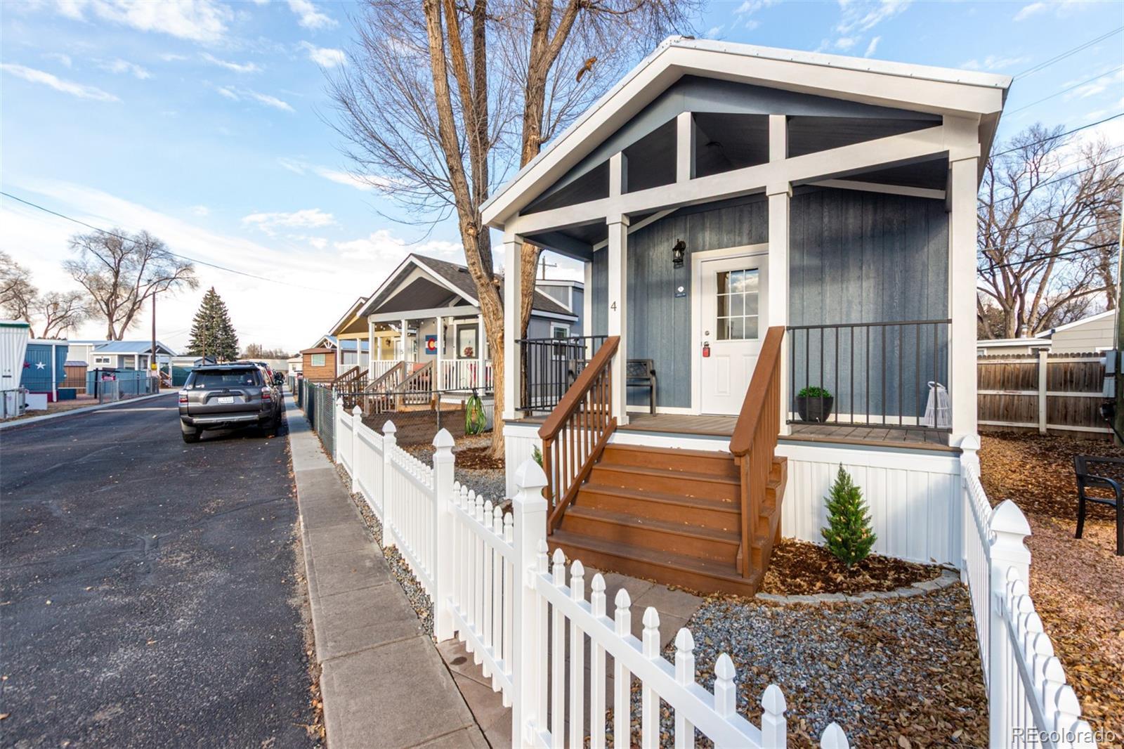Welcome to modern, simplified living in this stunning brand-new tiny home nestled in Colorado Springs Estates! This thoughtfully designed home combines contemporary style with efficient living and breathtaking views of Pikes Peak right from your covered front porch. Step inside to a bright and open floor plan featuring vaulted ceilings, recessed lighting, and luxury vinyl flooring throughout. The sleek kitchen shines with white shaker cabinetry, a chic subway tile backsplash, and modern black appliances — blending beauty and function effortlessly. Upstairs, a versatile loft area offers the perfect bonus space for lounging, an extra sleeping area, or additional storage. The bathroom is equally stylish, showcasing marble-look countertops, white cabinetry, and a full-size shower with built-in seating and sliding glass doors. The private bedroom includes smart built-ins, ample closet space, and in-home laundry hook-ups for added convenience. Outside, enjoy low-maintenance landscaping, a fenced yard, and designated parking. Located near parks, dining, and downtown Colorado Springs, this home delivers the perfect balance of comfort, simplicity, and modern design. Just minutes from Garden of the Gods, Manitou Springs, and Cave of the Winds Mountain Park, you’ll love calling this place home. Tiny living at its absolute finest — where modern design meets mountain charm!