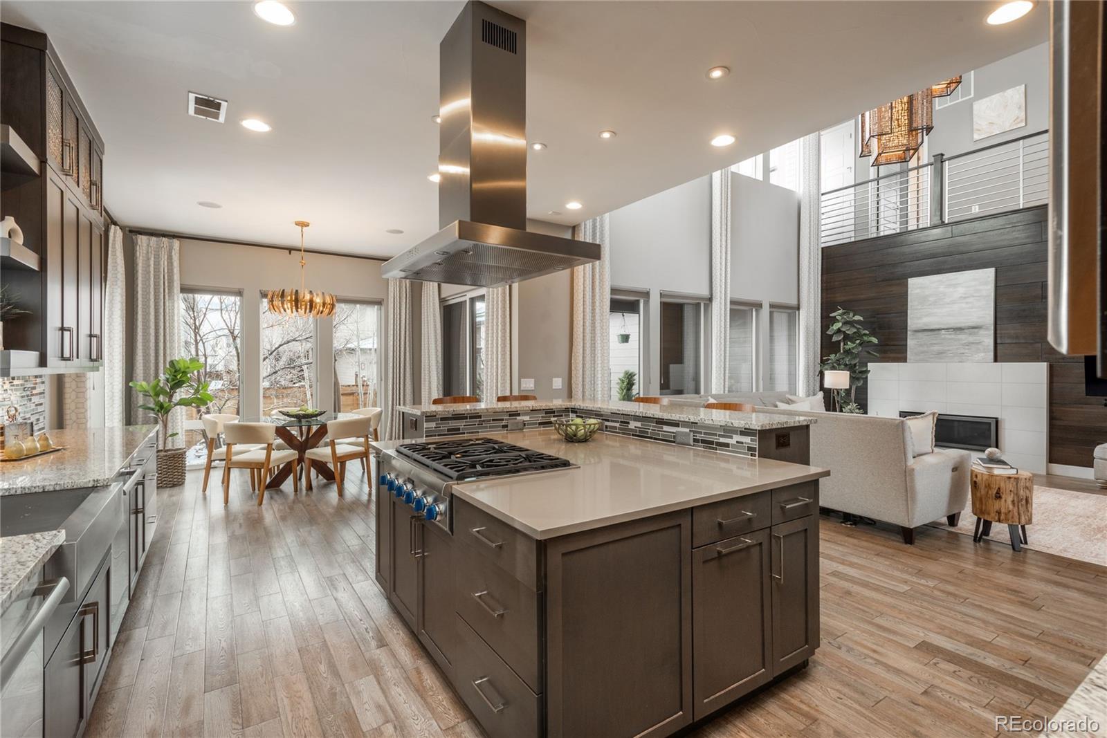 This stunning Infinity Luxe residence redefines luxury living, offering direct access to lush parks and open space just across the street. Designed for both elegance and comfort, this exceptional 6-bedroom, 6-bathroom home showcases an open-concept floor plan filled with natural light and premium upgrades throughout. The main level is ideal for both grand entertaining and intimate everyday living, featuring engineered wood flooring, hand-troweled walls, custom drapery, designer lighting, and striking stacked-stone accents. At the heart of the home, the fully upgraded chef’s kitchen impresses with full-height cabinetry, professional-grade appliances—including a 6-burner gas range—and an expansive island with ample seating. A custom walk-in pantry and charming breakfast nook complete this culinary space. The inviting living room centers around a custom stone fireplace and wood-paneled feature wall, seamlessly opening to the covered patio through oversized sliding doors. An elegant dining room and a private office with French doors provide flexibility for modern living. A main-floor guest suite and a stylish powder room complete this level. Upstairs, the luxurious primary retreat features a spa-inspired five-piece bath with a soaking tub, steam shower, and a custom walk-in closet. Three additional bedrooms include one en-suite and two connected by a Jack-and-Jill bath. A convenient upstairs laundry room and a spacious bonus room—currently used as a gym—add exceptional versatility. The finished basement is designed for entertainment, offering a full wet bar/kitchen, a guest suite, and a media room equipped with a 98" Sony 4K TV and built-in 8-speaker surround sound system. Outdoors, professionally designed landscaping creates a private year-round oasis with drip irrigation, a covered patio, built-in grill, pergola-covered hot tub, koi pond, mature trees, and ambient accent lighting—perfect for relaxing or entertaining in every season.