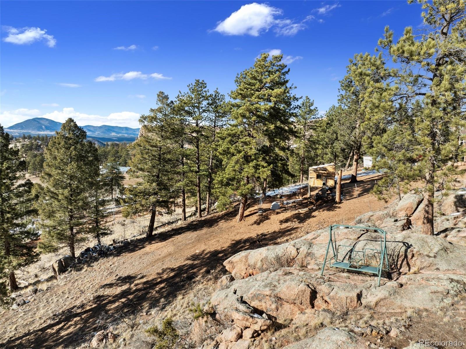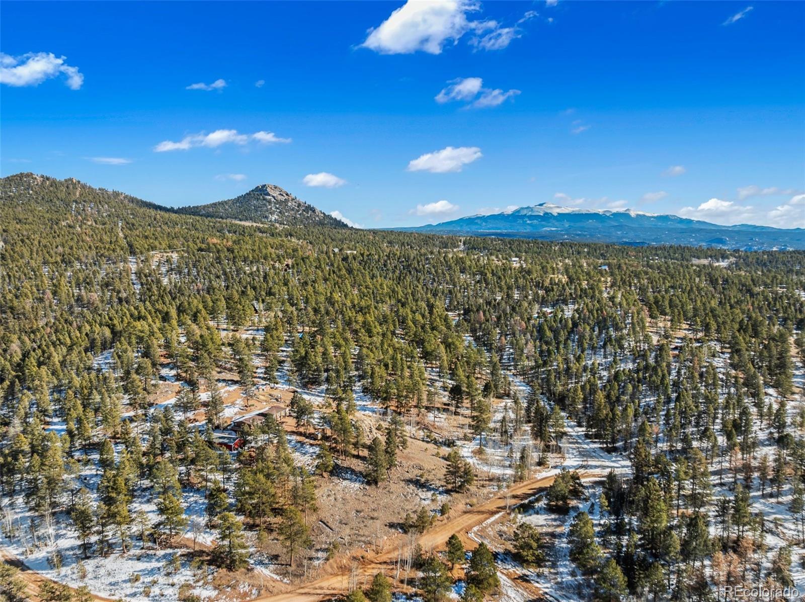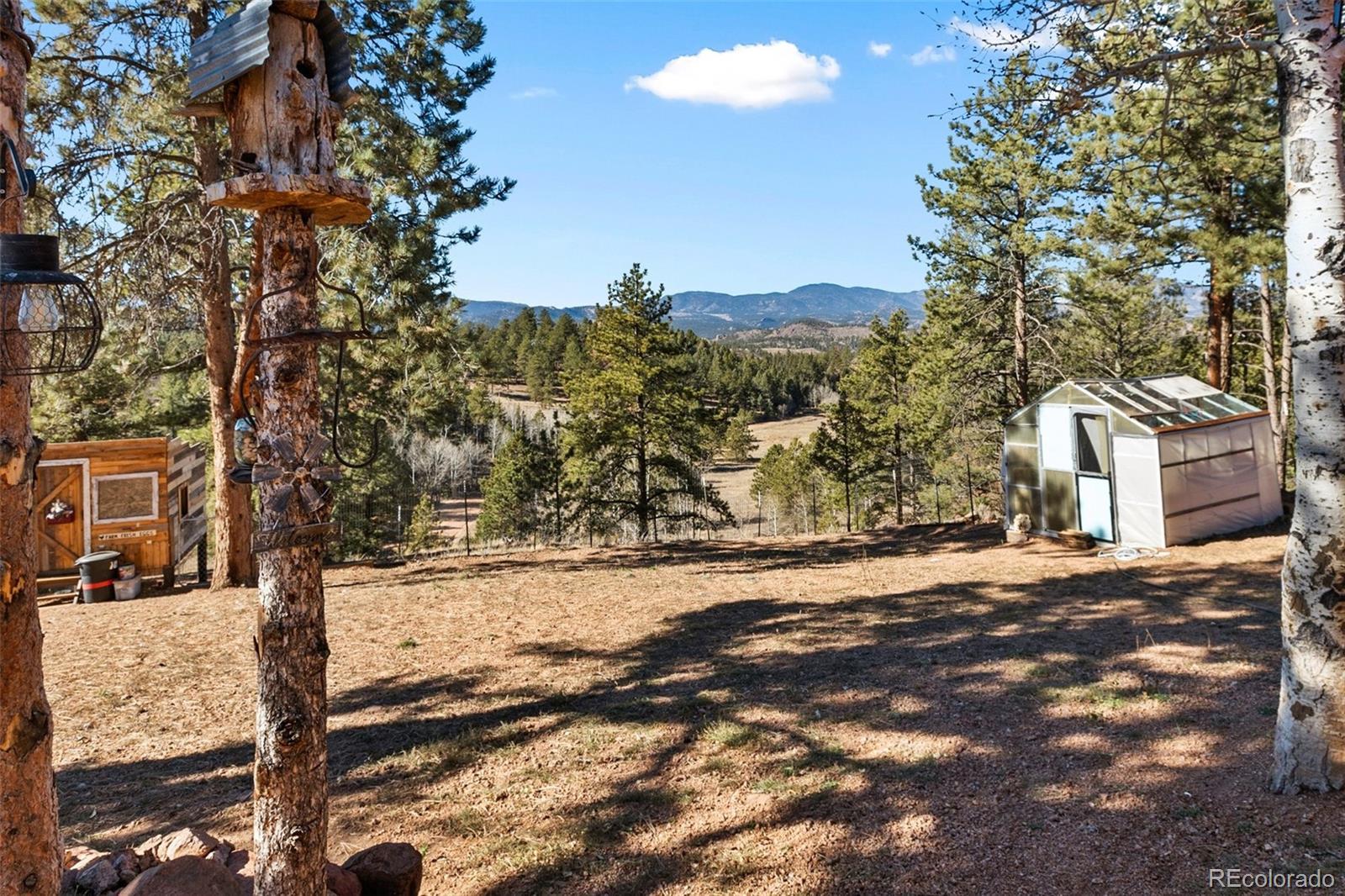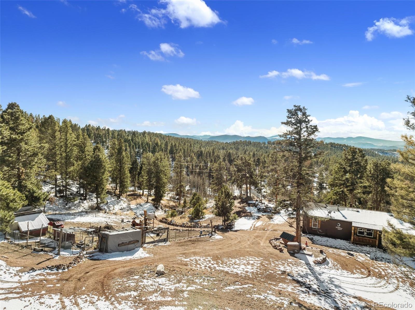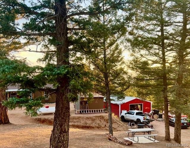 Serene mountain escape set-up with almost 5 acres, located just moments away from National Forest access trails for endless hiking, & recreating! Situated among the trees in a peaceful, tranquil setting and just 25 minutes from Woodland Park, 5 minutes from Highway 24, & only 1 hour to snow skiing, & just 10 minutes to trophy trout fishing in Eleven Mile Canyon! Spacious one level living w/ living area and family room areas, the home has been remodeled in 2020 w/ a "country charm", including a new free-standing wood-burning stove in the family room set in a masonry stacked rock hearth, w/ sheet metal backing; Beetle kill knotty pine tongue and groove; barn wood shiplap accent walls and doors; Mini split A/C and heater in family room; large owners suite adorned w/ electric wall fireplace, attached to 5pc bath w/ a freestanding soaking tub, and two walk-in closets; Kitchen includes stainless appliances, & Butcher block and granite countertops; dining area is surrounded by sheet metal chair rail; Re-roofed in 2018; new rustic redwood covered deck; new exterior paint; covered rear wraparound deck w/ awning & new deck spindles, overlooking views to the South and Western sunsets; Additional features include new electrical service to house; new 24' x 50' pole barn/shop w/ an attached studio apartment living quarters w/ shiplap walls, wood ceilings, and 3/4 bath; 2 heated chicken coops; livestock fenced area with electricity and water running to the pen; greenhouse; Lookout at "Pride Rock" w/ firepit, and electrical in place, in addition to a seating area; RV parking, and beautifully maintained and fire mitigated 5 acres, with a circular driveway; 2/3 of the yard is fenced on the perimeter; Septic was pumped Fall 2024. Voluntary HOA; This property is set-up as a small ranchette and ready for your livestock, pets, and the whole family! Comfortably set-up for a wonderful mountain escape! Adjacent vacant land parcel is also available for sale under MLS #3229859.