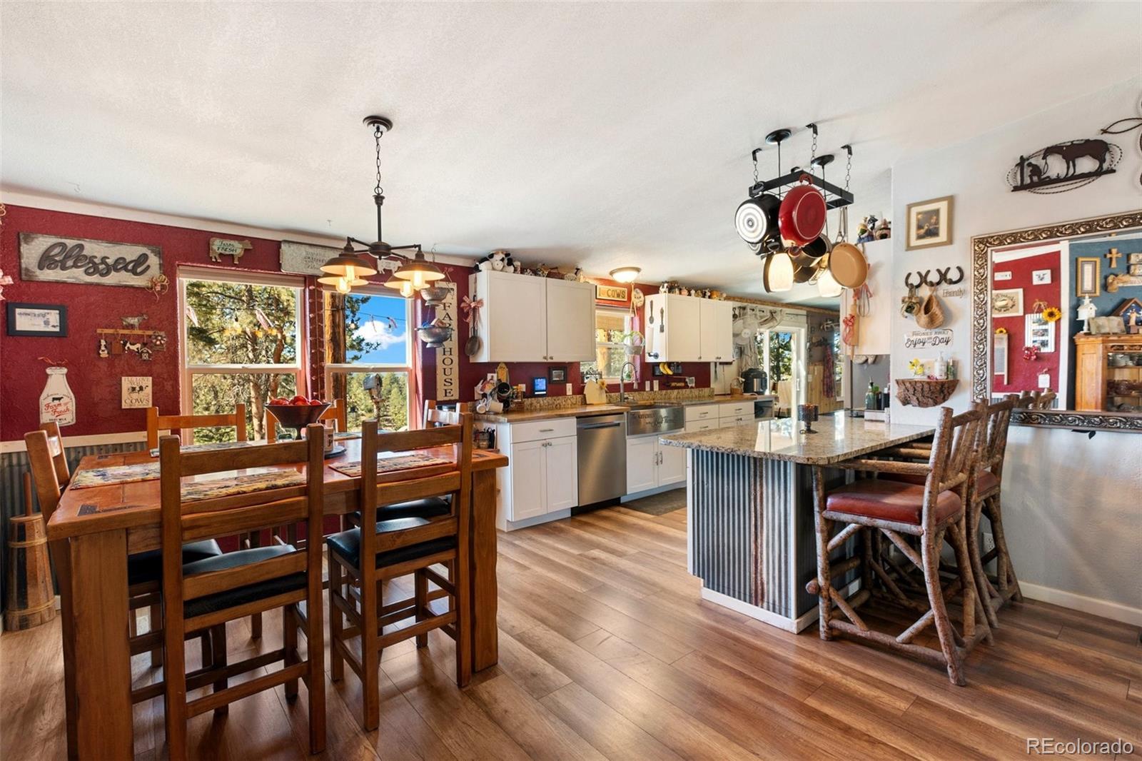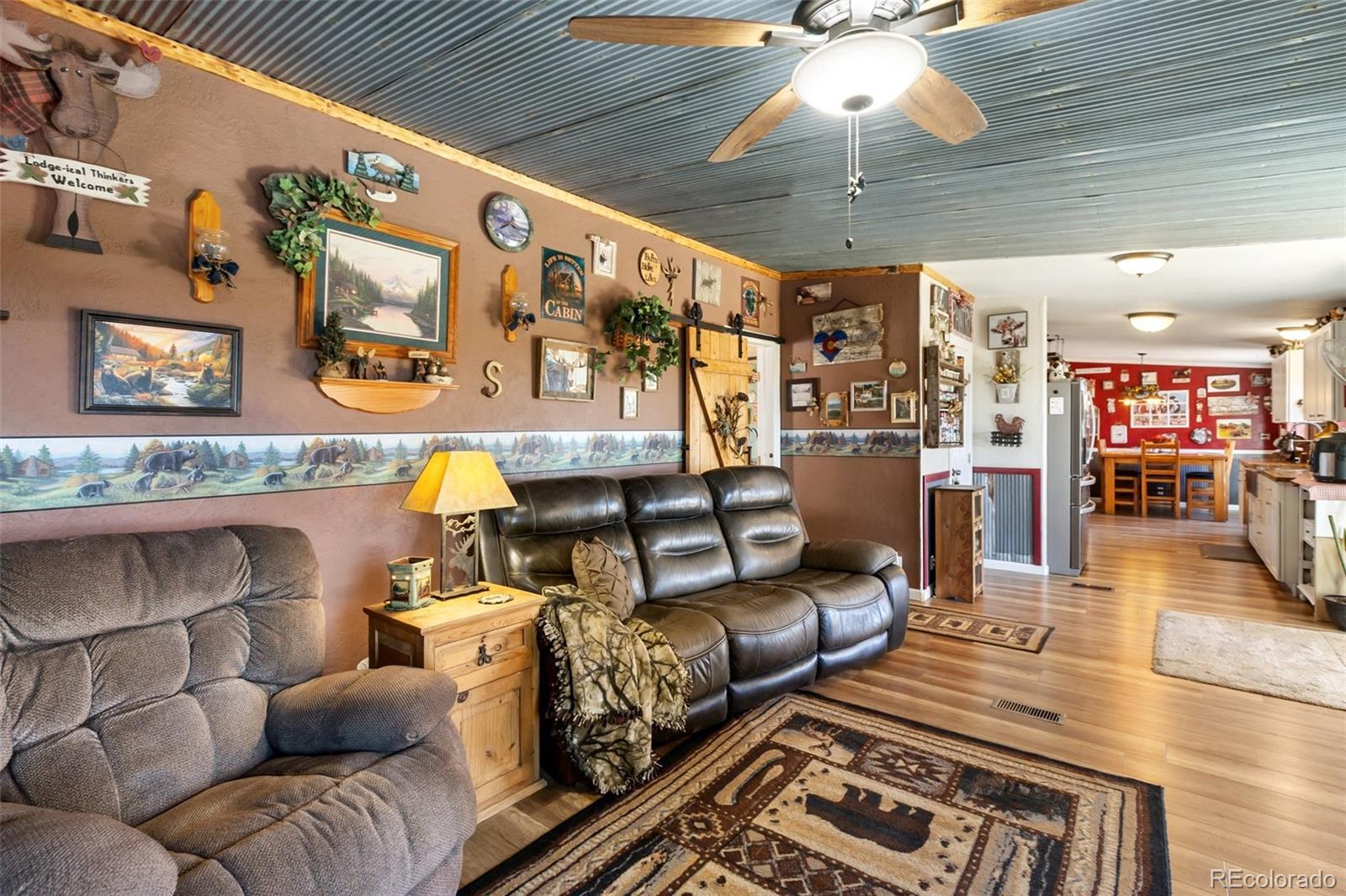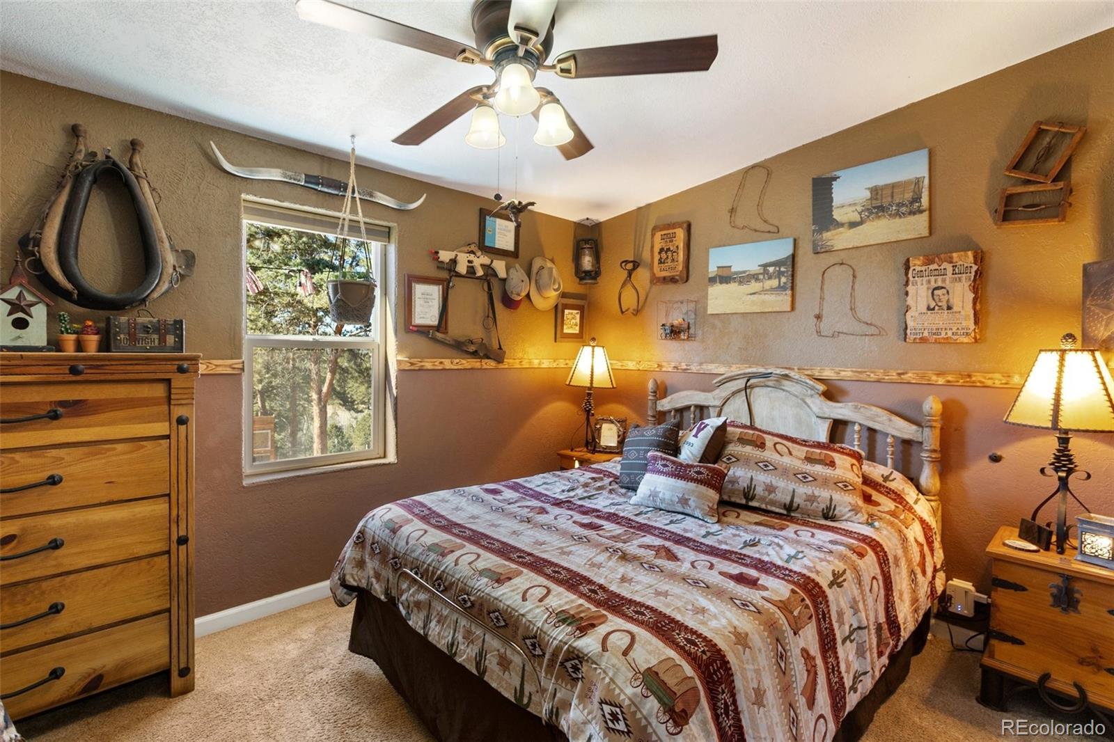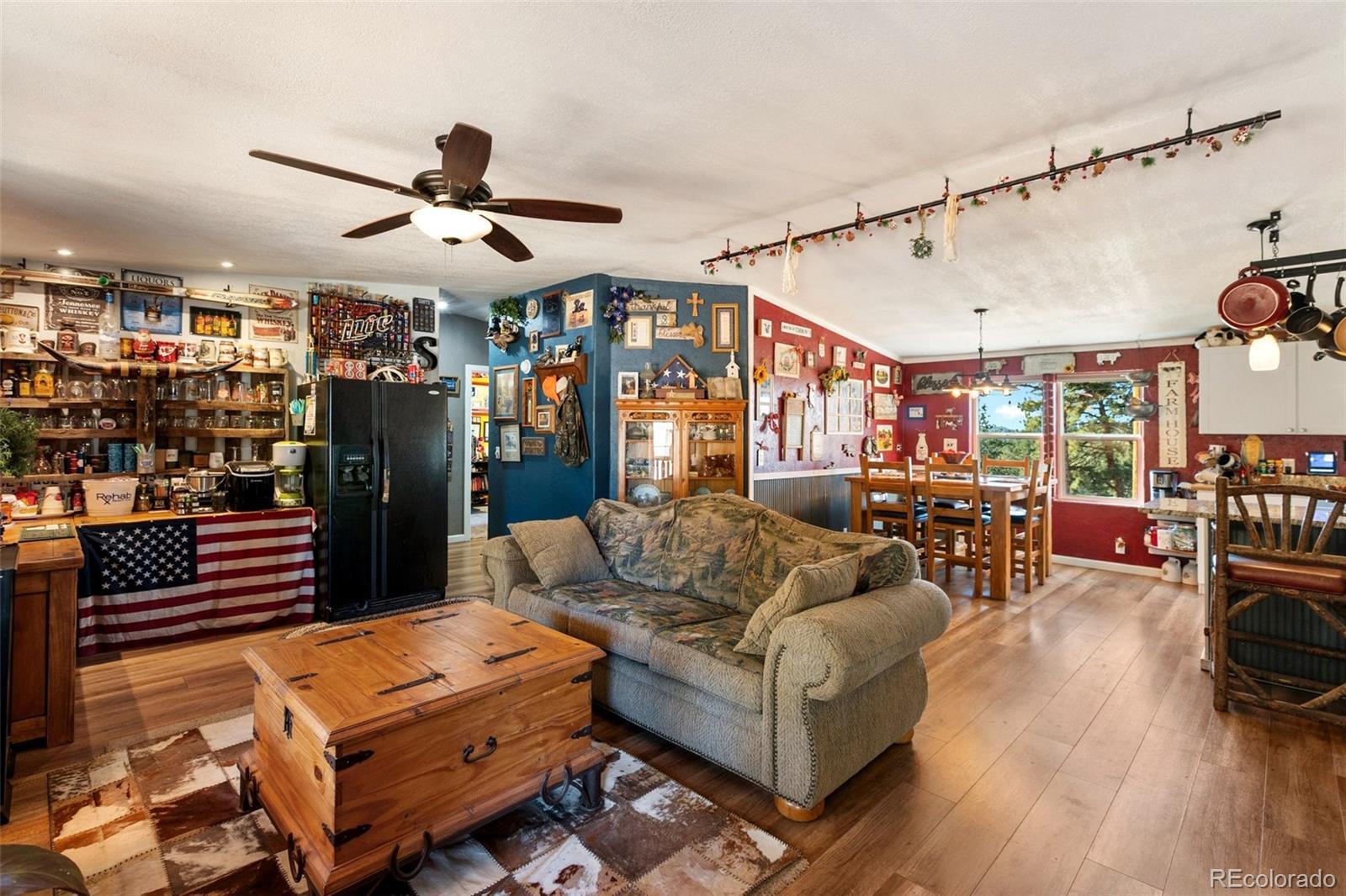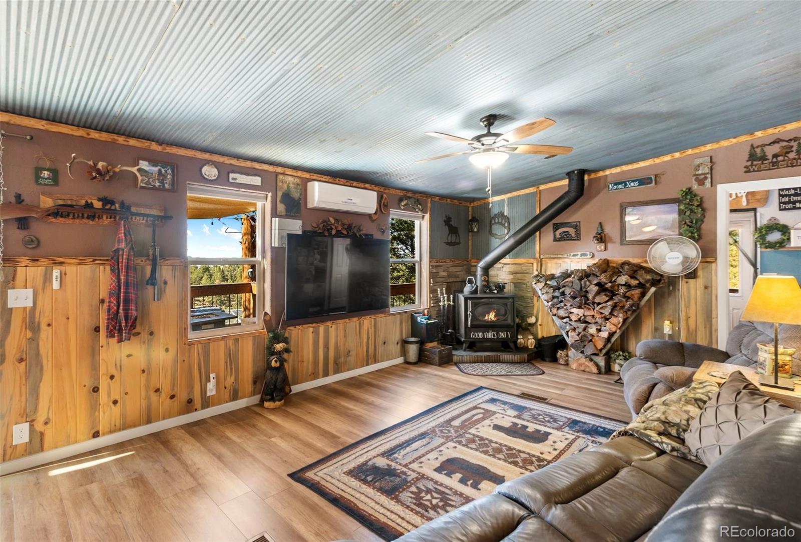 Serene mountain escape set-up with almost 5 acres, located just moments away from National Forest access trails for endless hiking, & recreating! Situated among the trees in a peaceful, tranquil setting and just 25 minutes from Woodland Park, 5 minutes from Highway 24, & only 1 hour to snow skiing, & just 10 minutes to trophy trout fishing in Eleven Mile Canyon! Spacious one level living w/ living area and family room areas, the home has been remodeled in 2020 w/ a "country charm", including a new free-standing wood-burning stove in the family room set in a masonry stacked rock hearth, w/ sheet metal backing; Beetle kill knotty pine tongue and groove; barn wood shiplap accent walls and doors; Mini split A/C and heater in family room; large owners suite adorned w/ electric wall fireplace, attached to 5pc bath w/ a freestanding soaking tub, and two walk-in closets; Kitchen includes stainless appliances, & Butcher block and granite countertops; dining area is surrounded by sheet metal chair rail; Re-roofed in 2018; new rustic redwood covered deck; new exterior paint; covered rear wraparound deck w/ awning & new deck spindles, overlooking views to the South and Western sunsets; Additional features include new electrical service to house; new 24' x 50' pole barn/shop w/ an attached studio apartment living quarters w/ shiplap walls, wood ceilings, and 3/4 bath; 2 heated chicken coops; livestock fenced area with electricity and water running to the pen; greenhouse; Lookout at "Pride Rock" w/ firepit, and electrical in place, in addition to a seating area; RV parking, and beautifully maintained and fire mitigated 5 acres, with a circular driveway; 2/3 of the yard is fenced on the perimeter; Septic was pumped Fall 2024. Voluntary HOA; This property is set-up as a small ranchette and ready for your livestock, pets, and the whole family! Comfortably set-up for a wonderful mountain escape! Adjacent vacant land parcel is also available for sale under MLS #3229859.