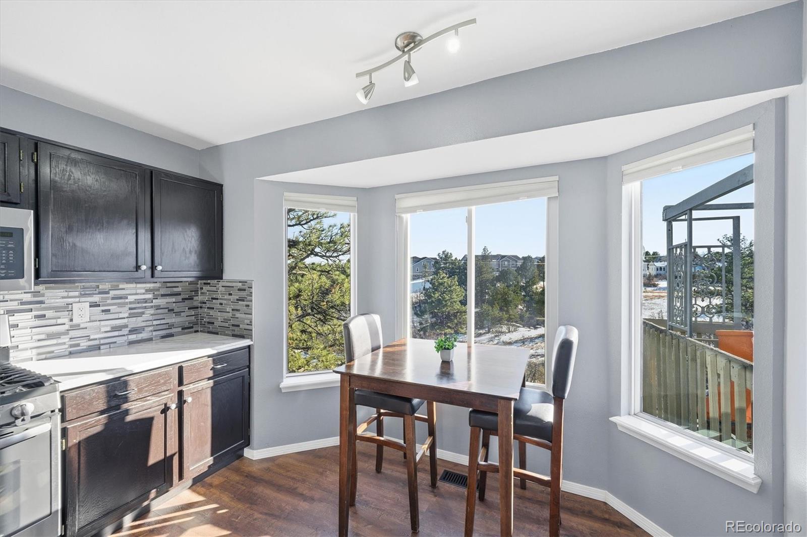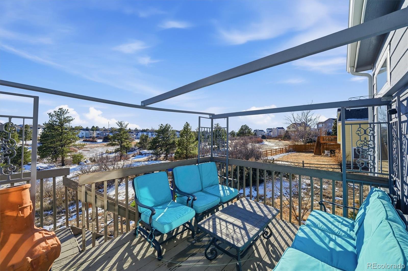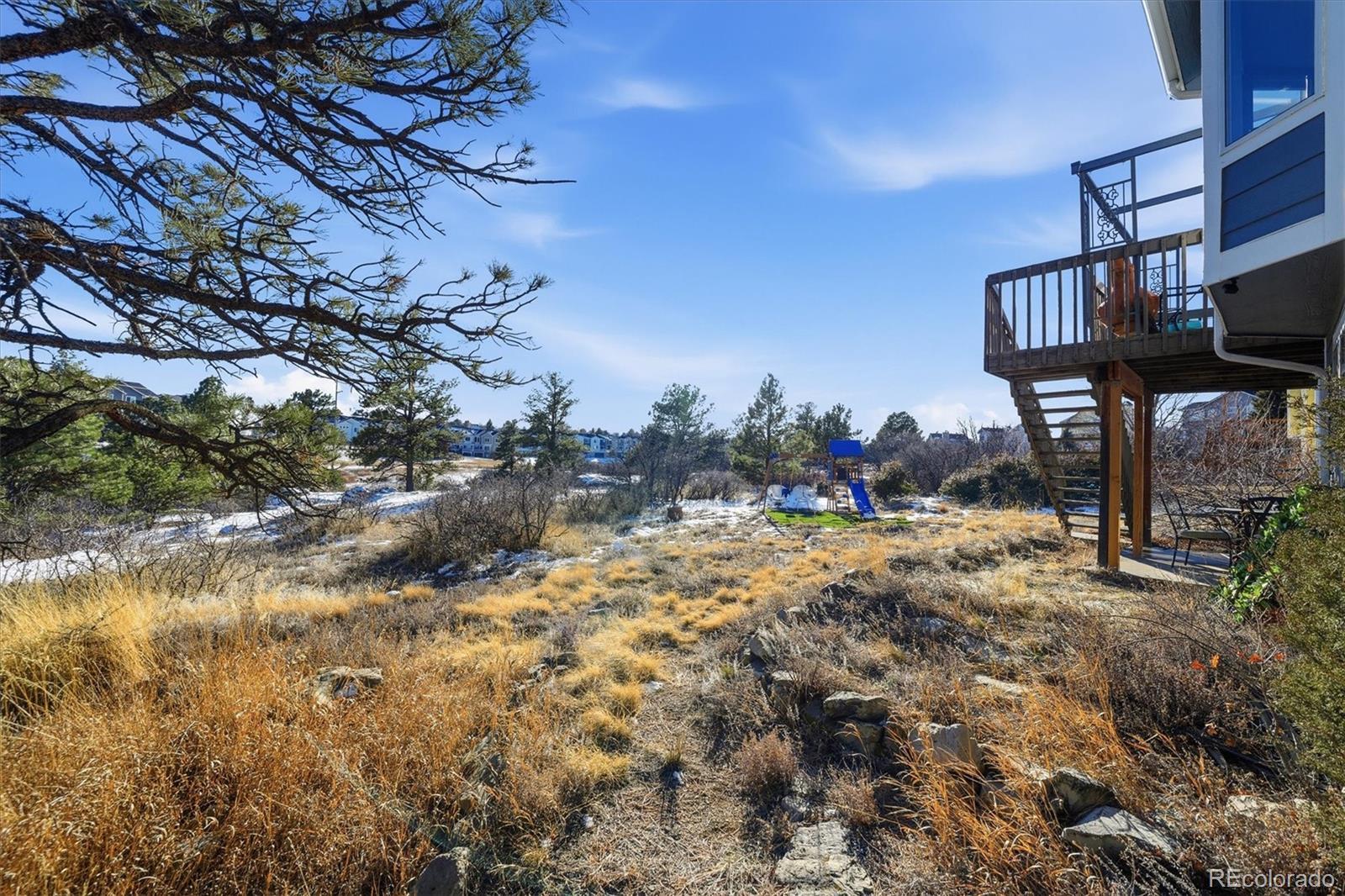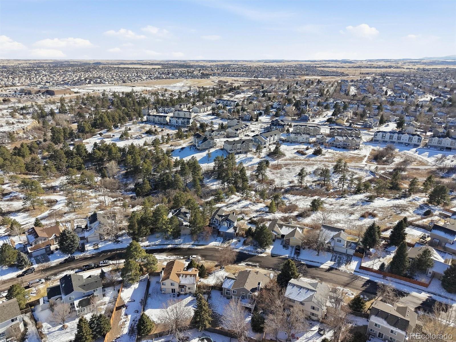 Perfect for entertaining and embracing true Colorado living, this light filled home backs to open space with rare, unobstructed views. Vaulted ceilings and oversized windows fill the home with natural light, while two fireplaces create warmth and ambiance for memorable Colorado days and cozy nights. From the breakfast nook, enjoy peaceful mornings and wildlife watching as expansive windows frame the surrounding natural landscape, creating a true sense of privacy and connection to nature. The open floor plan flows effortlessly from the great room to the dining room, centered around a shared two sided fireplace, with a hall leading to the kitchen for easy entertaining and everyday family living. A walk out basement opens to the patio, extending the living space outdoors and enhancing the home’s indoor outdoor lifestyle. The primary bedroom features vaulted ceilings, French doors, and a walk in closet. The main level includes a convenient half bath. Additional highlights include Champion windows with sliding screens, abundant storage throughout, a newer roof replaced in 2024 with transferable warranty, and a xeriscape front yard with drip system and planters for low maintenance curb appeal. Located near trails, many parks, Castlewood Canyon, pickleball courts, frisbee golf, and a community pool, this is a true gem offering Colorado living, entertaining, and family at its best, surrounded by privacy, views, and natural beauty.