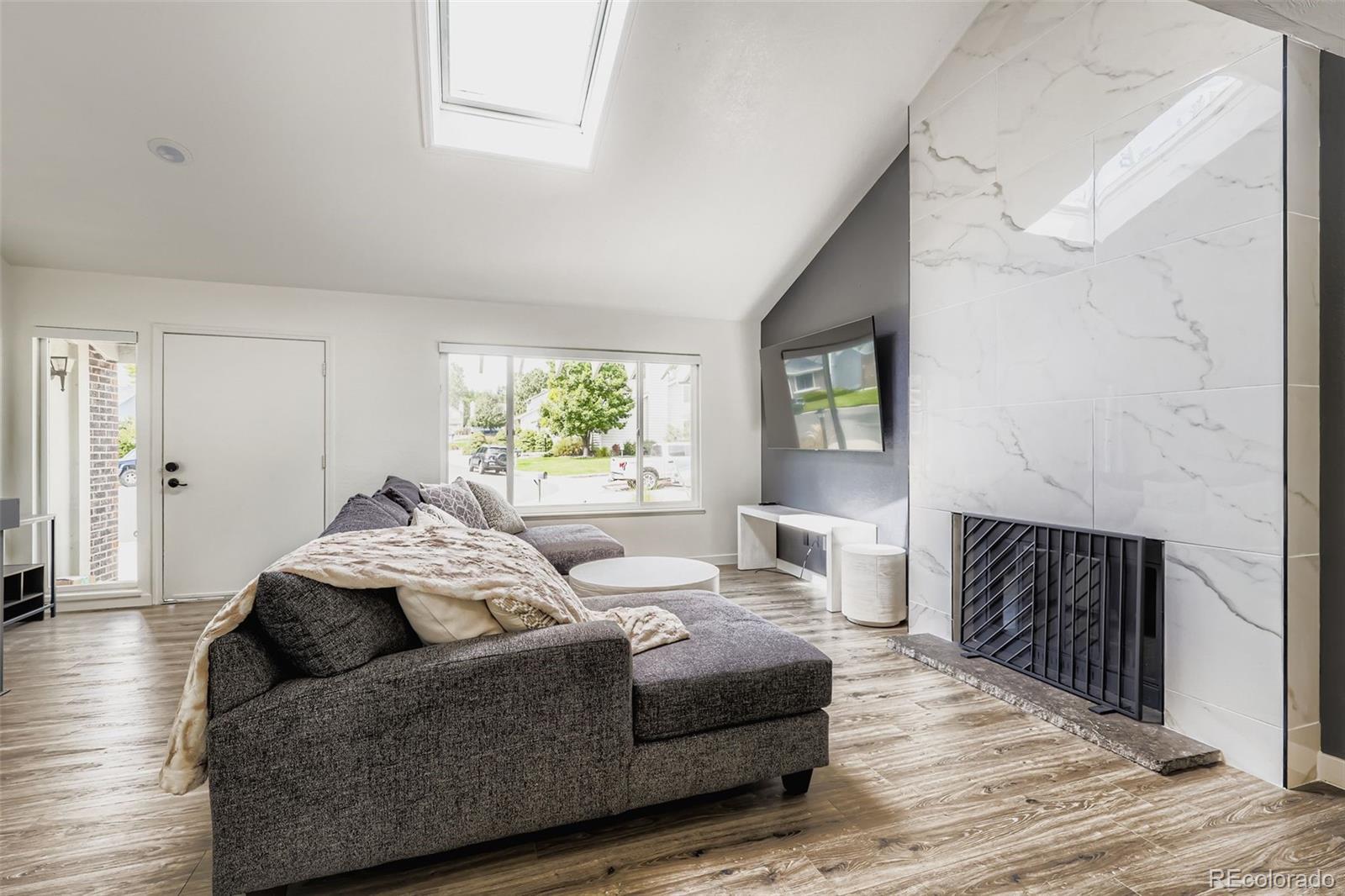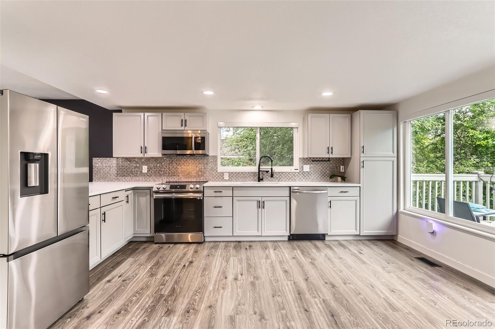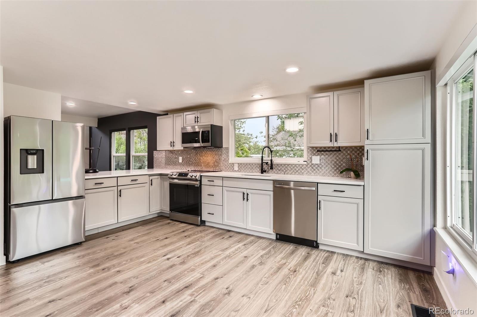 Rare Opportunity in Cherry Creek Farm... Fully Renovated Ranch with Walkout Basement on Open Space! Tucked away on a serene street in the sought-after Cherry Creek Farm community, this one-of-a-kind home backs to scenic greenbelt views and peaceful walking trails. From the moment you arrive, the curb appeal stands out with professionally designed front and back yard landscaping. Step inside and be welcomed by soaring ceilings, a skylight that invites in even more natural light, and expansive new windows that bring the outdoors in. Premium automated window treatments add modern convenience with a touch of luxury. The open-concept layout is ideal for both daily living and entertaining. Anchoring the main level is a striking marble fireplace in the spacious living area. The showstopping chef’s kitchen is loaded with upgrades like quartz countertops, custom backsplash, elegant cabinetry with designer hardware, an oversized island with bar seating, and a full suite of stainless appliances including a French door fridge. This home offers 5 generous bedrooms and 3 fully updated baths, with flexible spaces that suit any lifestyle, think home office, media room, gym, or guest suite. The primary retreat features a spa-inspired bath and custom walk-in closet. The finished walkout basement opens to a tranquil backyard haven that is ideal for gatherings, quiet mornings, or evening sunsets. Whether you're enjoying the deck overlooking the greenbelt or shaded patio, this private lot makes every moment feel special. Just minutes to DTC, top-tier dining and retail, and located within the award-winning Cherry Creek School District. This quiet street is walking distance to Cherry Creek Academy (less than a block.) High Plains Elementary is only .7 miles, less if walking, and Cherry Creek High School. Truly move-in ready, this home is packed with thoughtful upgrades throughout.
