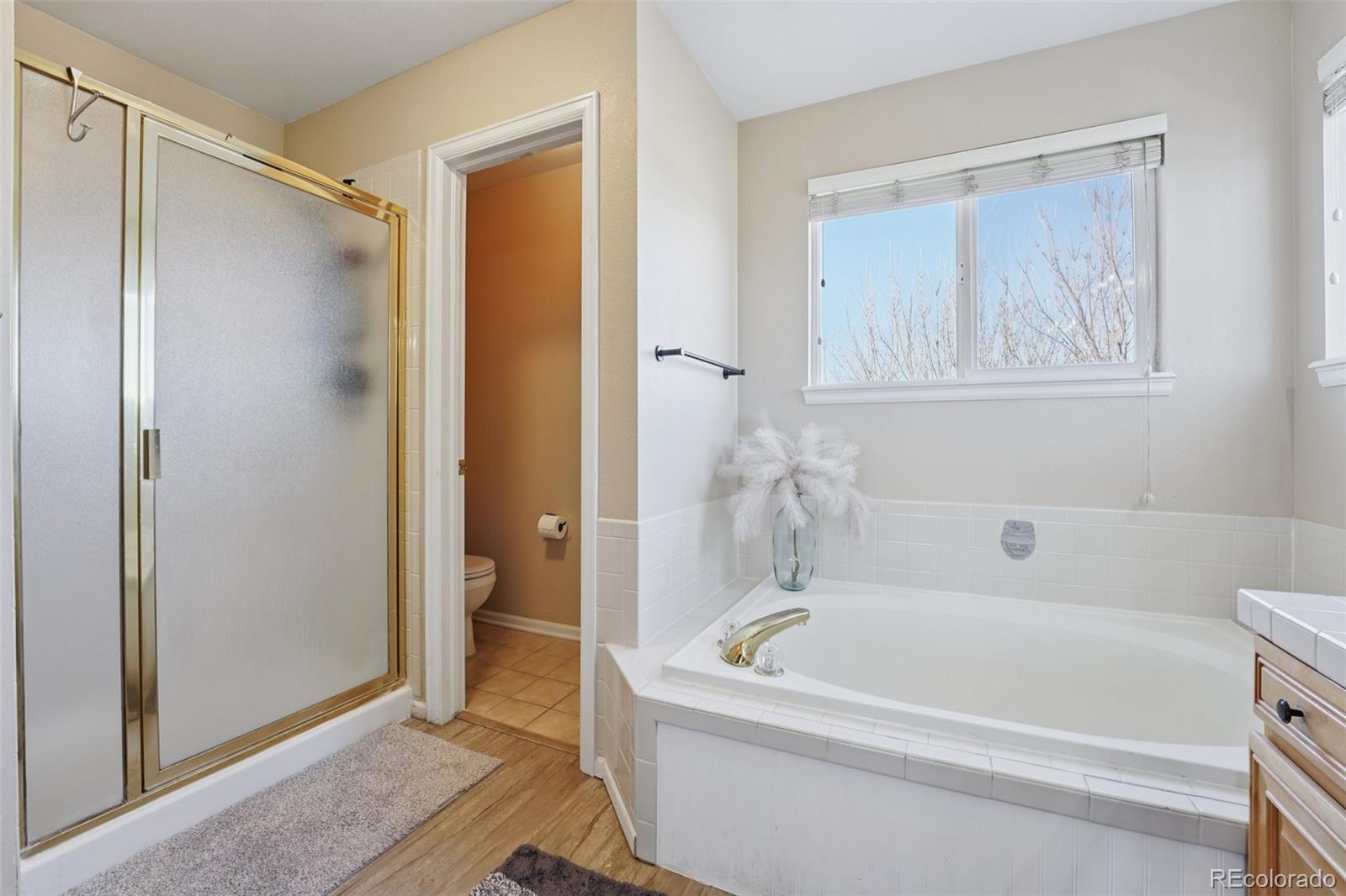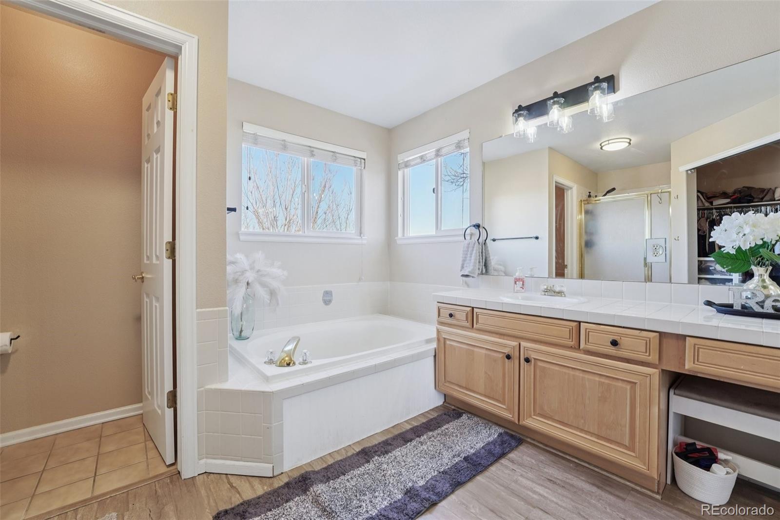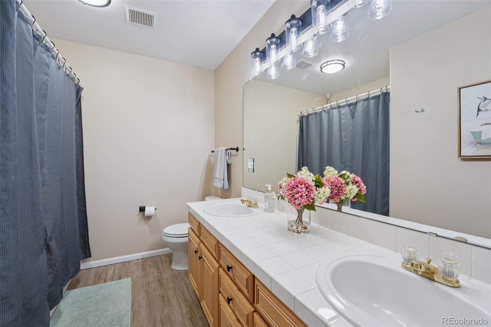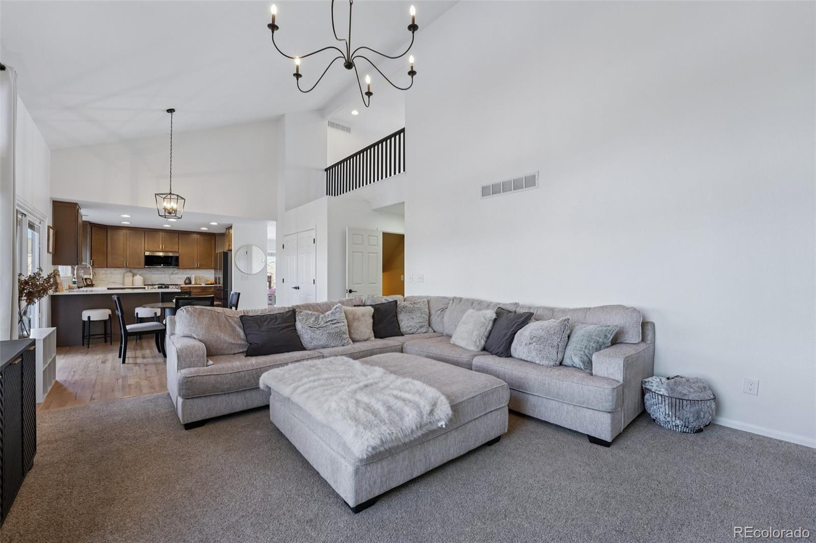 This beautifully updated home offers a wonderful, functional floorplan paired with thoughtful upgrades throughout. The main level features brand-new hardwood floors, fresh interior paint, and a bright, inviting layout with a separate formal dining room, living room, and a spacious family room showcasing vaulted ceilings and a cozy gas fireplace. The kitchen has been refreshed with new cabinetry topped with crown molding, new countertops, and updated lighting, creating a modern and welcoming space for everyday living and entertaining. Upstairs, the spacious primary suite impresses with vaulted ceilings and a luxurious five-piece en suite bath. Additional updates include new carpet, new countertops in all bathrooms, and a new A/C installed in 2022 for peace of mind. The finished basement expands your living space with a designated office, wet bar with wine fridge, and plenty of room to relax or entertain. Step outside to enjoy the extended poured patio and new back patio overhang, perfect for outdoor gatherings. A radon mitigation system is already in place, completing this move-in-ready home that blends comfort, style, and smart upgrades throughout. Located within the desirable Cherry Creek School District and conveniently close to Southlands Mall, E-470, and Gun Club Road, this home blends comfort, style, and smart upgrades in a prime location. Don’t miss your chance to schedule a tour!