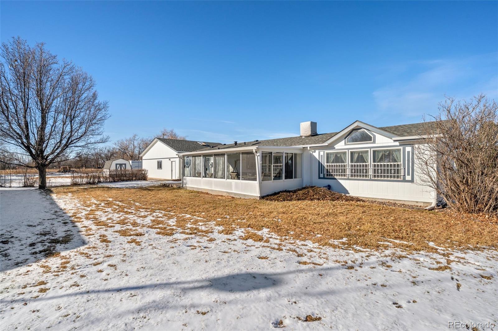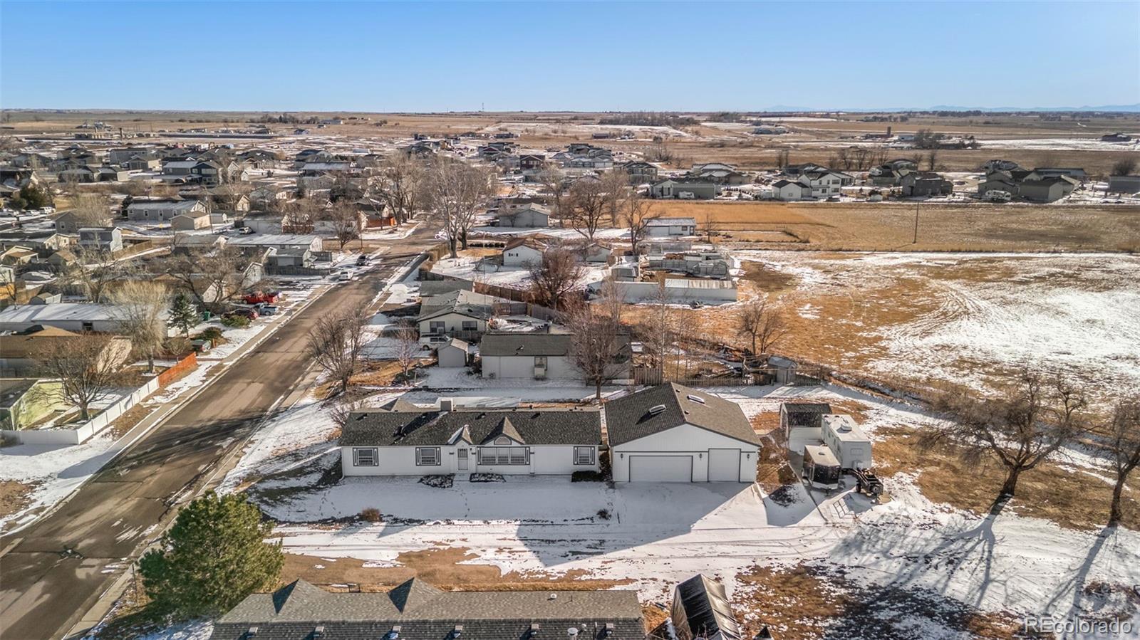 Situated on a quiet cul-de-sac in Hudson, this well-located property offers space, flexibility, and excellent access for a variety of needs. The home features vaulted ceilings and a bright, southern-facing sunroom that captures natural light throughout the day. The split-bedroom floor plan places two secondary bedrooms on one side of the home, with the primary suite thoughtfully separated on the opposite side, providing added privacy and functional living space. This layout is complemented by an open floor plan that connects the kitchen, dining, and living areas, creating a cohesive and comfortable central living space. Enjoy open views toward the mountains, with the property backing to an irrigation ditch that adds separation and a sense of openness behind the home. A standout feature is the oversized detached three-car garage, including one extra-tall door ideal for accommodating a large truck, work vehicle, or recreational equipment. The circular end of the street and generous turnaround area near the garage provide exceptional access and maneuverability, making entry and exit easy even for larger vehicles. In addition, the rear of the property offers multiple parking options with space to accommodate a horse trailer, RV, and camper simultaneously. Set on a spacious lot with room to breathe, this property combines functional outdoor space with practical improvements, offering a unique opportunity for buyers seeking land, utility, and strong access in a small-town setting with Front Range proximity.