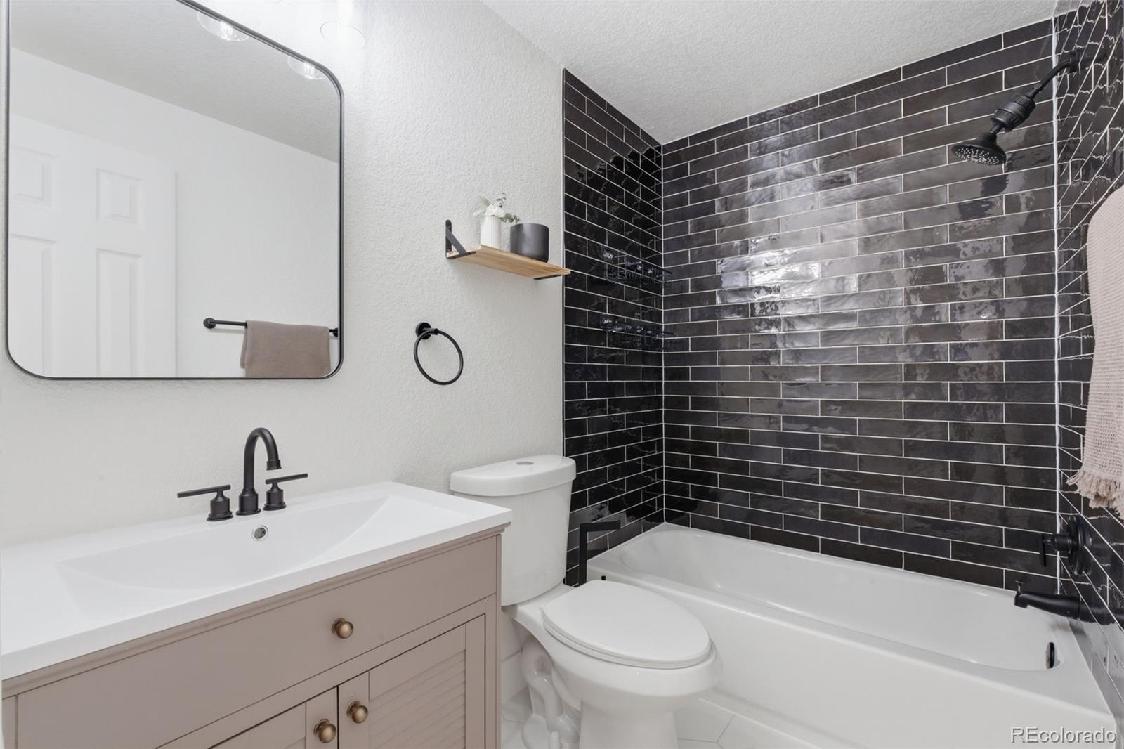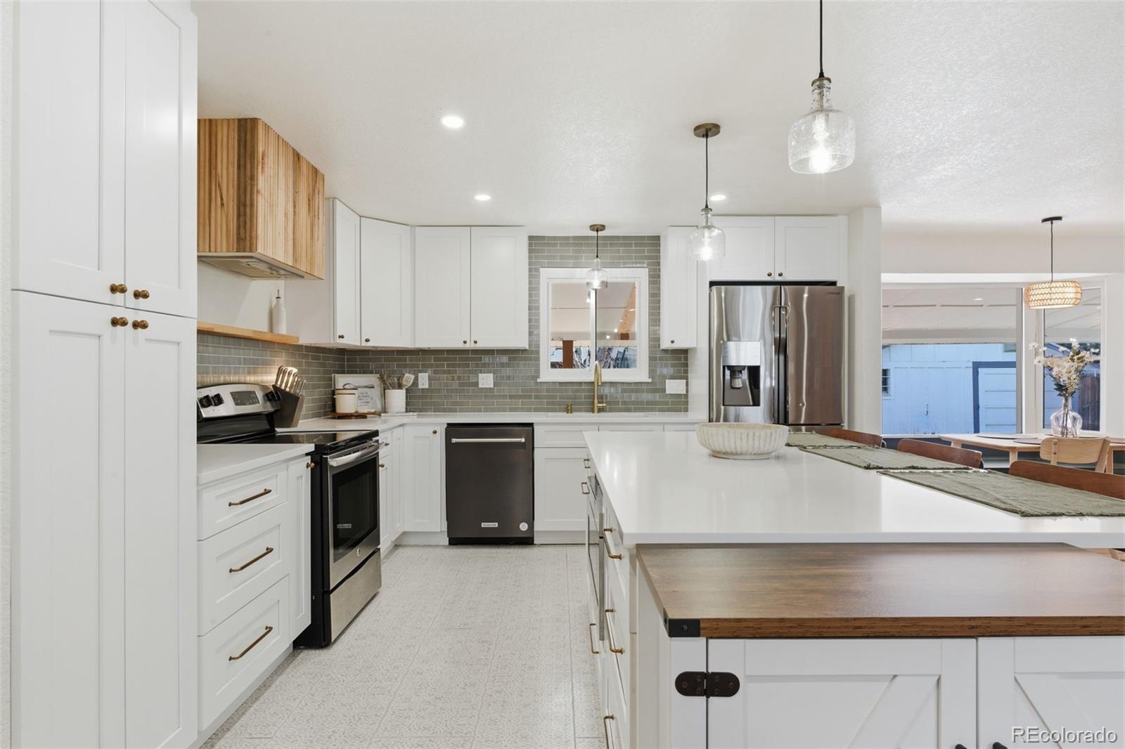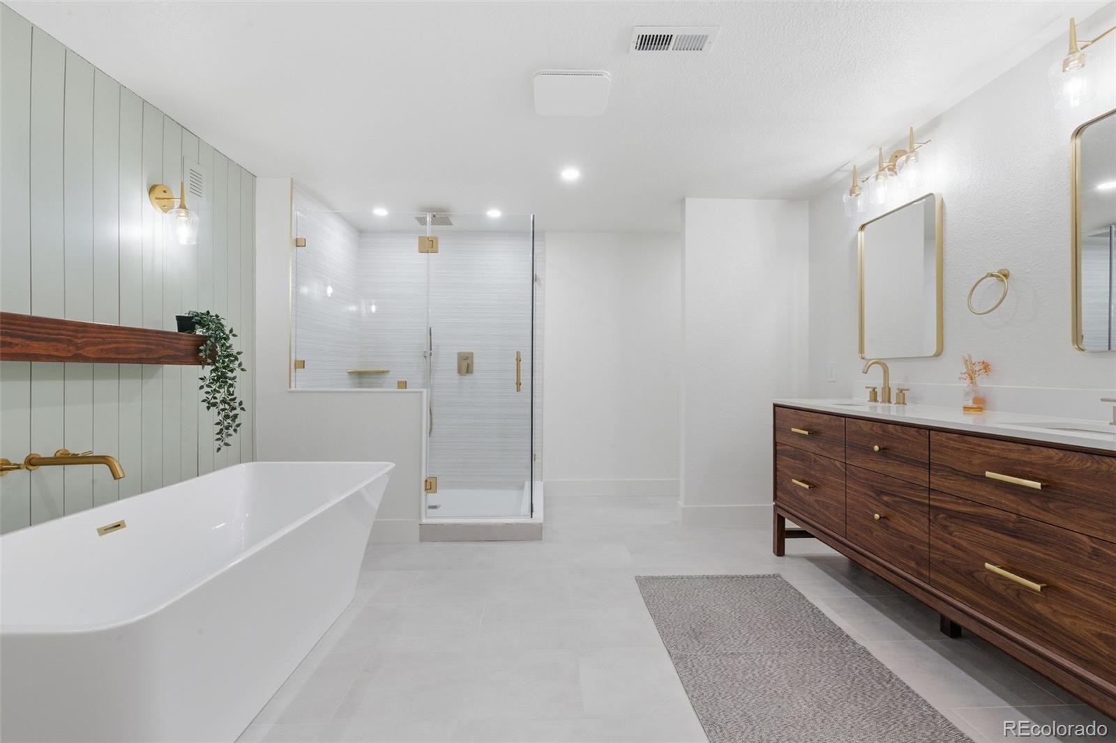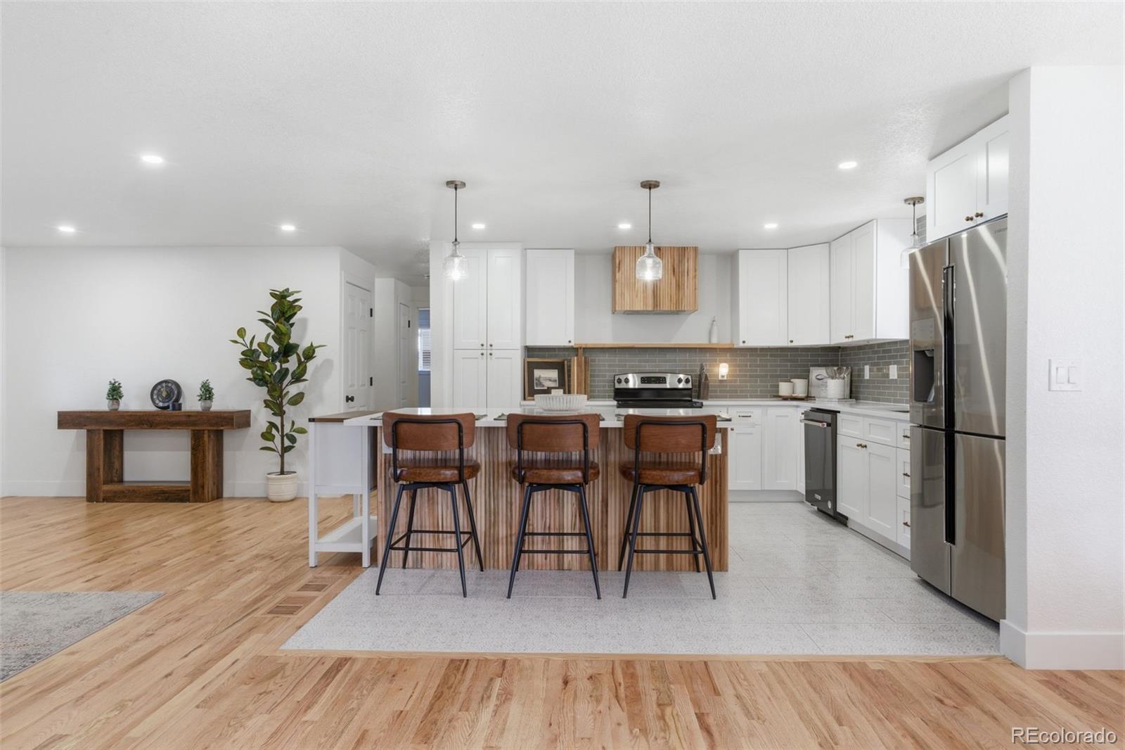 Welcome to 666 Kittredge! This completely remodeled home comes with a ton of upgrades and square footage. As you walk inside, you will be greeted with an open floor plan to the kitchen with new stainless steel appliances and new white cabinetry complimented with antique brass knobs. At the center of the kitchen you see a large island with custom grooved wood wrapping. Aside that is a spacious living room that effortlessly flows into the layout, with a fireplace and custom shiplap wall and wood accent shelf. The main floor is beautifully finished with rich white oak flooring, offering timeless warmth, durability, and an inviting foundation for everyday living and entertaining. Three bedrooms on the main level and two in the basement. All bathrooms have been completely remodeled with new vanities, tile and toilets. The primary bedroom in the basement is complimented with a 160 sqft bathroom that feels like a luxury spa. It comes with a large soaking tub and walk in shower. Come visit this beautiful home and call it yours!