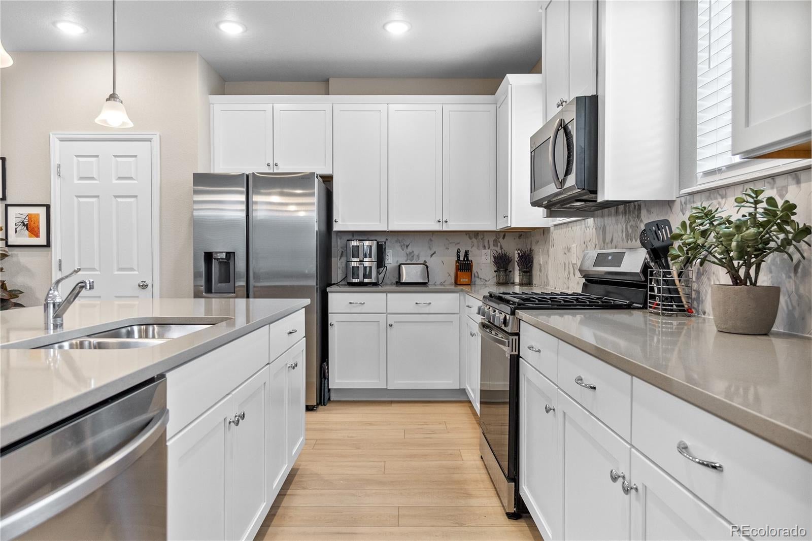 Discover modern living in this stylish two-year-old townhouse in Parker, Colorado’s sought-after Stonegate community. This modern home offers three generously sized bedrooms, three bathrooms, and an attached garage for added convenience. The garage provides extra room on the sides and features large, sturdy storage racks for extra storage space. Relax on the front porch before you step inside. Step inside the open-concept floor plan, which seamlessly connects the living, dining, and kitchen areas—perfect for entertaining or relaxing at home. The kitchen features modern finishes, abundant cabinetry, a spacious pantry, and a large center island designed for cooking and gathering. Upgraded pendant lights with dimmers enhance the atmosphere. Enjoy upgraded ceiling fans and dimmer switches throughout, adding comfort and customization to every room. Timers control the exterior front and back lights. Upstairs, a tech loft awaits. Retreat to the primary suite, which provides a peaceful space with a private en-suite bathroom and hidden medicine cabinets for added storage, blending function and style. The two secondary bedrooms share a convenient Jack and Jill bathroom, giving flexibility for guests, a home office, or hobbies. Experience the vibrant Stonegate neighborhood—head downtown to REI using the scenic Cherry Creek Trail or bike west along the C-470 path for adventure outside your door. Take part in neighborhood events like the popular Parker Days Festival, bringing entertainment to the community. With easy access to E-470 and I-25, you reach shopping, dining, and top-rated schools in minutes. Enjoy daily convenience with major grocery stores, Costco, and Whole Foods located nearby.