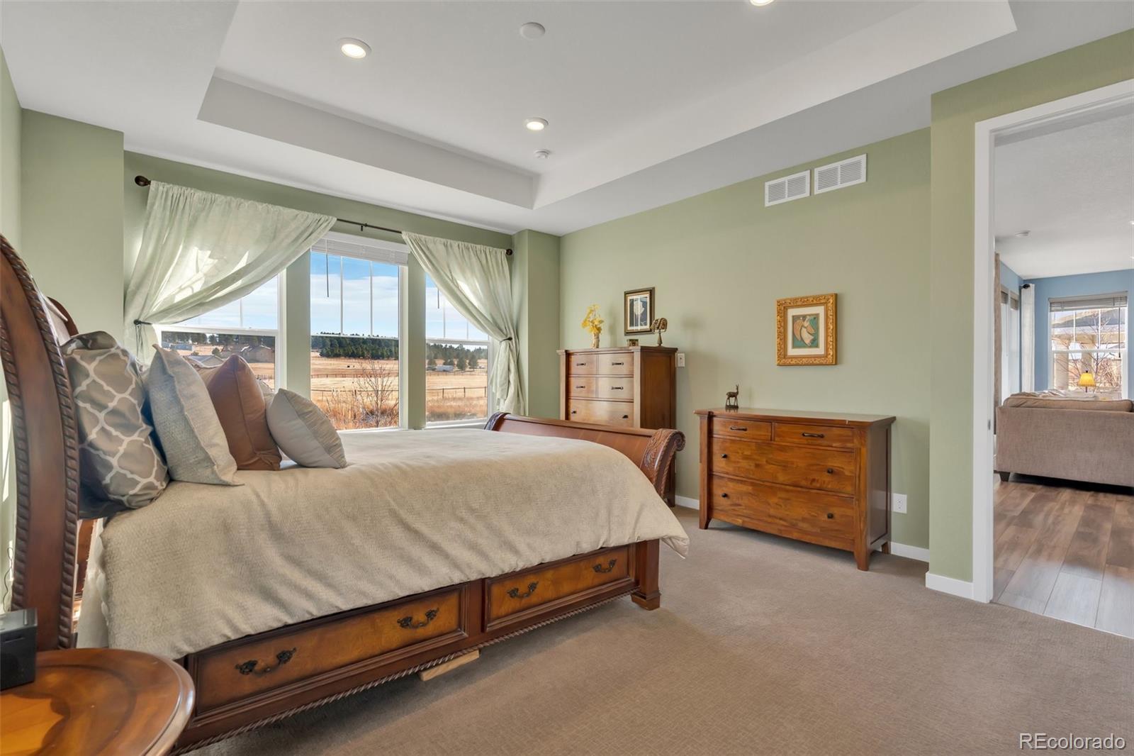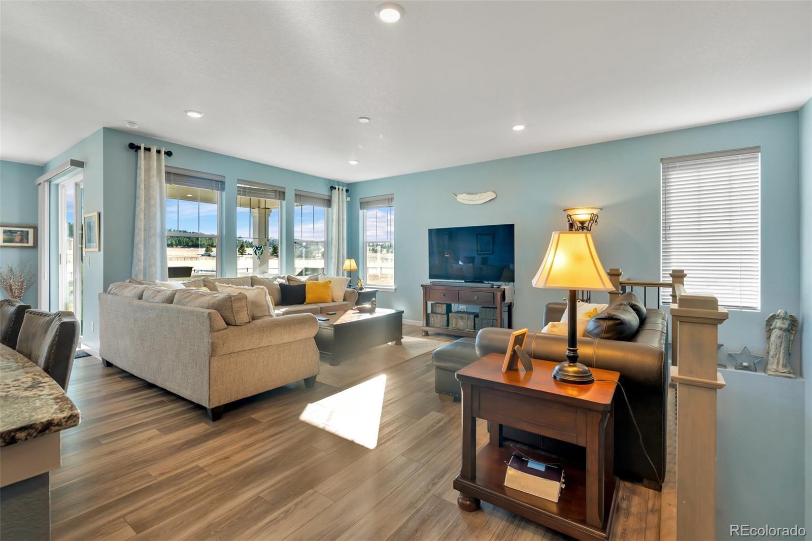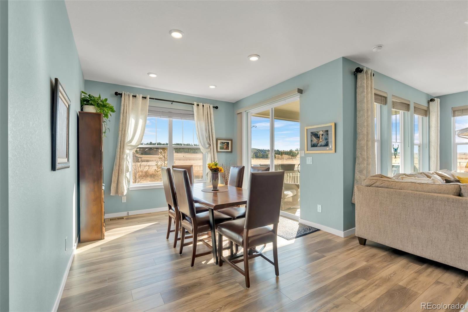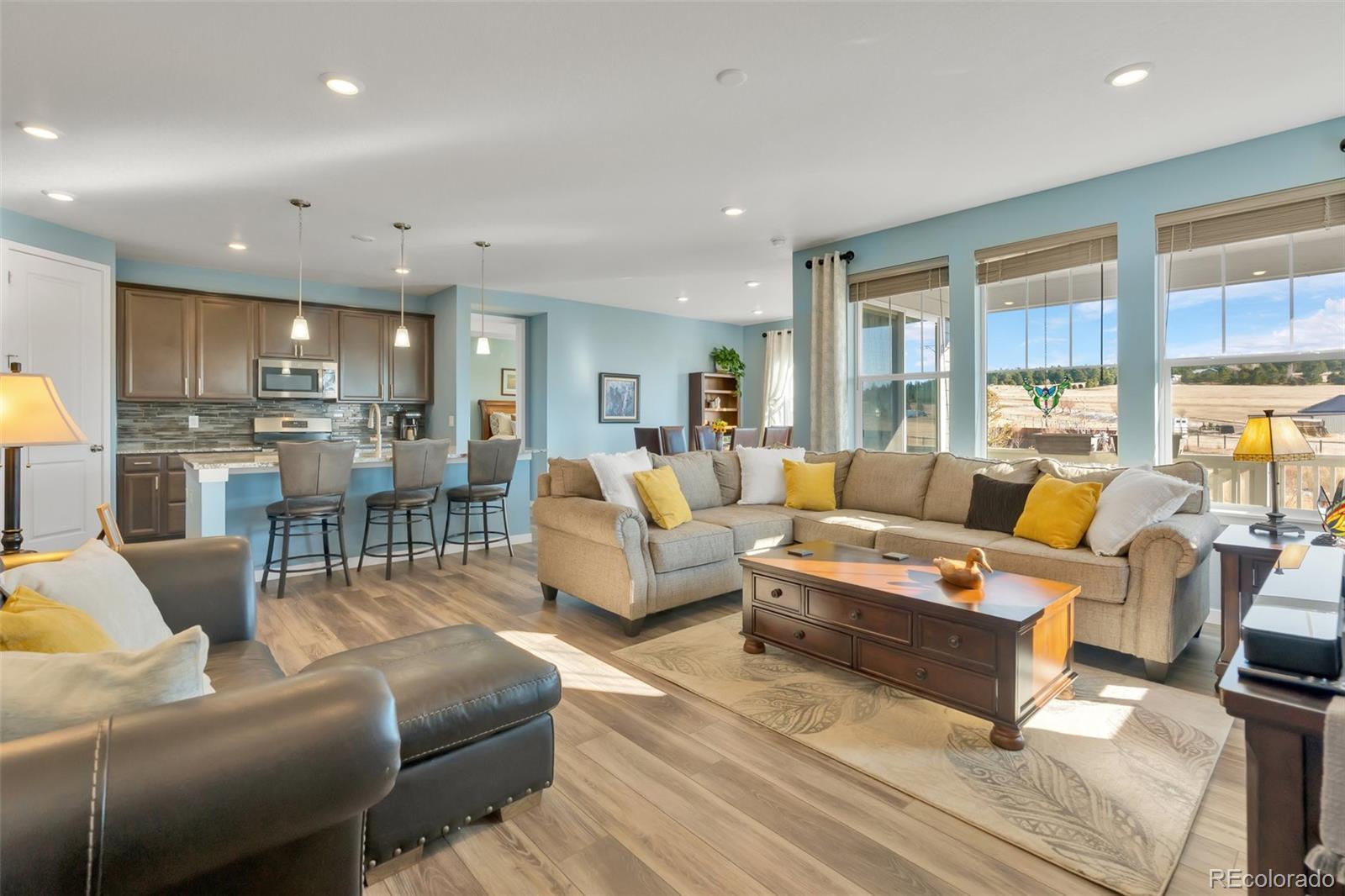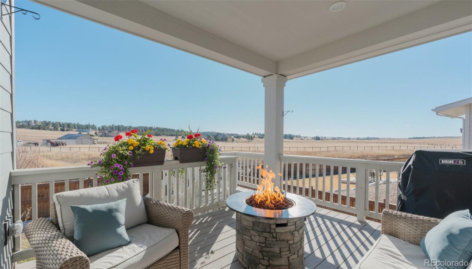 A RARE find...this beautiful RANCH-STYLE home in the charming community of Elizabeth is near-new with all the upgrades and pride of ownership you've been looking for. Welcome; this home is less than 5 years old with its original owners now selling but you'd never know it wasn't the Lennar model home because it is perfect, move in ready, clean and loaded with upgrades. Step inside for the convenience of main floor living where everything you need is on the main level but with an unfinished garden-level basement where expanding your square footage is easy. LOCATION! A perfect lot with open space in front of you, large acreages behind you and MOUNTAIN VIEWS from your covered back patio. Trails and parks abound in this cozy neighborhood, construction is done in Ritoro and you'll love this community where small-town values and safety meet modern conveniences and easy commutes into Denver or Colo Springs. The interior of this Graham Model is spacious and open concept, featuring upgraded luxury vinyl plank flooring, stunning architectural features in high ceilings and dramatic tall doors. The hub of the home is the modern kitchen featuring Maple Cabinetry done in slate to compliment the granite countertops and stainless-steel appliances. Quaint breakfast nook lends itself to a formal dining room or use it for a more casual space. HUGE primary bedroom is tucked into the quiet back corner of the house and its spa-like large bathroom is ideal in its functionality with easy step-in shower, large walk-in closet and doors for privacy. This is a "smart home" with desired wifi heat mapping, security connectivity and extreme energy efficiency. The backyard is landscaped, and the greenhouse is included; you'll note the Seller spared no expense to make this an easy keep sanctuary and wow no homes behind you looming into your space. Too much to list here, this property is a real must see. Elizabeth is great; lots to do with many amenities, fun events and a thriving downtown scene!