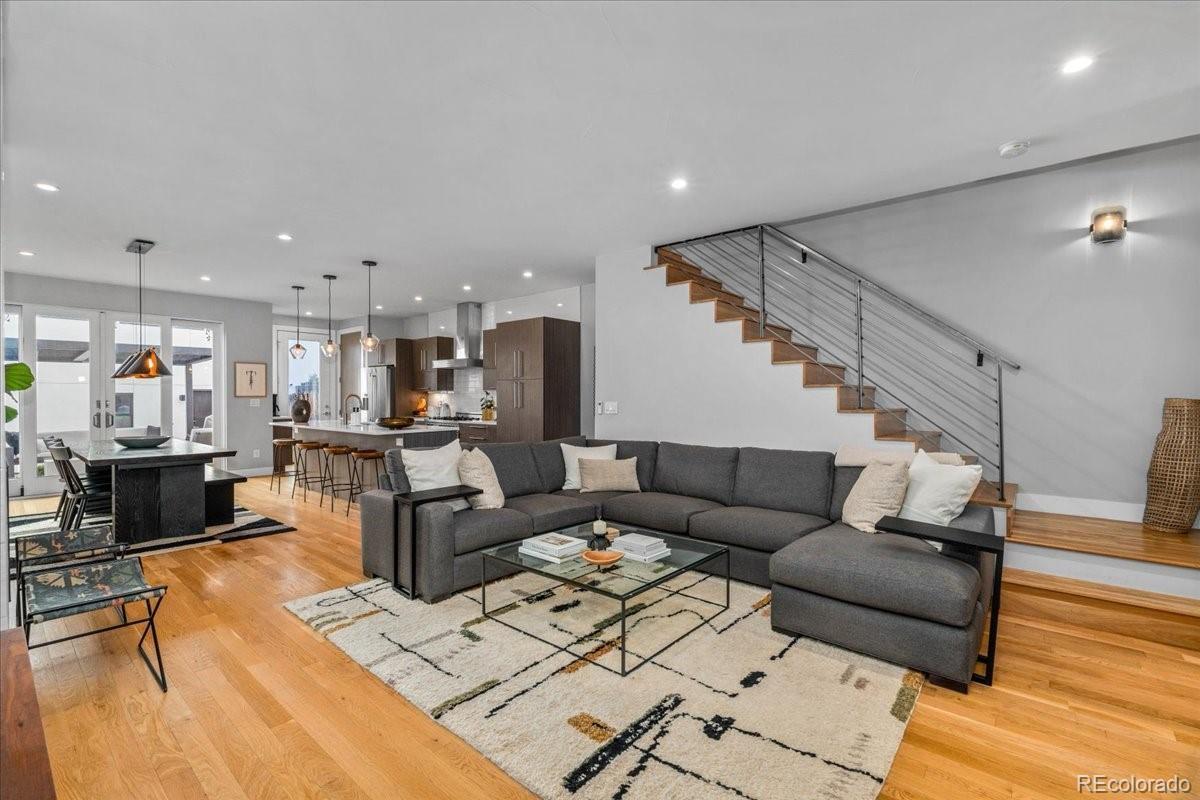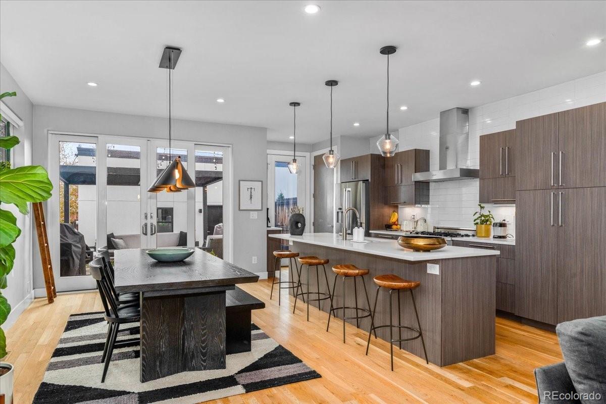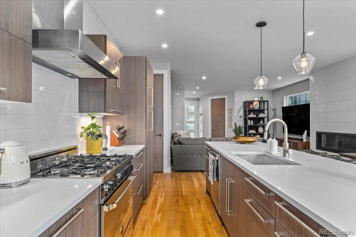 Set in one of Denver’s most sought-after neighborhoods, this beautifully maintained modern home offers a thoughtful balance of design, comfort, and walkable city living—just moments from Sloan’s Lake, Highland Square, and LoHi’s favorite restaurants, cafés, and shops. The extra-wide open floorplan is filled with natural light and designed to feel both inviting and functional. Warm hardwood floors run throughout the main level, where the living room is anchored by a sleek fireplace and framed by oversized windows. The kitchen is equally impressive, featuring expansive quartz countertops, custom cabinetry, and a high-end appliance suite highlighted by a Bertazzoni Italian 6-burner Pro Range and Bosch appliances—perfect for everyday meals or hosting friends. Upstairs, the bedroom level feels calm and private, with tall ceilings, generous windows, and beautifully finished bathrooms with modern materials and ample storage. A flexible upper level adds even more value, offering space for a home office, workout area, media room, or creative studio. From here, step out onto the rooftop patio and take in wide neighborhood views and the kind of Colorado sunsets that make evenings at home feel special. The backyard provides space to relax, entertain, or enjoy a quiet morning outdoors. Turnkey and well cared for throughout, this home combines elevated finishes, great natural light, and an unbeatable location for easy, refined urban living. With flexible living spaces, exceptional outdoor areas, and a layout that truly lives well, this home is ideal for buyers who want room to grow without sacrificing location or design. Enjoy quick access to downtown, nearby trails, and some of Denver’s best dining—all while coming home to a space that feels private, and comfortable.