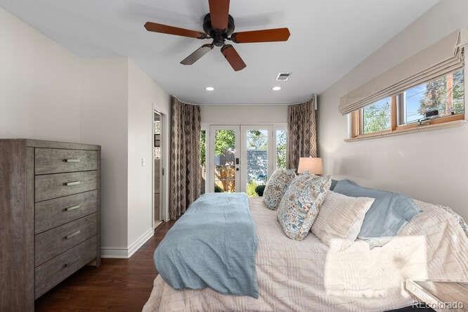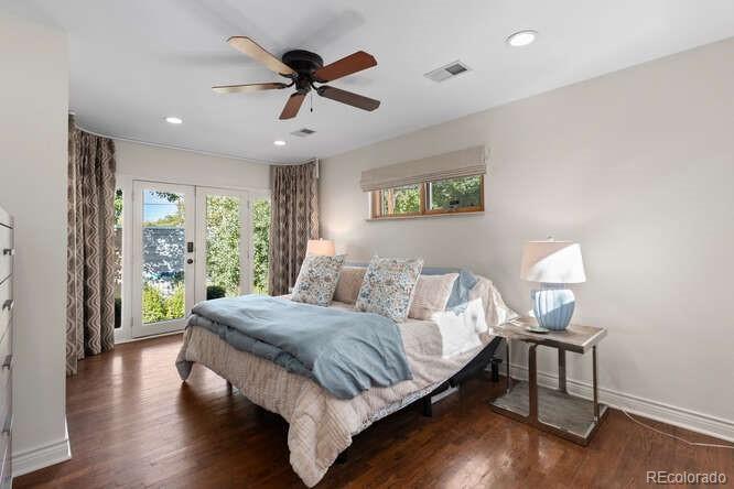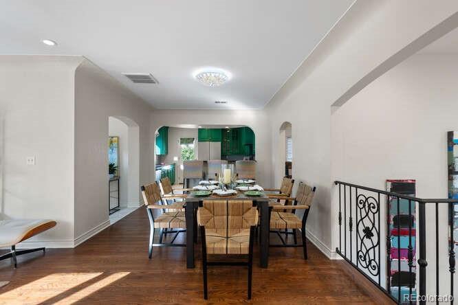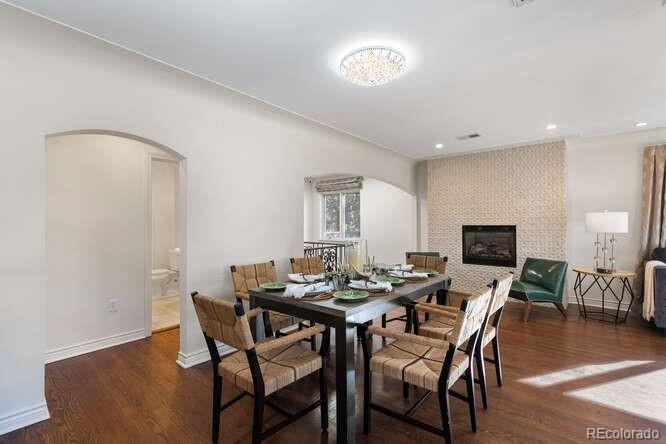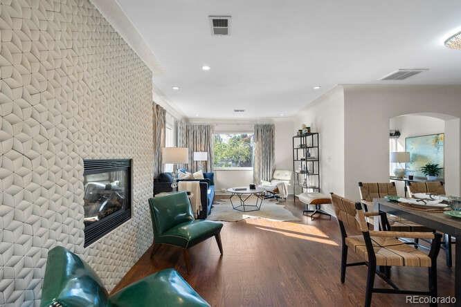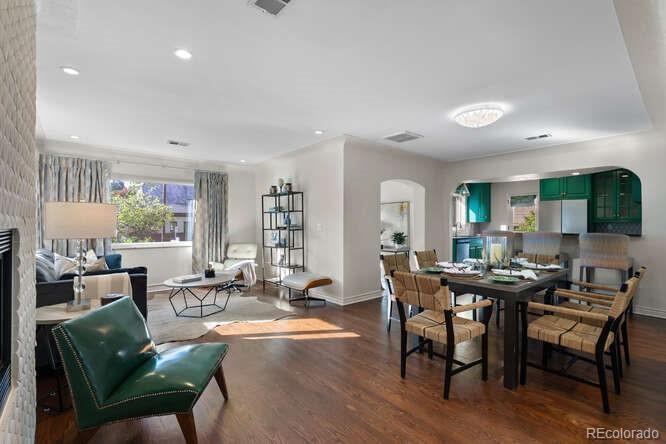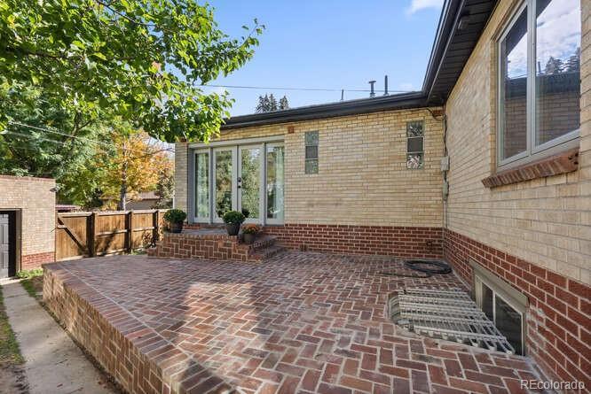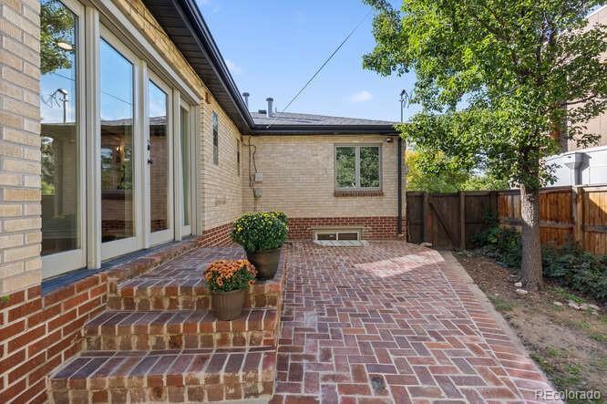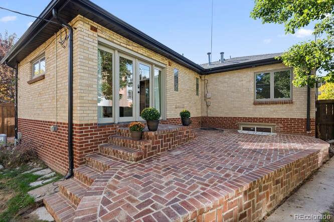 Hollywood Hills style meets Denver charm in coveted Bonnie Brae. Step into this 1950's south-facing brick bungalow, reimagined with chic, modern sensibility and drenched with natural light. A striking geometric black-tiled foyer opens to an airy main floor where living, dining, and kitchen flow seamlessly - perfect for entertaining or everyday ease. The emerald green chef's kitchen wows with abundant cabinetry, stainless steel appliances, brass hardware, and bar seating that keeps the cook connected to the conversation. A tiled gas fireplace anchors the open dining and living space, creating a warm, stylish gathering spot. The main-floor primary suite features French doors to a newly elevated brick patio - ideal for morning coffee or evening wine. Two large closets and a luxe ensuite with double vanity and walk-in shower. A second bedroom (or office) and full bath complete the main level. Downstairs, a sculptural wrought-iron baluster leads to a bright, inviting lower level with a cozy den, third bedroom, and a stunning white marble bath with soaking tub and walk-in shower. Set among multi-million-dollar homes, this property blends timeless character with modern upgrades: newer roof, fixtures, recessed lighting, custom draperies, sprinkler system, security, AC, fresh paint, and fencing. Perfectly situated - walk to Bonnie Brae Ice Cream, shops, and cafes; minutes to Cherry Creek North, Wash Park, and the charming Old Gaylord shopping district. This is effortless Denver living with a Hollywood Hills vibe.