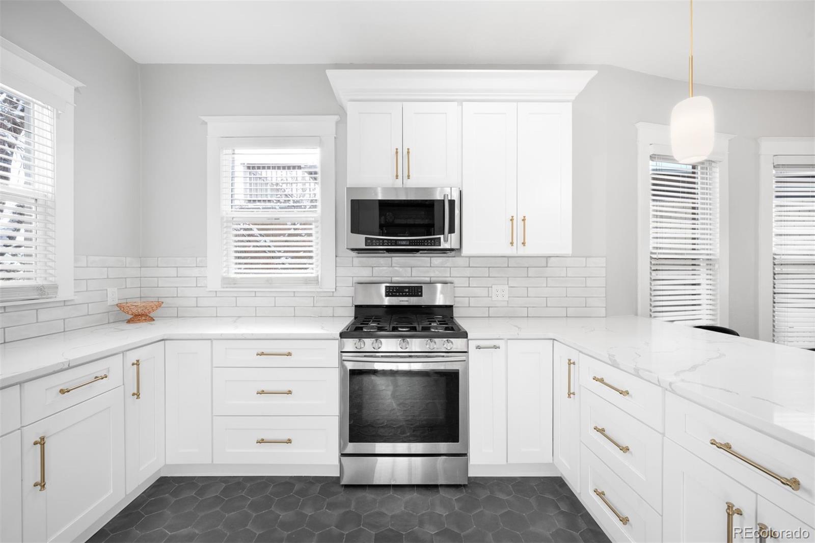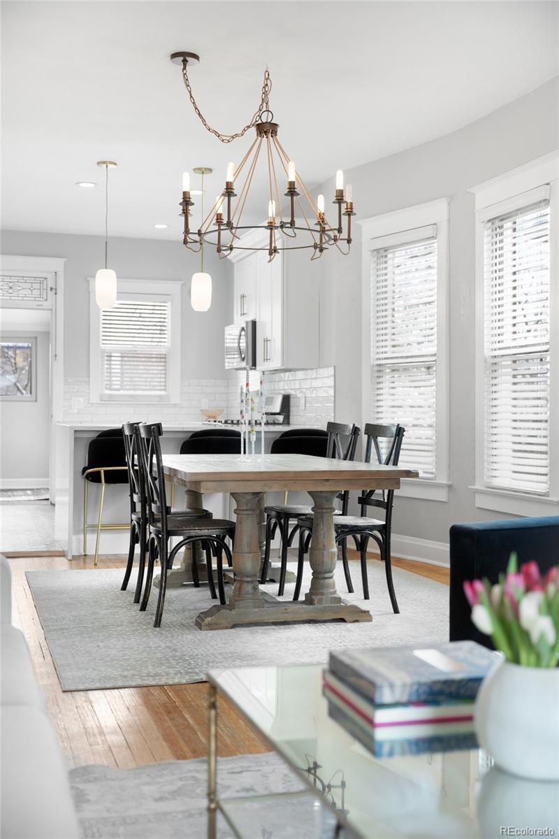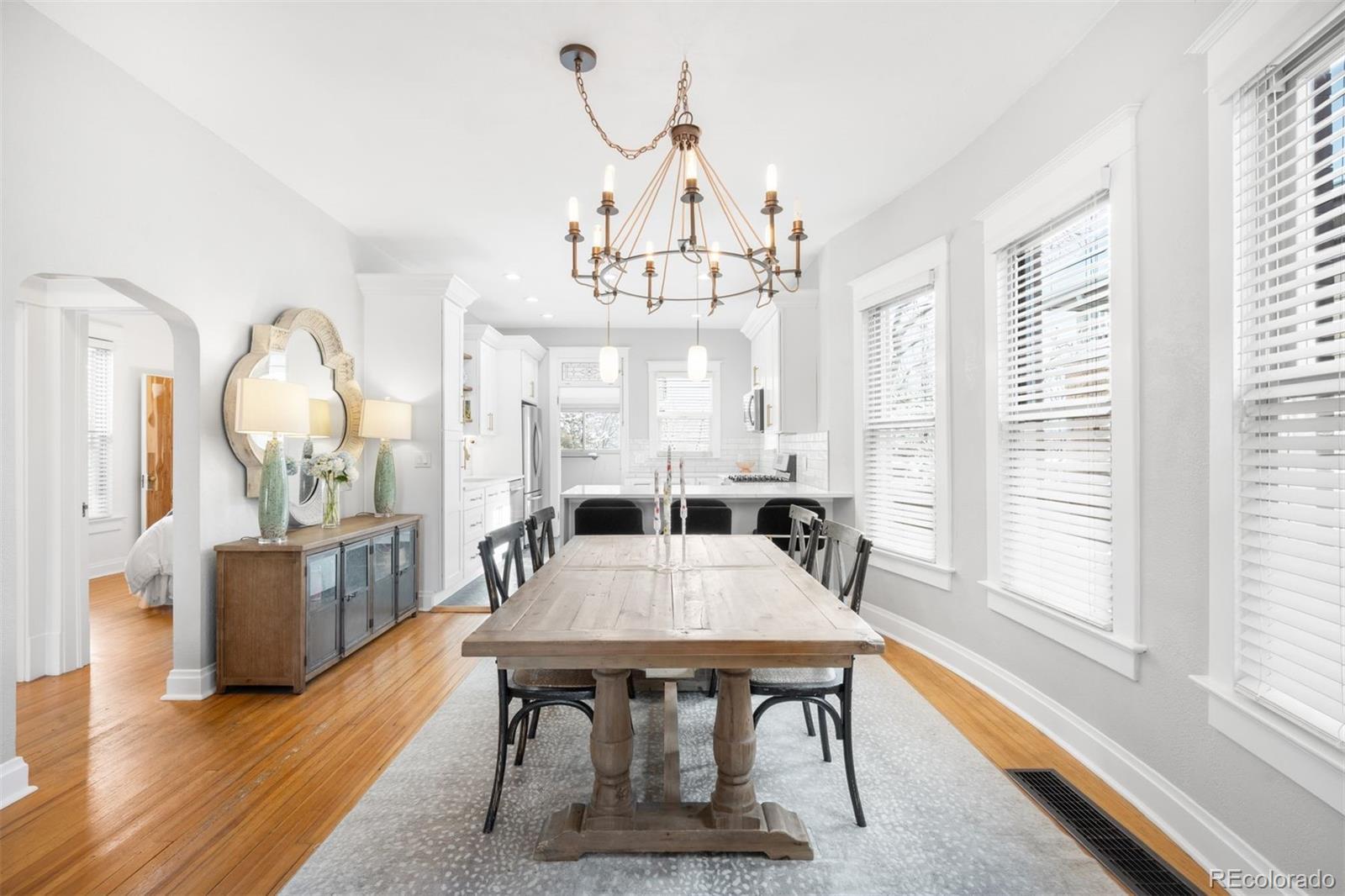 Discover this beautifully updated bungalow in Denver’s highly sought-after Highlands neighborhood. Just four blocks from Highlands Square, this 3-bedroom, 2-bath home blends classic character with modern upgrades, offering a truly turnkey experience. Inside, a bright, open layout showcases 12-foot ceilings and original hardwood floors throughout. The living room, dining area, and kitchen flow seamlessly, creating an ideal space for entertaining. The remodeled kitchen (2022) features quartz countertops, ample cabinetry, and Samsung appliances. Two main-level bedrooms share a thoughtfully remodeled full bathroom, while both bathrooms have been updated to reflect a fresh, cohesive design that complements the home's original charm. The finished basement provides flexible living space-perfect for a second living area or a non-conforming third bedroom-with an adjacent three-quarter bath and laundry closet. Outdoors, a welcoming front porch adds timeless appeal, while the fully fenced backyard and elevated deck offer the perfect setting for summer evenings. A parking pad adds everyday convenience in this highly walkable location, close to beloved restaurants, boutiques, coffee shops, fitness studios, and parks.