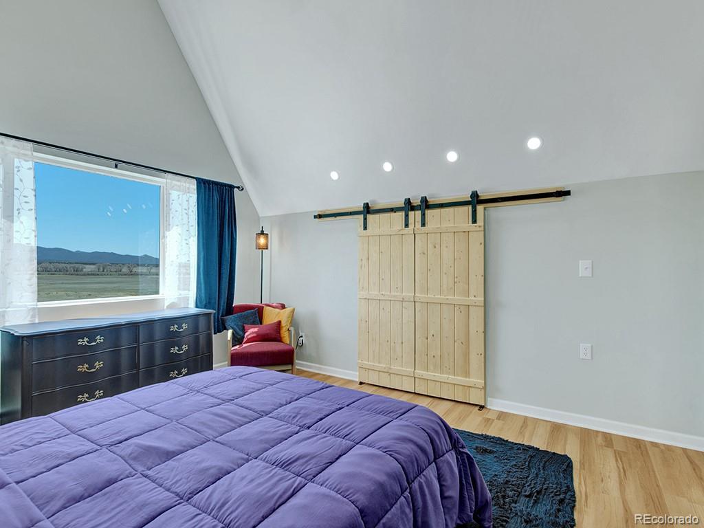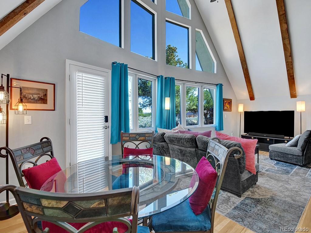 Newly remodeled, fully-furnished mountain retreat, perfectly positioned to capture breathtaking views of the Sangre de Cristo Mountains and Mountain Home Reservoir! This immaculate home offers comfort amongst many modern updates, making it a truly unique and exciting property. Airbnb-ready functionality means the home is ideal as a primary residence, vacation home, or income property. The main level features two bedrooms and one full bathroom. The upper level offers a loft space for an office or sitting area, plus one bedroom and one full bath. High ceilings and large double-pane windows fill the home with natural light, complemented by a cozy wood-burning stone fireplace. The kitchen is on the main level and is stocked and ready, with modern appliances and incredible views of the water from the sink. Electric heat runs throughout the home with individual thermostats in each bedroom. Nearly all plumbing has been updated to copper, and lines are protected with a heating wire on a thermostat. The basement has the laundry room with a new water heater, well pressure tank, washer and dryer; plus it's a finished space with a sink, wine fridge, half bath, closet space, windows, and concrete floors. The detached two-car garage is 20x18 and has a concrete floor and exterior access. A private studio ADU is accessed via a breezeway from the upper level, which has a gated staircase down to the ground level. The ADU features a full kitchen, brand-new water heater, full bath, and a composite deck balcony with sweeping views—ideal for guests or rental income. The 1,250-gallon septic tank was replaced four years ago; a new leach field was installed in 2025. Weekly trash pickup is available, and the home includes high-speed fiber optic internet, Simplisafe alarm system, Blink cameras, and a one-year home warranty credit at closing. The home gym and all furnishings, including TVs and a fully stocked kitchen, are included if the buyer desires. This is a rare opportunity. Call today!