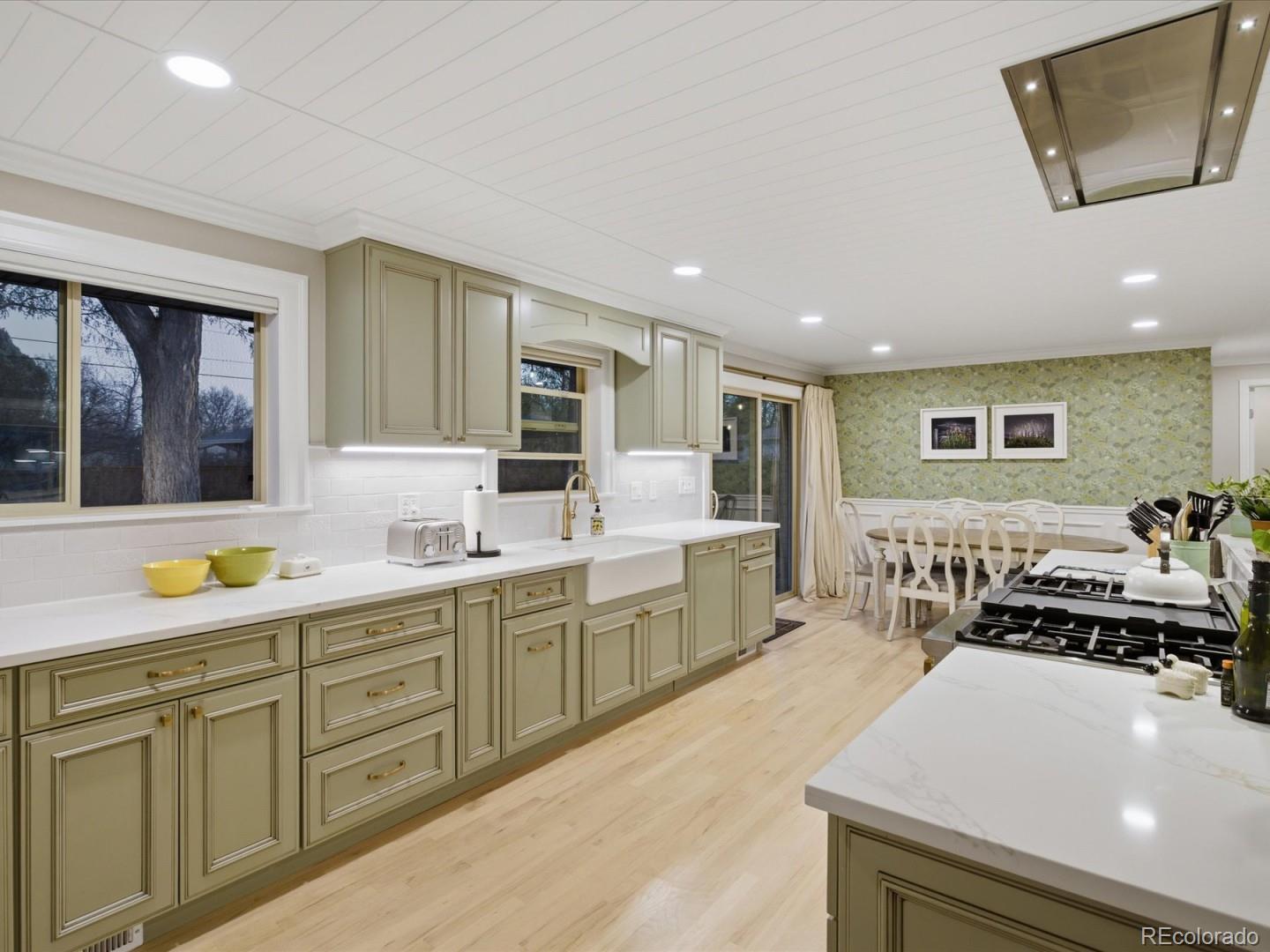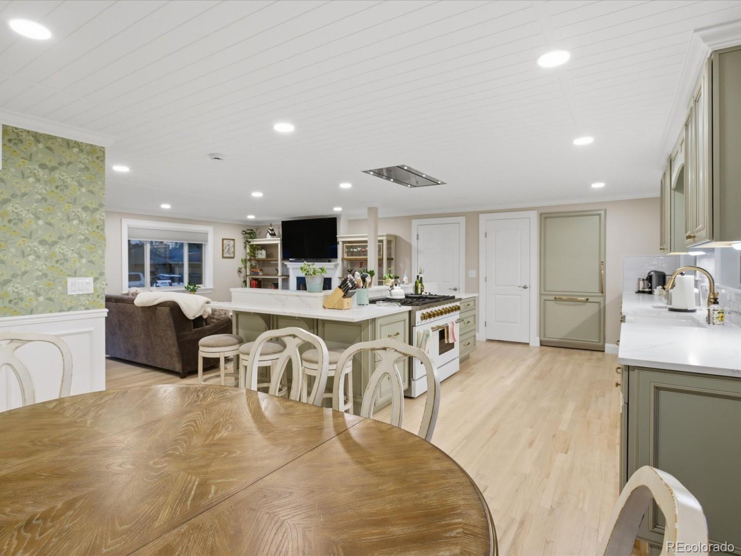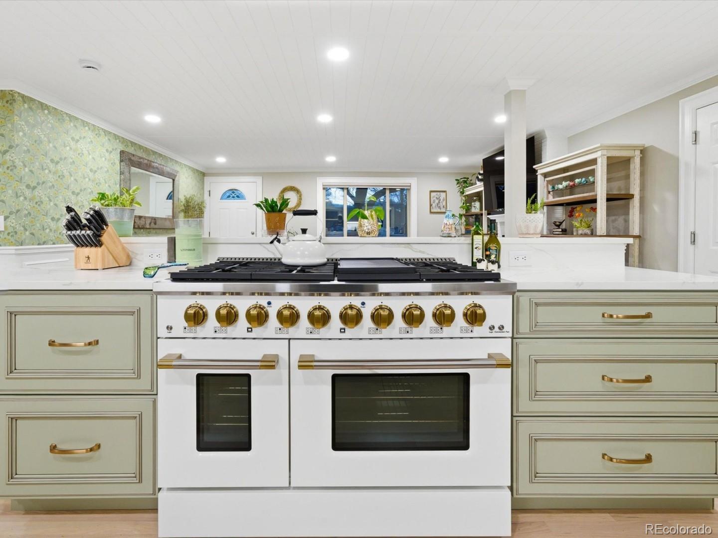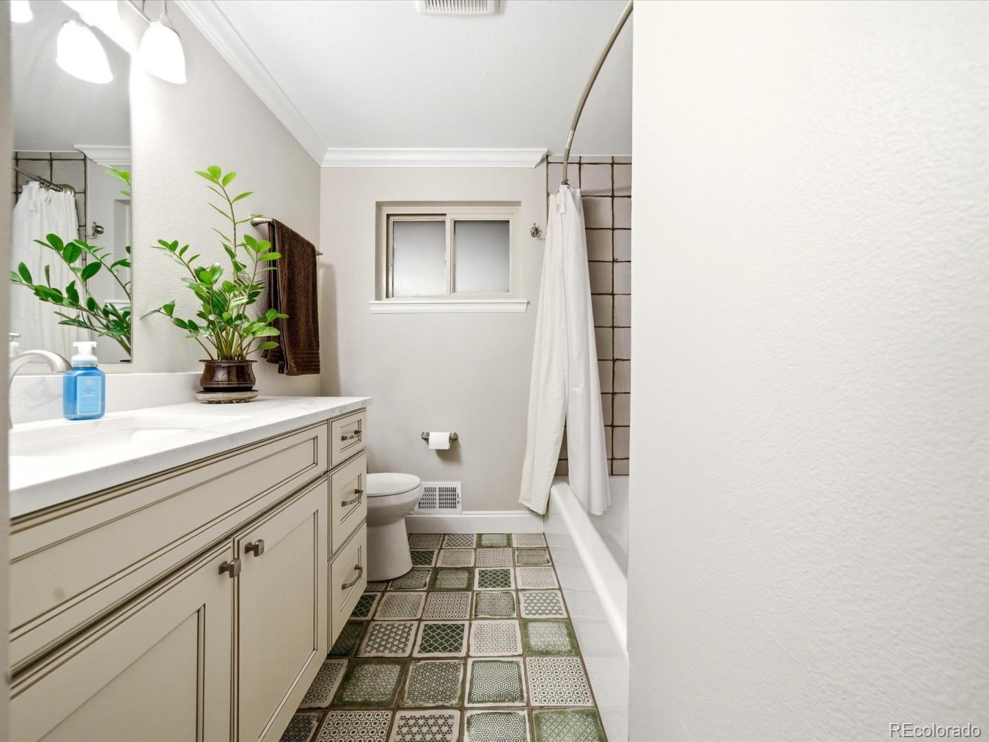 English cottage and contemporary comforts perfectly blended for a timeless modern charm. Renovation completed in winter of 2023. Original oak flooring all throughout the main level. Crown molding and bead board ceiling on main level. High end appliances covered by custom cabinet panels stainless cliché. Adorable custom kitchen cabinets with brass fixtures and cabinet pulls. Gas stove offers two ovens with 8 burners and griddle. Kitchen is perfect for foodie gourmet to entertain in the open design. The full house water treatment system delivers safe, clean drinking water and ensures showers are gentle on the skin, while also preventing mineral stains on glass and fixtures. The finished basement includes two conforming bedrooms and a new three-quarter bathroom and an office or non-conforming bedroom and a large family room (the big TV in basement will stay with home). New roof in spring of 2024. New electrical panel during renovation. Master bath has radiant floor heating. The Security Camera System and Ring Camera are perfect for lock and leave for traveling retirees. Travel trailer and RV parking. Hard wired ethernet all throughout the house. T1 speed currently provided by Quantum. New turf lawn on large lot with four amazing mature trees that provide plenty of shade in the summer. Sprinkler system plus a drip for backyard bushes and front yard roses. Spacious patio ideal for sunrise breakfasts and shaded summer afternoons, featuring landscape lighting and string lights for pleasant Colorado evenings. Includes a natural gas stub and electrical for a future outdoor kitchen. The Highline Canal, parks, trails and Gaslin brand-new elementary school are very close. This residence offers a refined and inviting atmosphere. Prospective buyers will appreciate its thoughtful design and comfort.