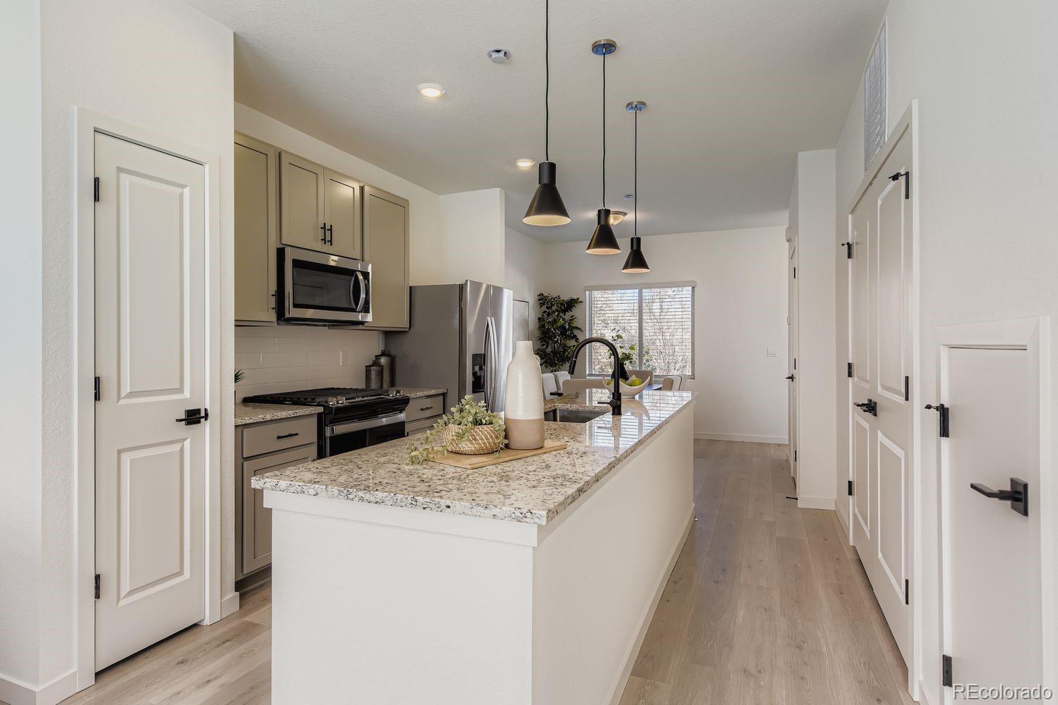 Move-in ready, modern living in Arvada’s sought-after GEOS community — where style meets convenience! Rare Reihenhaus plan with a fenced backyard, guest parking nearby, and a prime, private location in the neighborhood. Welcome to 15172 W 69th Place, a beautifully designed 2-bedroom, 2.5-bath townhome featuring the desirable Reihenhaus plan. Nestled in a quiet, private pocket of the GEOS community with ample guest parking just steps away, this home offers both comfort and connectivity. The bright, open-concept main level is perfect for everyday living and entertaining, seamlessly connecting the Great Room, Dining Area, and Kitchen. The upgraded kitchen shines with Whirlpool stainless steel appliances (including gas range), light gray soft-close cabinetry, and a spacious 10’ island topped with Denali Quartz—ideal for gathering, meal prep, or casual dining. A convenient powder bath completes the first floor. Upstairs, the South-facing primary suite is flooded with natural light and features a private en-suite bath. The well-sized secondary bedroom sits just down the hall from a full bathroom, making it perfect for guests, a roommate, or a home office. A thoughtfully placed second-floor laundry room adds everyday ease. Step outside to your fenced-in backyard—great for pets, outdoor dining, or relaxing evenings. With its modern finishes, functional layout, and fantastic location within GEOS, this home is a standout opportunity in Arvada. Don’t miss it!