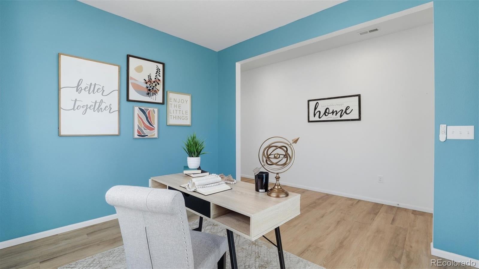 BETTER THAN NEW, this stunning 3BR/3BA, 2-story home is located in the popular community of The Trails at Aspen Ridge. Situated on a low-maintenance xeriscaped lot, the covered front porch is the perfect spot to enjoy Colorado’s abundant sunshine. Inside, you’ll find a contemporary open floor plan filled w/ natural light & modern finishes throughout. The main level features LVP flooring, stylish light fixtures, & numerous windows complete w/ window treatments. Central air & heat provide year-round comfort, & 2,198 sf of well-designed living space makes this home ideal for entertaining. Upon entry, you’re welcomed by a versatile home office or sitting area, along w/ a convenient powder bath featuring a pedestal sink. The light & bright great room overlooks the backyard & flows seamlessly into the dining area & kitchen. The dining space incl a sliding door that opens to the fenced backyard, blending indoor & outdoor living. The beautiful island kitchen offers white cabinetry, quartz countertops, pendant lighting, a breakfast bar, & large pantry. Appliances incl a dishwasher, gas range oven, & built-in microwave. Upstairs, you’ll find a laundry room w/ built-in cabinets, a spacious loft w/ mountain views, 3BRS w/ walk-in closets, & 2BAs. The primary suite is a private retreat featuring mountain views & a spa-like bathroom w/ dual-sink vanity, mirror, & enclosed tiled shower. 2 addtl BRs share a full BA w/ vanity, mirror, & tiled tub/shower. Addtl highlights incl a 2-car garage w/ door opener & a level, fenced backyard that is ready for your personal finishing touches. Living in The Trails at Aspen Ridge means enjoying a spacious central park complete w/ playground, pavilions, & walking/biking trails. You'll appreciate the easy commute to Peterson Space Force Base & convenient access to shopping, dining, & nearby outdoor recreation areas such as Bluestem Prairie Open Space & Fountain Creek Regional Park. This MOVE-IN READY home is ready for you to make it your own!