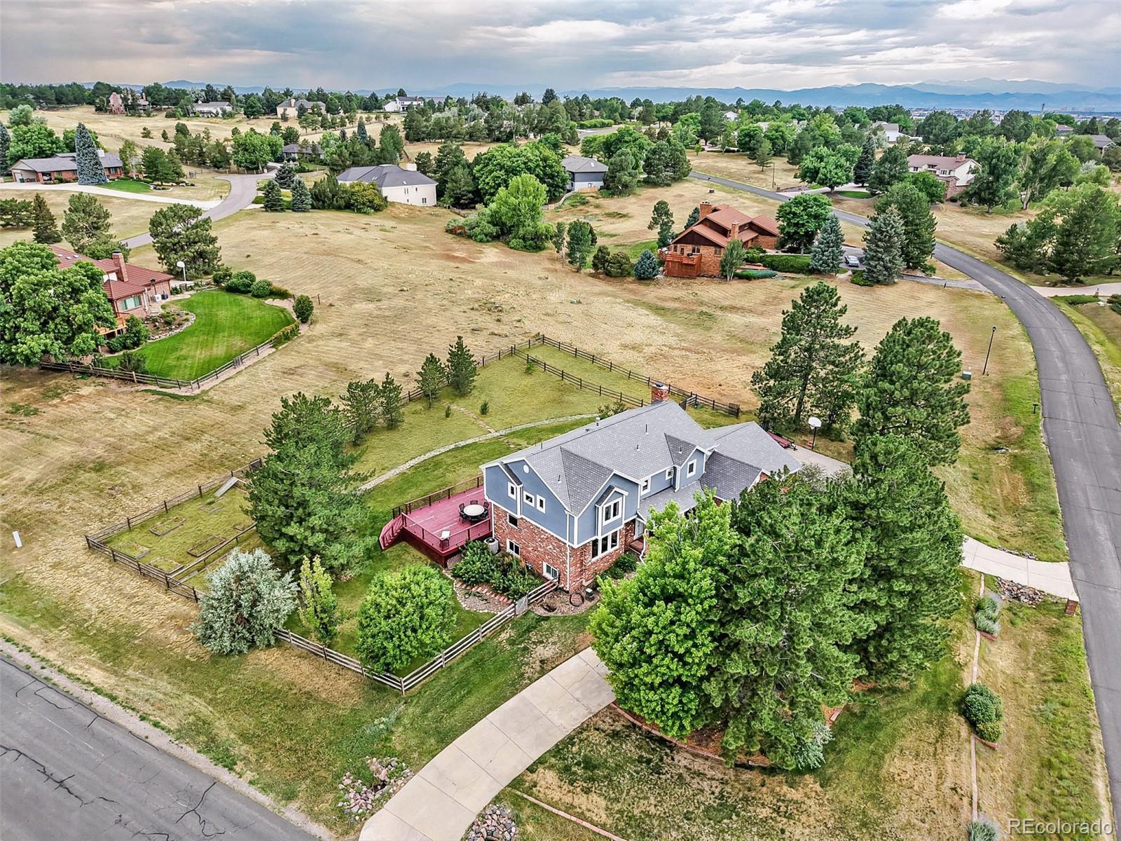 Discover the perfect balance of space, privacy, and Colorado convenience in this beautiful 5-bedroom, 5-bath home in the highly sought-after Chapparal community. Set on a 1.28-acre landscaped lot, this residence offers over 5,000 square feet of thoughtfully designed living space surrounded by mature trees and open sky. Recently refreshed with new interior paint, it blends timeless elegance with modern comfort in one of the most desirable neighborhoods within the Cherry Creek School District. Inside, Brazilian cherry hardwood floors flow throughout the main level, adding warmth and sophistication. The inviting living room features a wood-burning fireplace framed by built-ins, while the chef’s kitchen showcases stainless steel appliances, granite countertops, a large island, and abundant cabinetry. A light-filled sunroom opens directly to a spacious deck with a hot tub, perfect for dining, relaxing, or enjoying beautiful Colorado sunsets. Upstairs, four bedrooms sit on one level, including a luxurious primary suite with a five-piece bath and walk-in closet. The finished basement offers flexible space for a home gym, rec room, or media area adapting easily to your lifestyle. The oversized finished three-car garage includes a fourth bay with a dedicated door, ideal for lawn equipment, bikes, or recreational gear, while the large driveway provides functionality and ample guest parking. Enjoy community amenities including a private pool, tennis courts, and pickleball, all just 1 minute from the home. Despite its peaceful acreage setting, you’re only minutes from Southlands Mall, Arapahoe Crossing, Cornerstar, grocery stores, dining, and entertainment, with easy highway access for commuting. Located in the top-rated Cherry Creek School District, with an HOA of only $88 per year, this property delivers exceptional value. Don’t miss this rare opportunity to experience Colorado acreage living with privacy, convenience, and timeless charm in Chapparal.