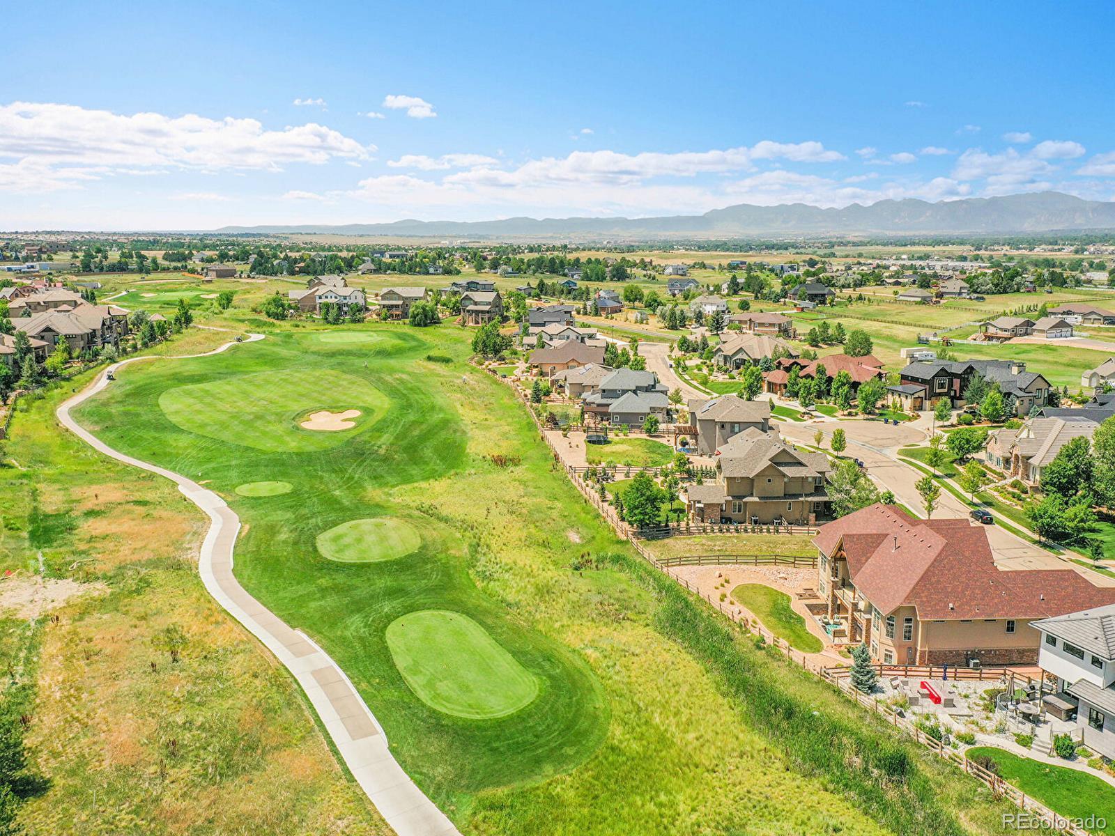 Welcome to 2131 Drive Lane, a masterfully crafted custom ranch home nestled within the exclusive Enclave at Vista Ridge. Perched on the 4th tee box of the Colorado National Golf Course, this residence was thoughtfully designed to capture panoramic views in every direction—from tranquil horse ranches and pristine fairways to breathtaking, unobstructed mountain vistas. Step into a grand, sun-drenched living room where expansive windows invite the outdoors in, setting a dramatic backdrop to the refined interiors. A dual-sided fireplace anchors both the elegant living space and the warm, inviting family room—perfectly adjoining the chef’s kitchen, which features a generous center island, charming breakfast nook, and a spacious walk-in pantry. The luxurious primary suite is a true retreat, complete with its own fireplace, an intimate reading nook, and a lavish 5-piece bath boasting dual vanities, a jetted soaking tub, and two walk-in closets. A second main-level bedroom—ideal as a guest room or office—offers serene mountain views and opens onto a private front patio. The expansive, walk-out basement is ideal for multi-generational living, with a stylish kitchenette, three additional bedrooms and three bathrooms. A flexible bonus space offers endless possibilities for a gym, studio, or additional office. Enjoy seamless indoor-outdoor living with two covered patios that invite alfresco dining and sunset lounging. Don't miss the vintage golf cart, included with the property! Located in the vibrant Vista Ridge community, you'll have access to premier amenities including a pool, clubhouse, scenic trails, and lush parks.